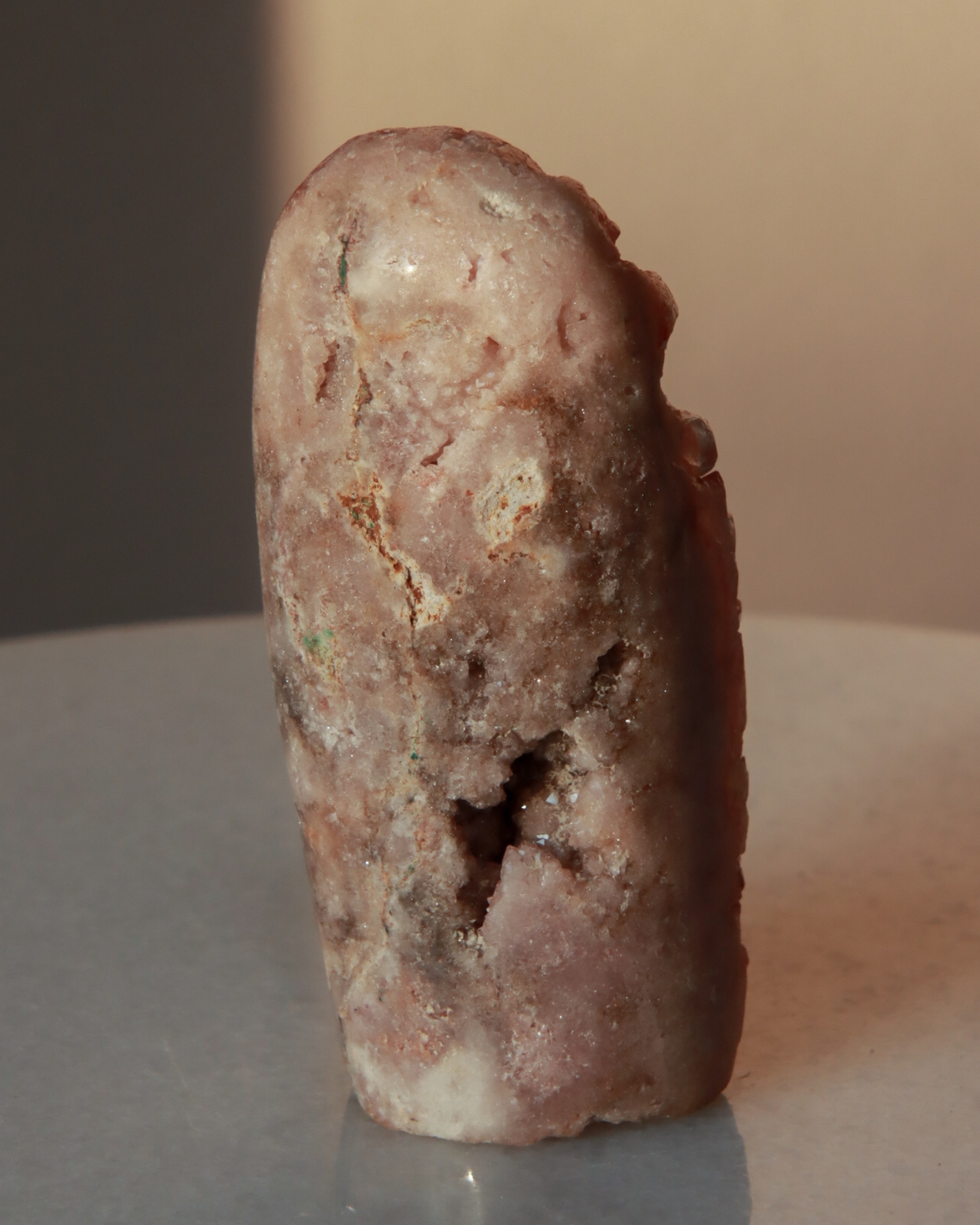 A pink amethyst freeform with a strikingly clear red crystal geode. Perfect for your collection or as a unique decor piece.