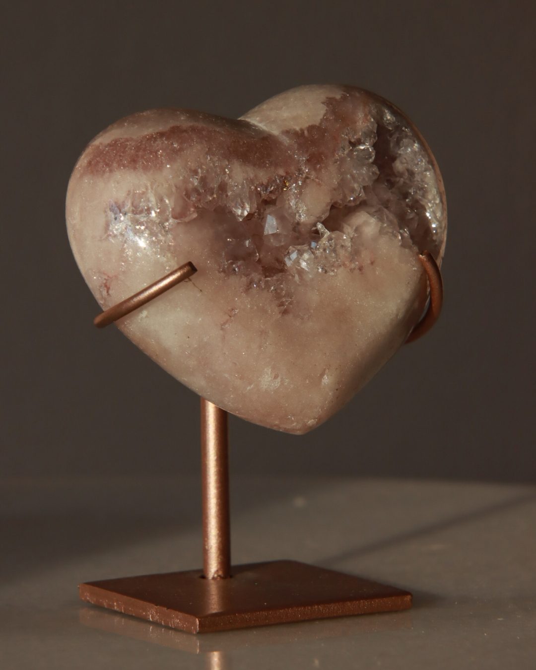 Very unique pink amethyst heart on a stand, featuring soft pink hues and a crystal geode.