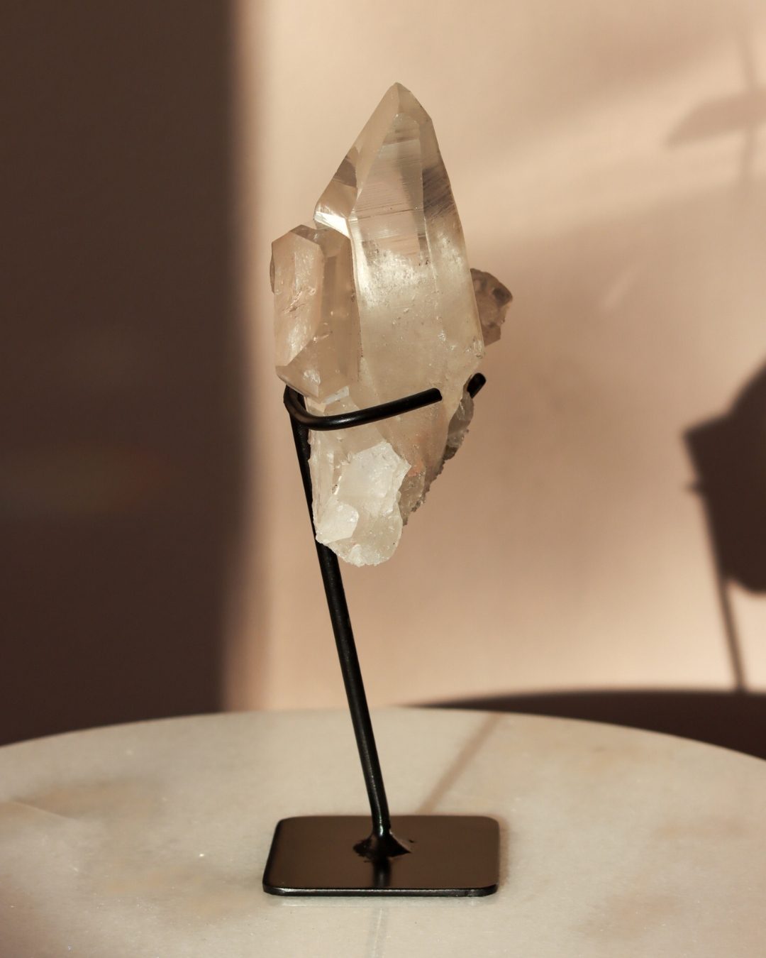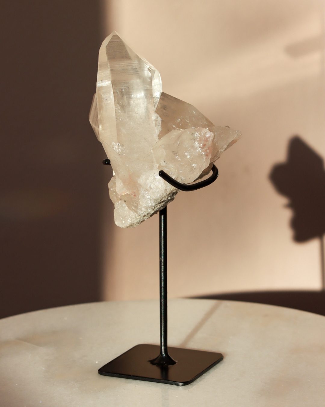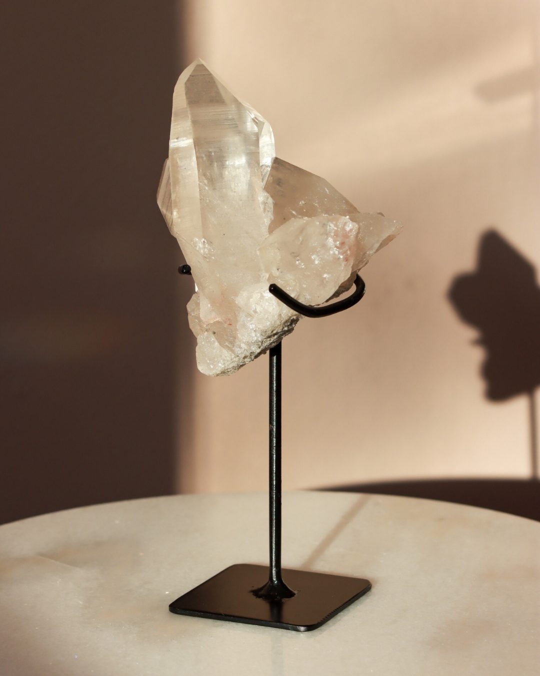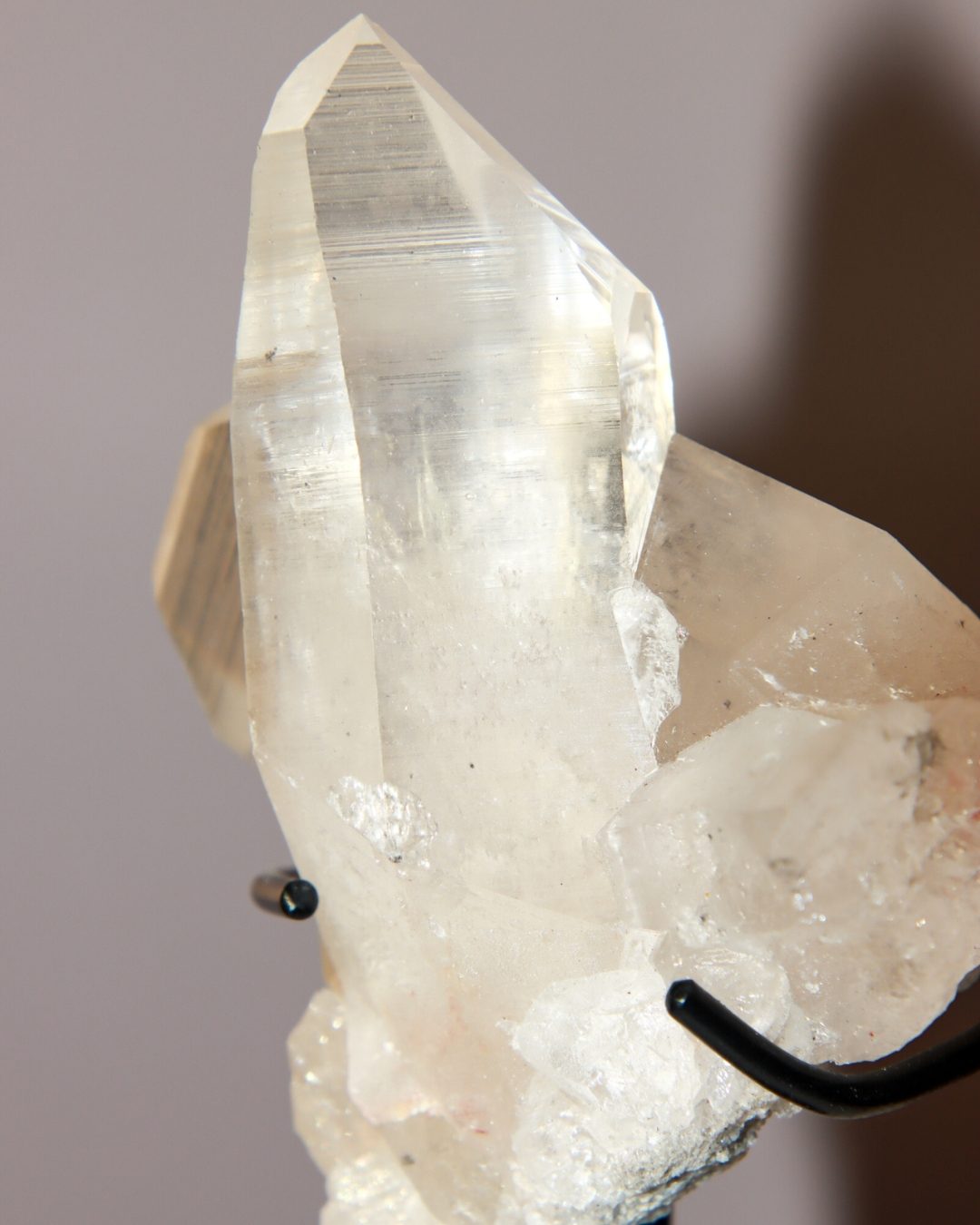 Deze bergkristal heeft een opvallende natuurlijke formatie waarbij een prominente punt uit de ruwe matrixbasis tevoorschijn komt. De punt vertoont fascinerende strepen – natuurlijke groeilijnen die het verhaal vertellen van zijn vorming diep in de aarde. Deze lijnen vangen het licht prachtig en geven het kristal diepte en karakter. Het contrast tussen de gepolijste punt en de ruwe matrix creëert een aantrekkelijk pronkstuk dat zowel de verfijnde als de ruwe schoonheid van bergkristal laat zien.