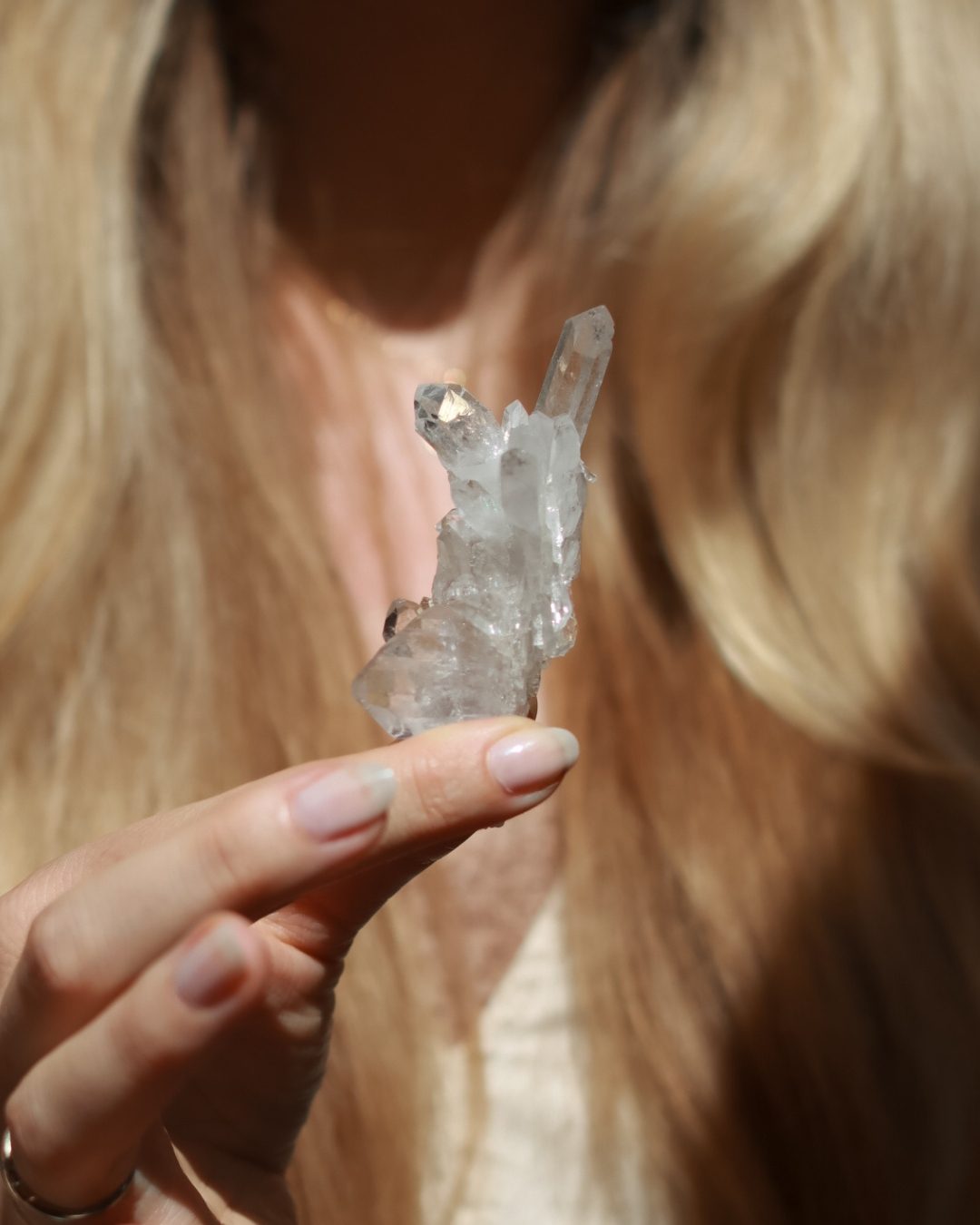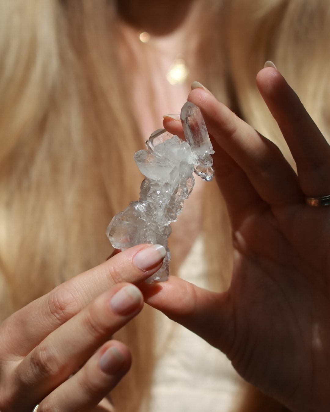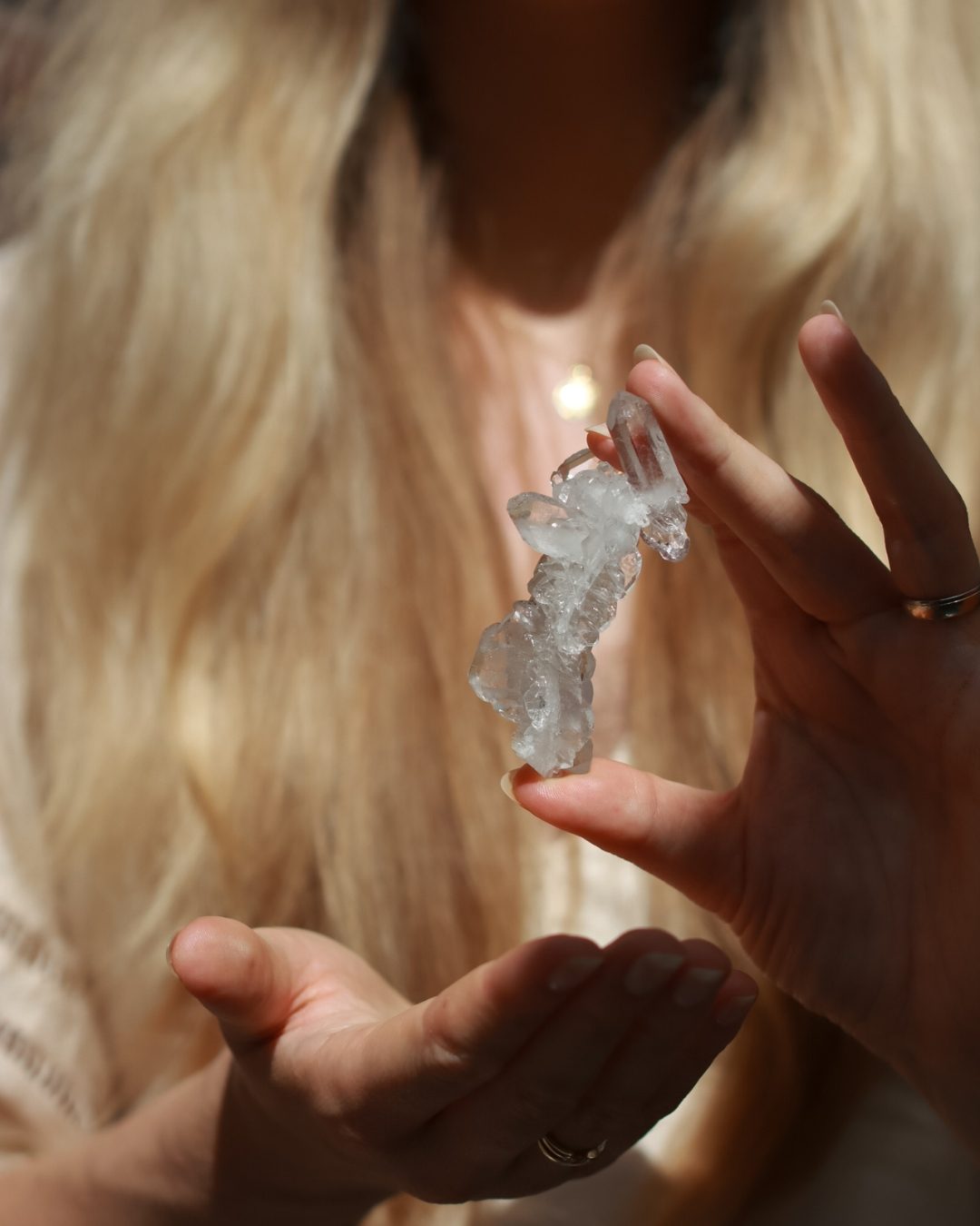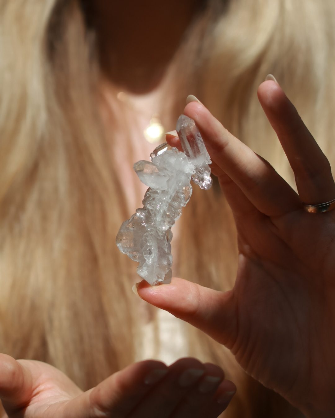 Deze fadenkwarts cluster (A+ kwaliteit) is een zeldzame en heldere variant van bergkristal. Fadenkwarts staat bekend als meesterheler en symboliseert verbinding, kracht, harmonie en emotionele stabiliteit. Ideaal voor energetisch werk of diepe heling.