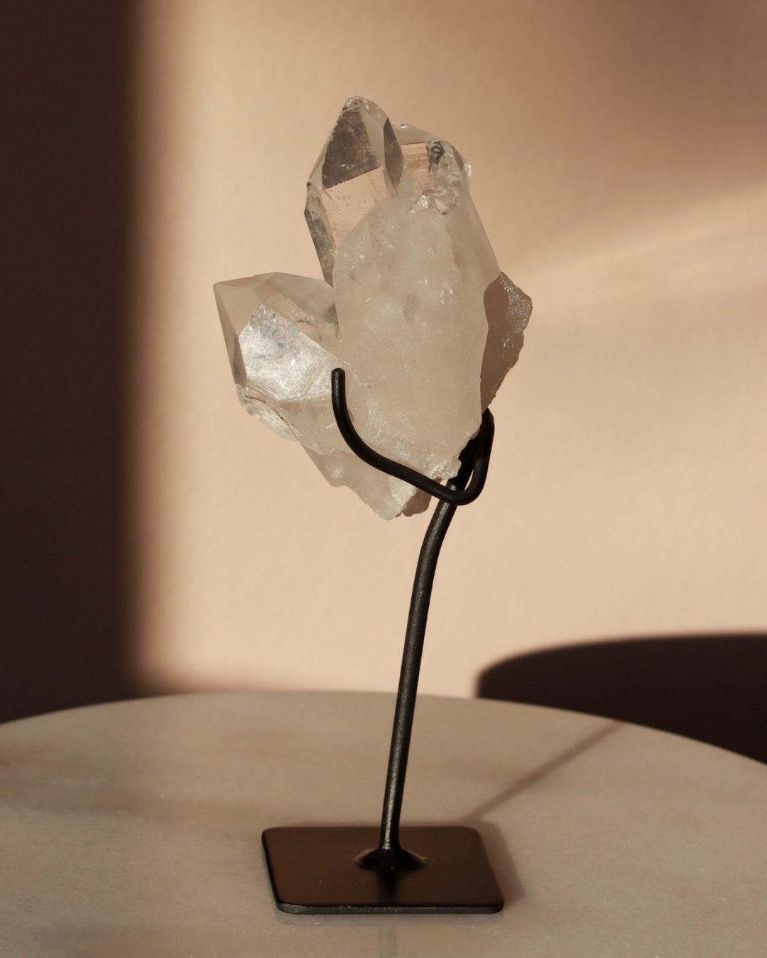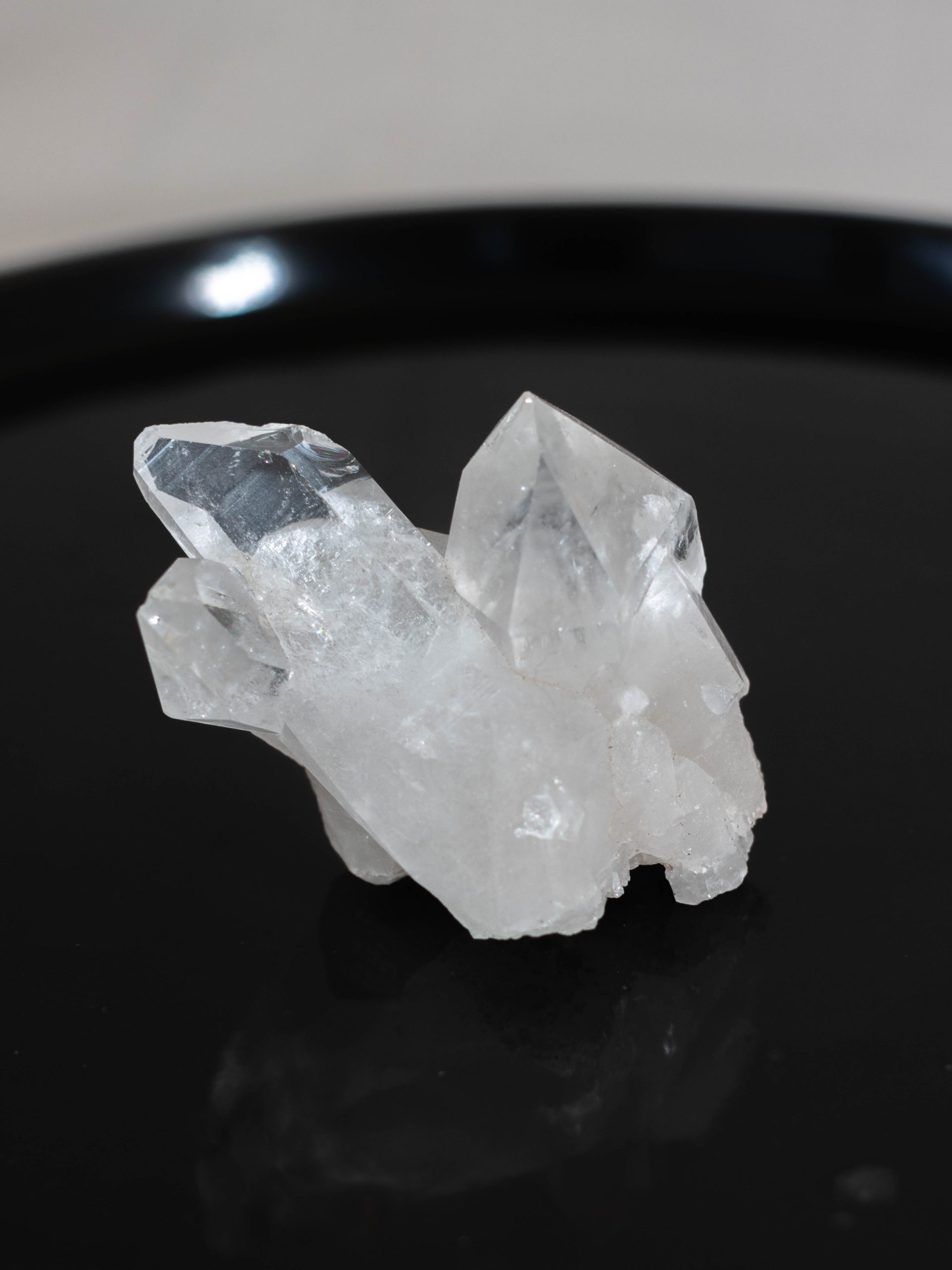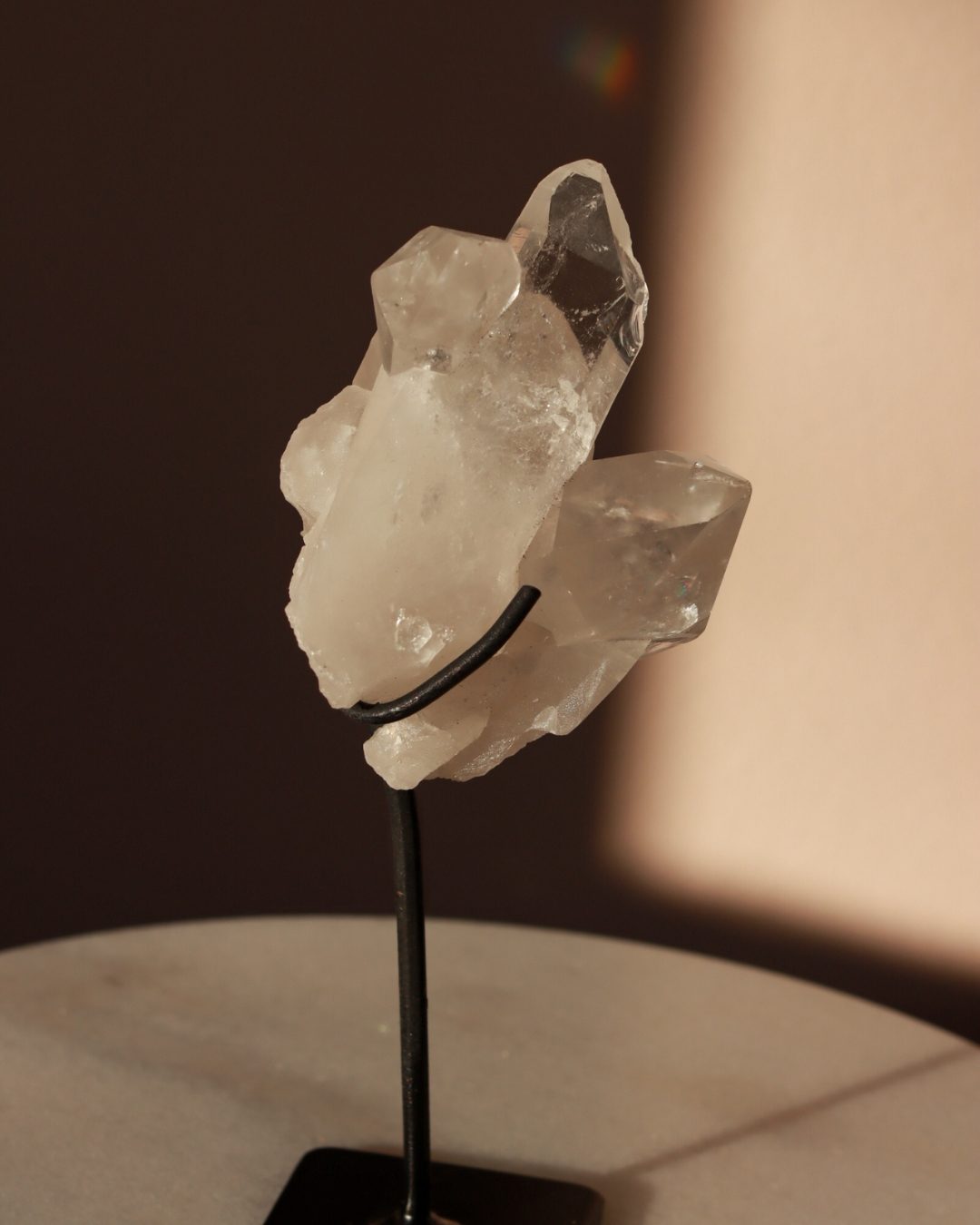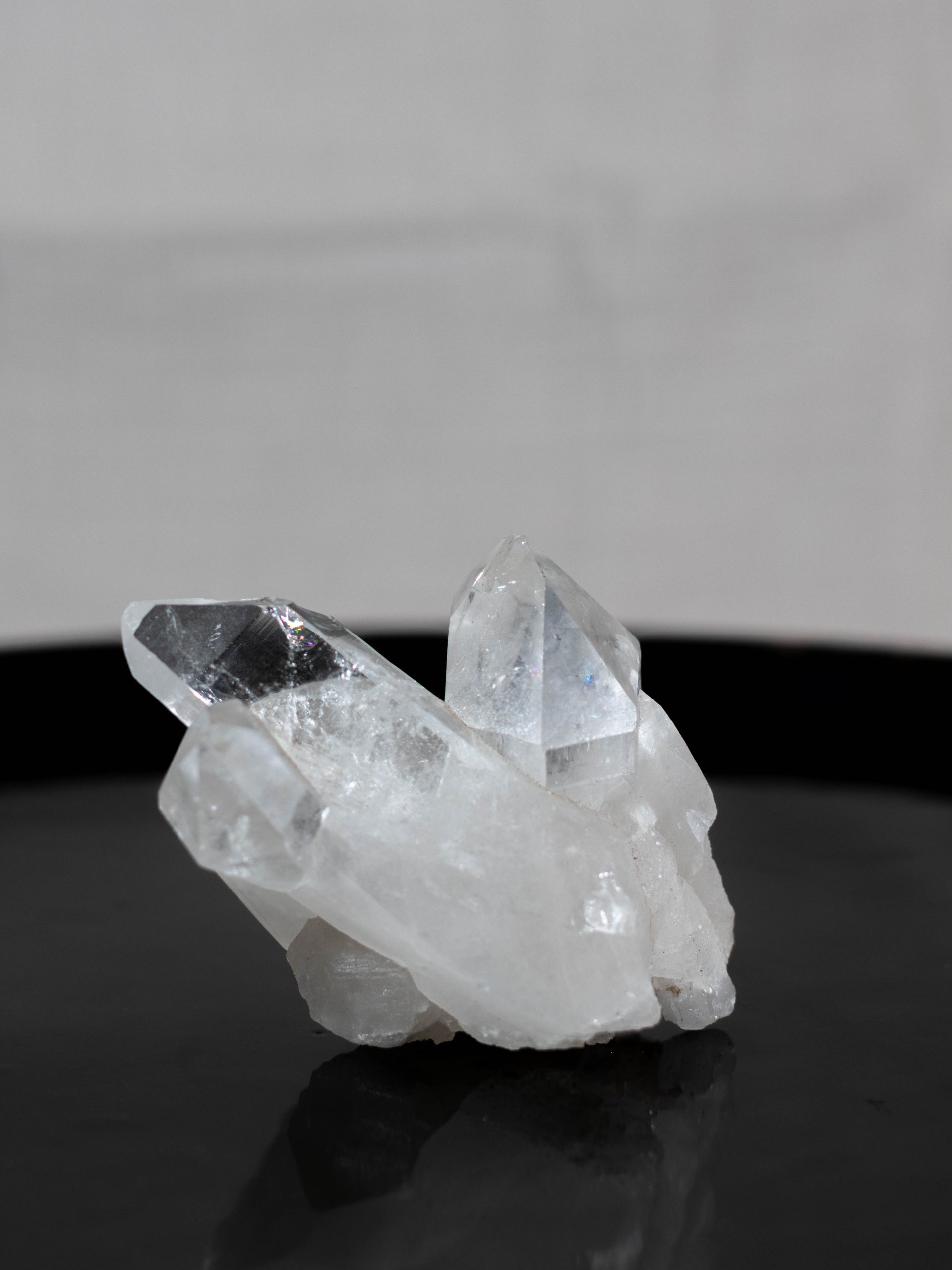 Heldere bergkristal cluster met één grote hoofdpunt en twee kleinere zijpunten. De zichtbare groeilijnen vangen het licht mooi en geven het stuk een natuurlijke uitstraling.