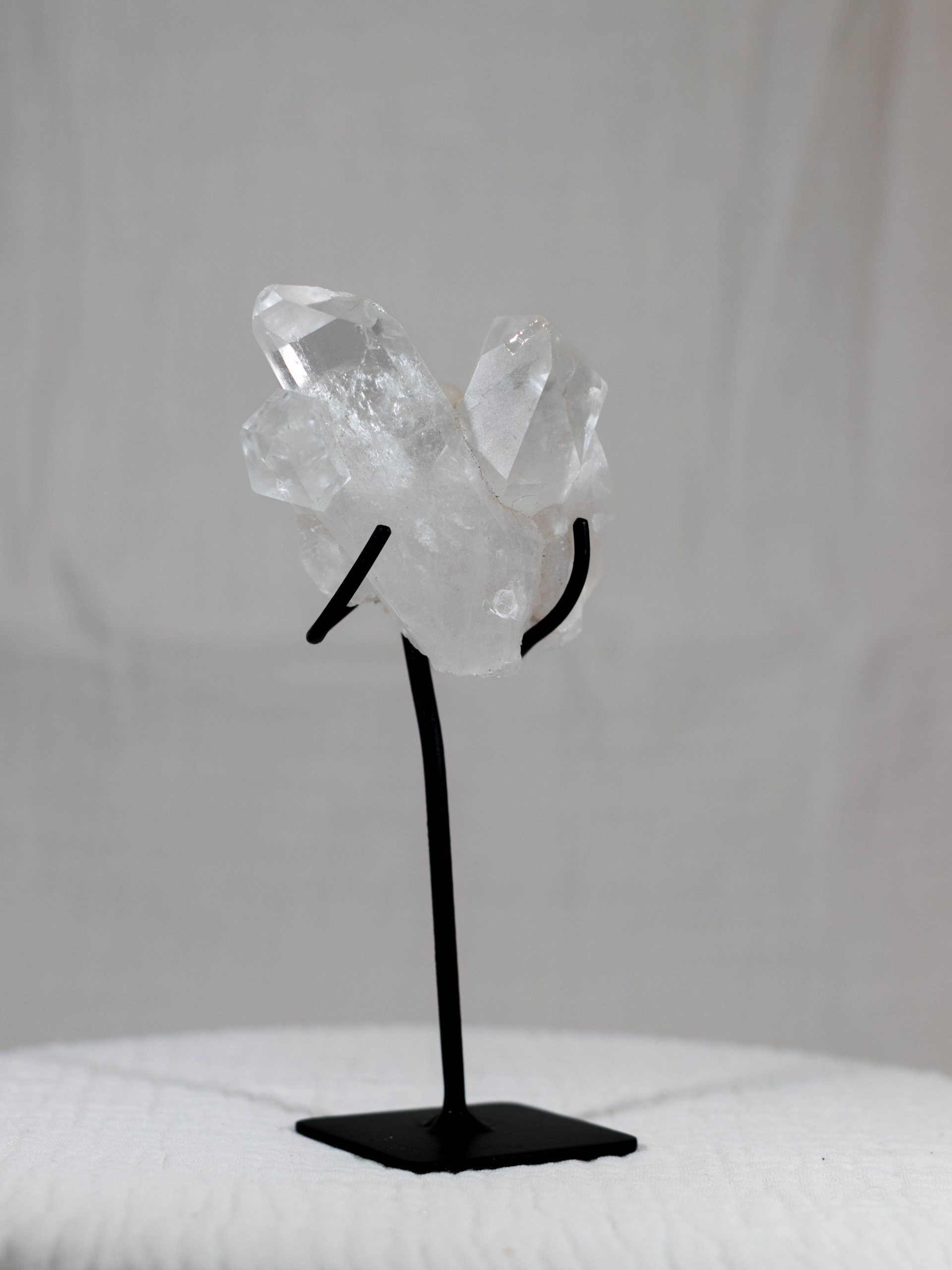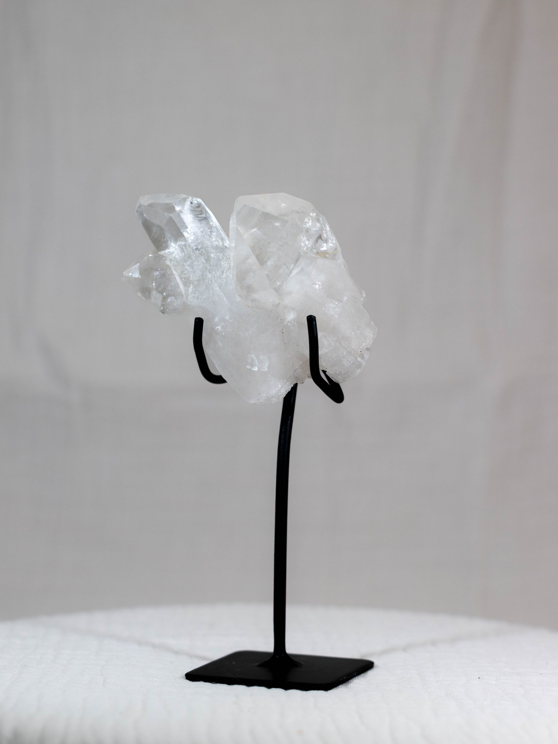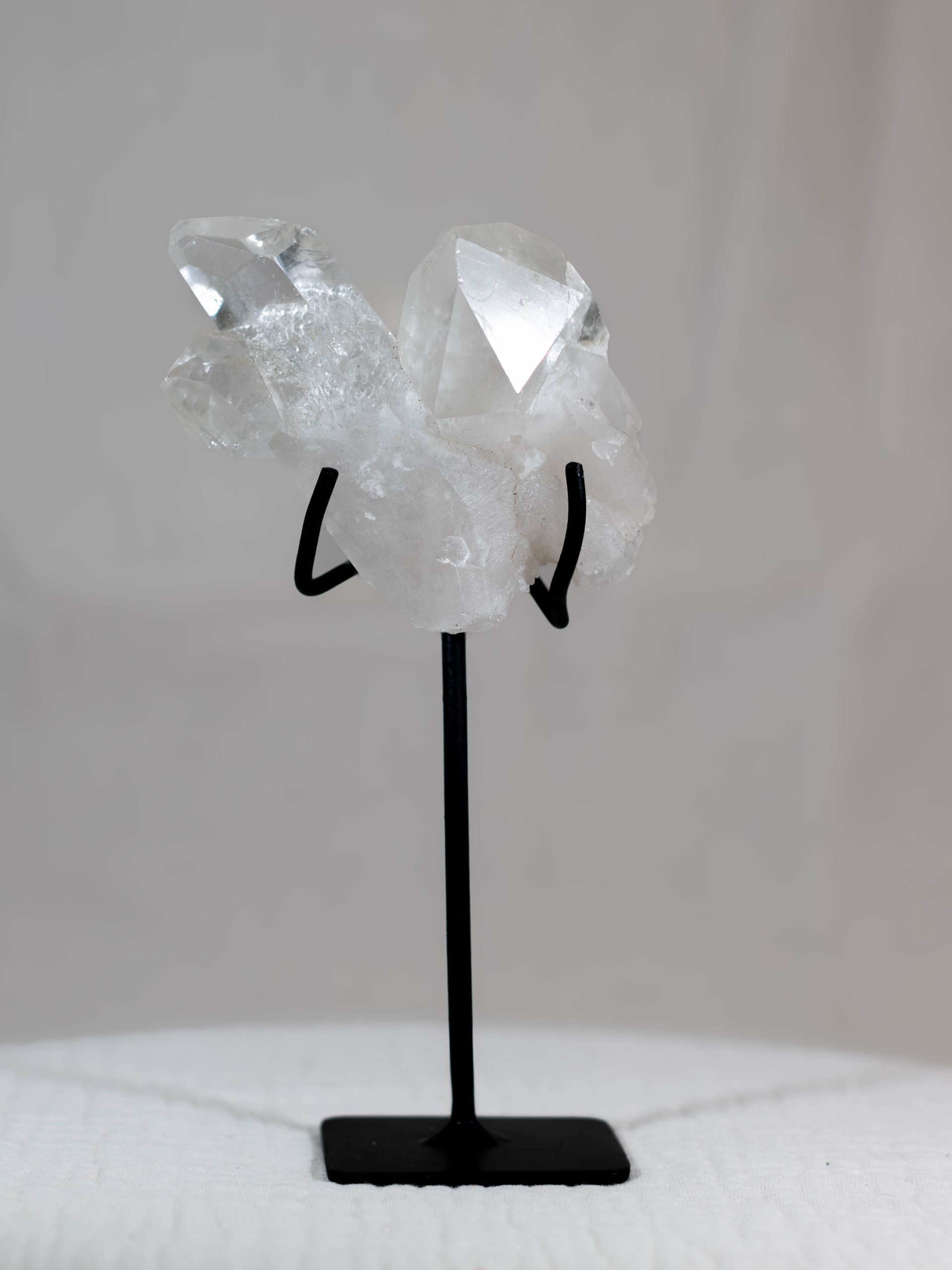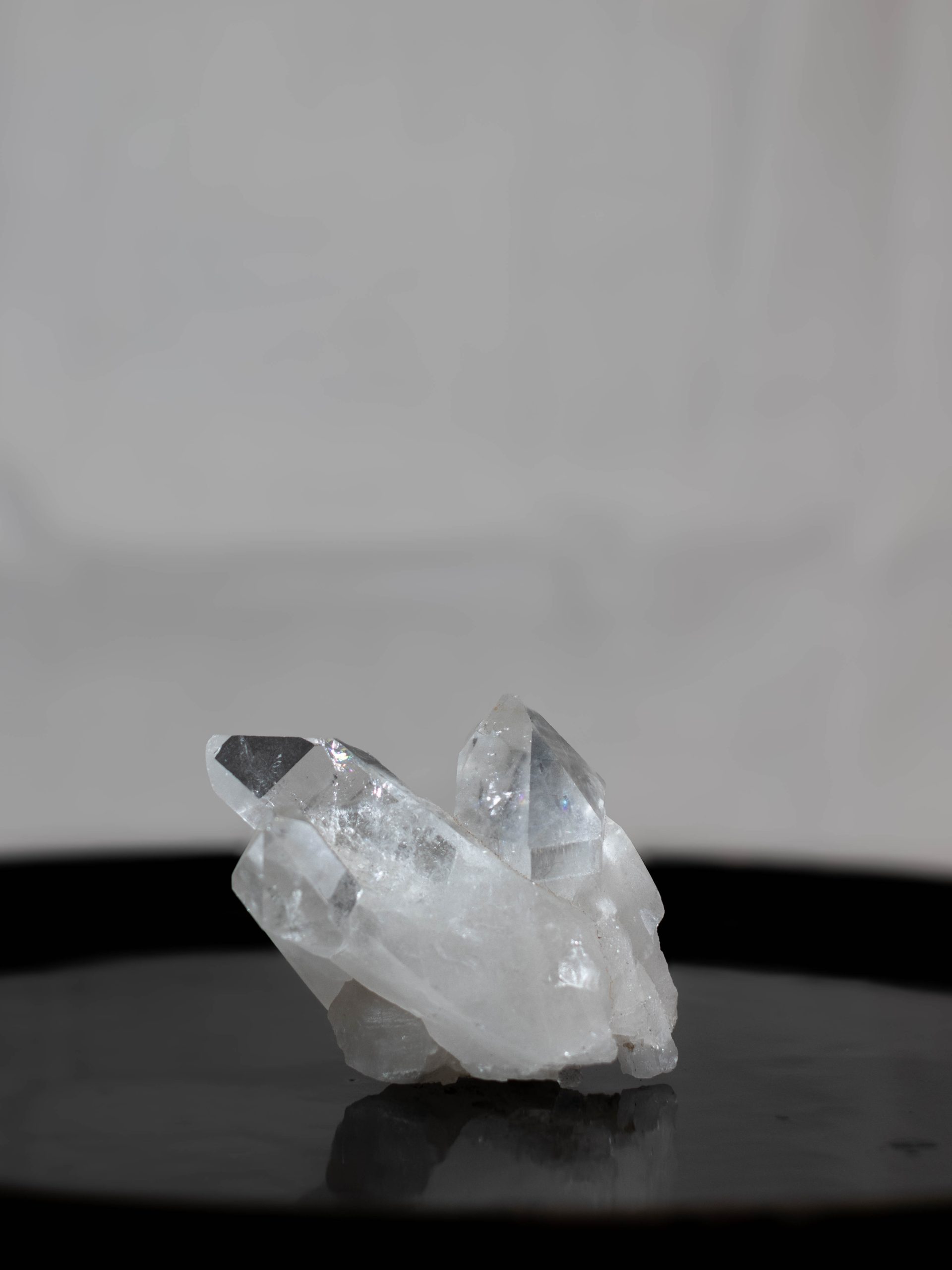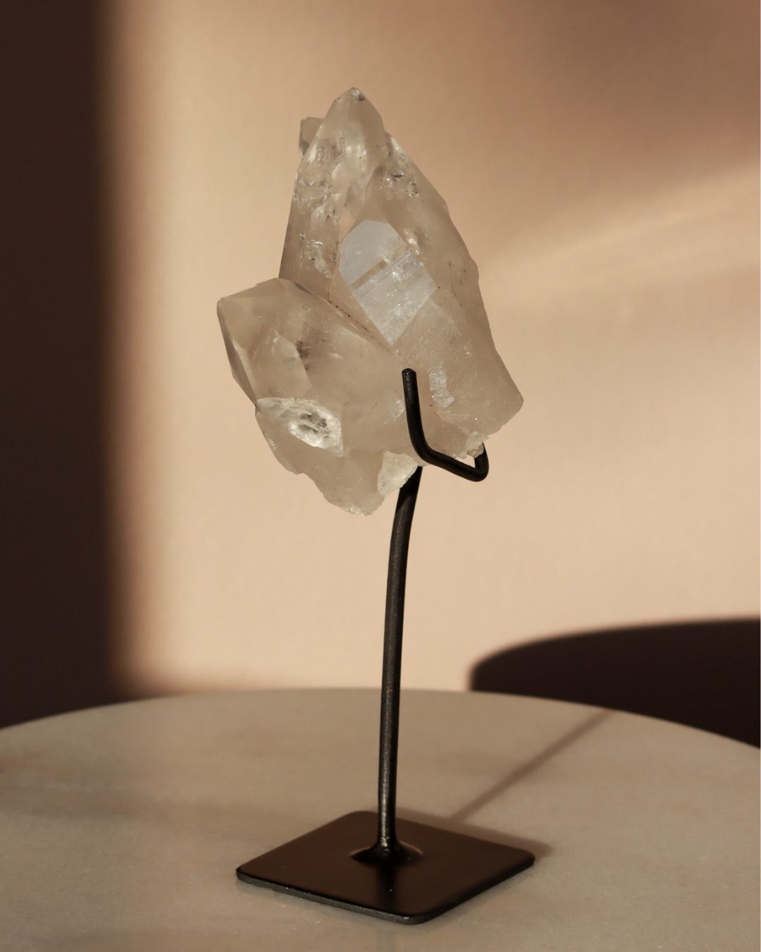 Heldere bergkristal cluster met één grote hoofdpunt en twee kleinere zijpunten. De zichtbare groeilijnen vangen het licht mooi en geven het stuk een natuurlijke uitstraling.