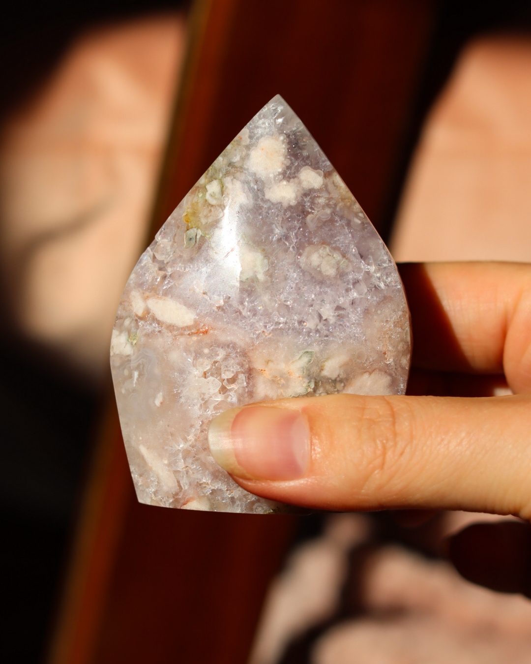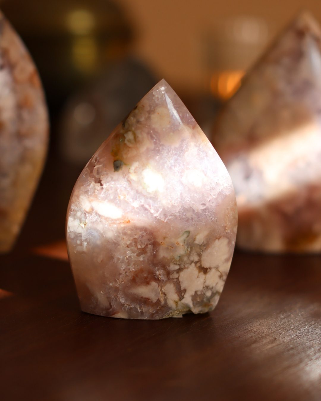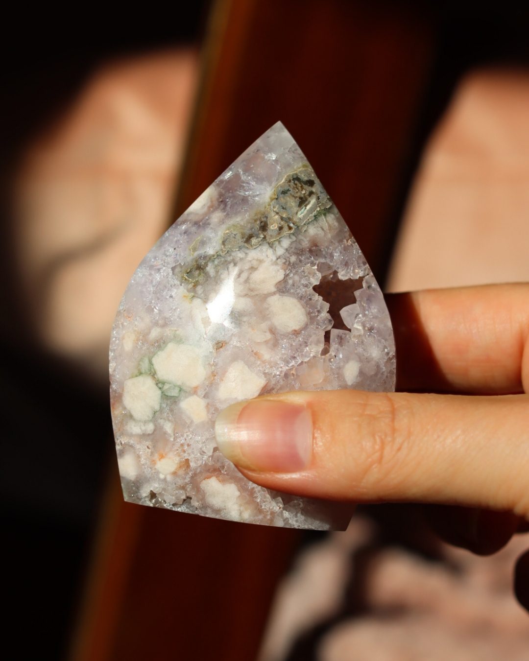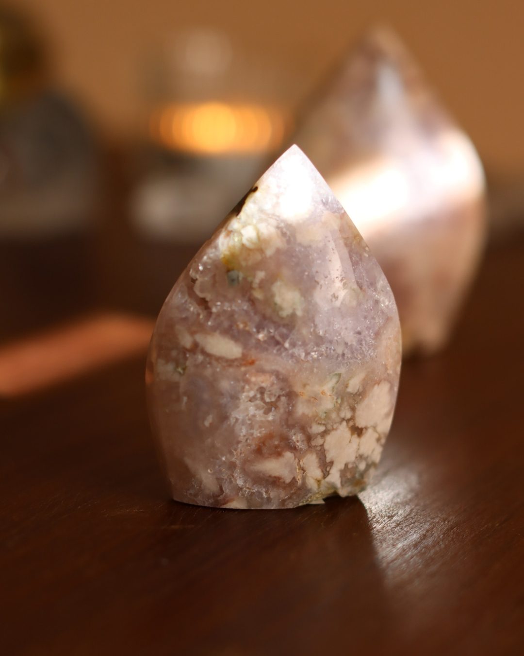 Bloemagaat is een betoverende steen, herkenbaar aan de bloemachtige insluitingen die doen denken aan bloesem in steen. Ze wordt vaak gekozen vanwege haar zachte, vrouwelijke energie en het gevoel van groei en potentie dat ze uitstraalt. Bloemagaat ontstaat uit chalcedoon en heeft vaak een melkachtige basis met unieke patronen die lijken op bloesems of kleine explosies van licht. Ze staat bekend als een steen die helpt bij persoonlijke groei, dromen najagen en zacht in beweging komen.
