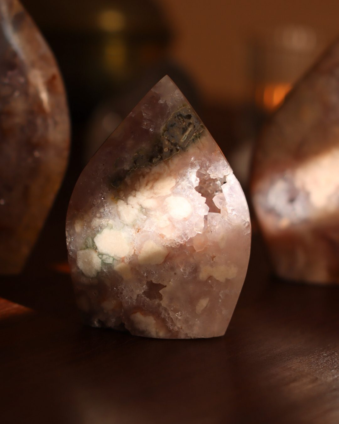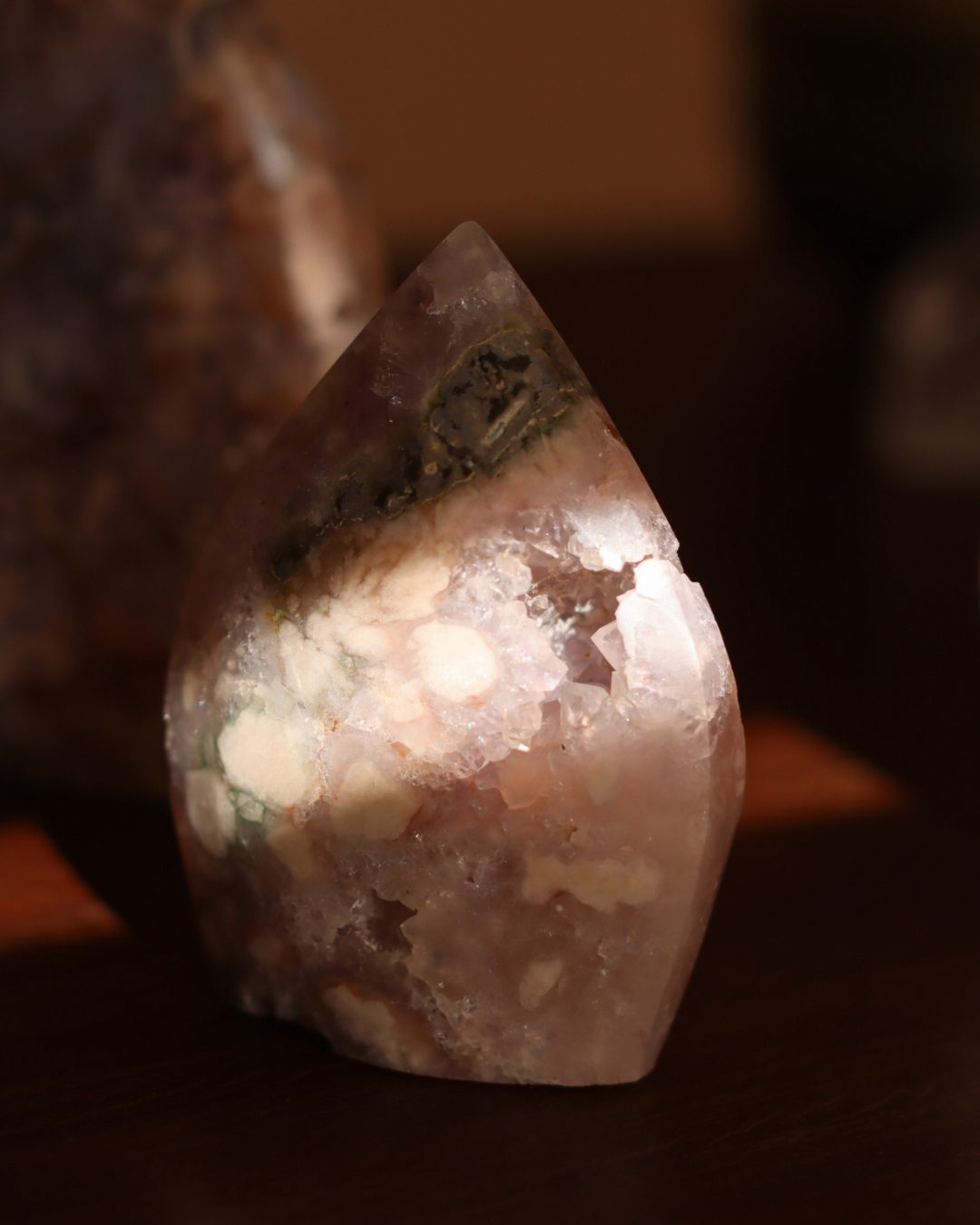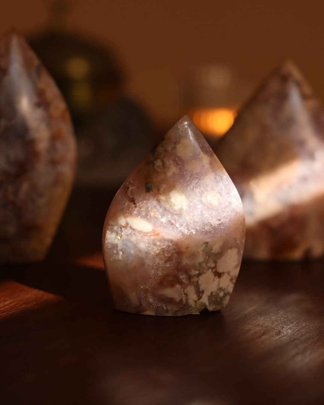 Bloemagaat is een betoverende steen, herkenbaar aan de bloemachtige insluitingen die doen denken aan bloesem in steen. Ze wordt vaak gekozen vanwege haar zachte, vrouwelijke energie en het gevoel van groei en potentie dat ze uitstraalt. Bloemagaat ontstaat uit chalcedoon en heeft vaak een melkachtige basis met unieke patronen die lijken op bloesems of kleine explosies van licht. Ze staat bekend als een steen die helpt bij persoonlijke groei, dromen najagen en zacht in beweging komen.