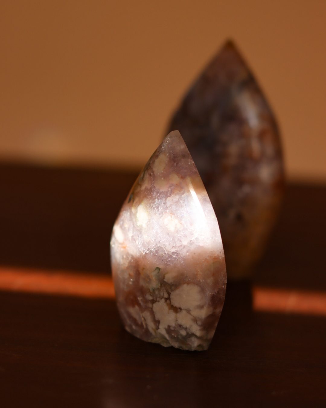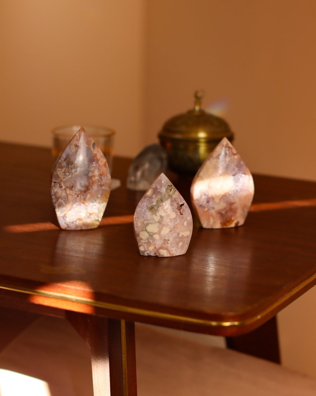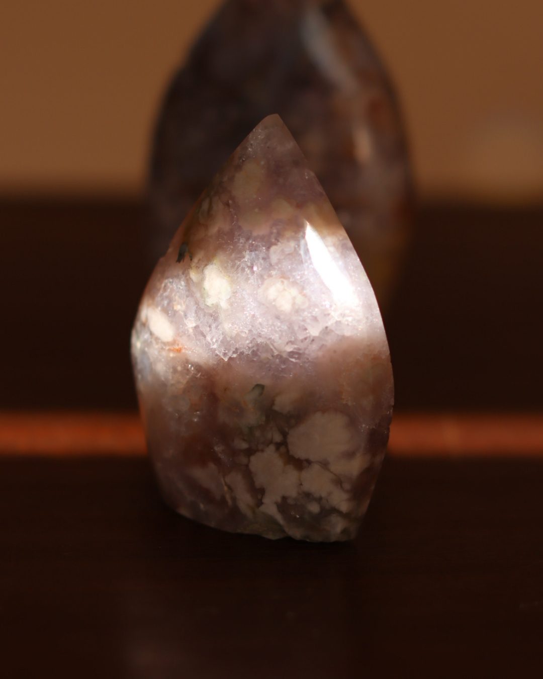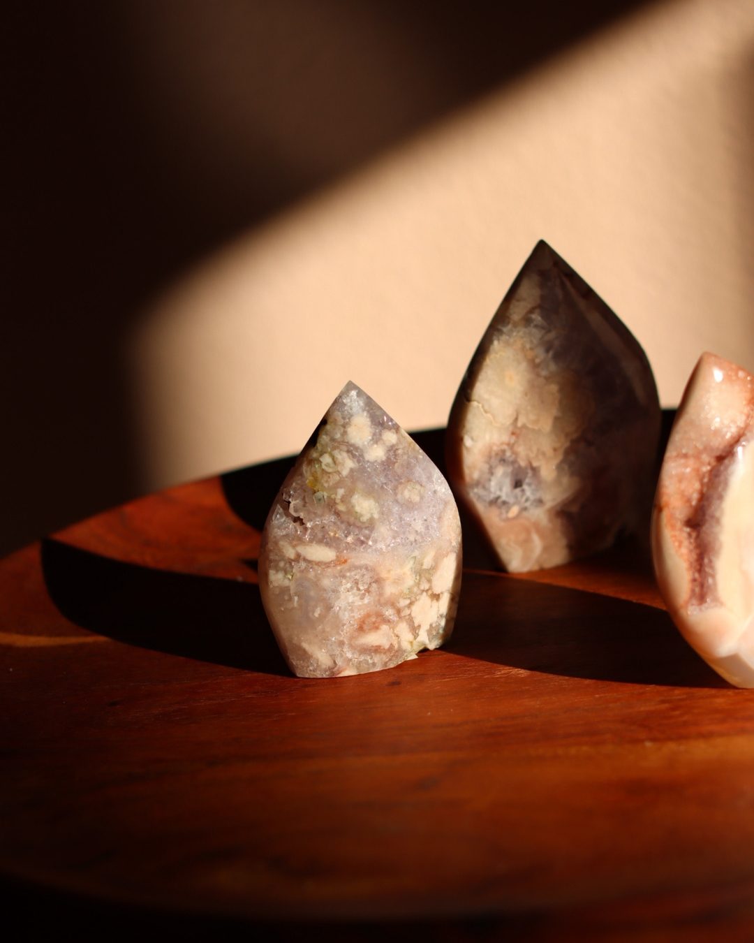 Bloemagaat is een betoverende steen, herkenbaar aan de bloemachtige insluitingen die doen denken aan bloesem in steen. Ze wordt vaak gekozen vanwege haar zachte, vrouwelijke energie en het gevoel van groei en potentie dat ze uitstraalt. Bloemagaat ontstaat uit chalcedoon en heeft vaak een melkachtige basis met unieke patronen die lijken op bloesems of kleine explosies van licht. Ze staat bekend als een steen die helpt bij persoonlijke groei, dromen najagen en zacht in beweging komen.