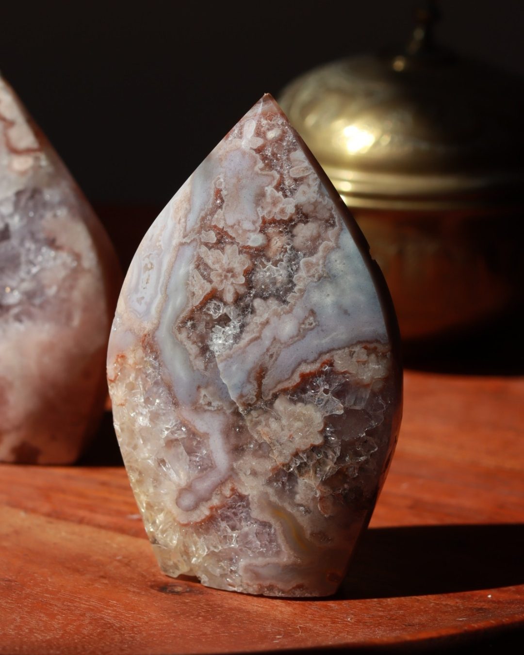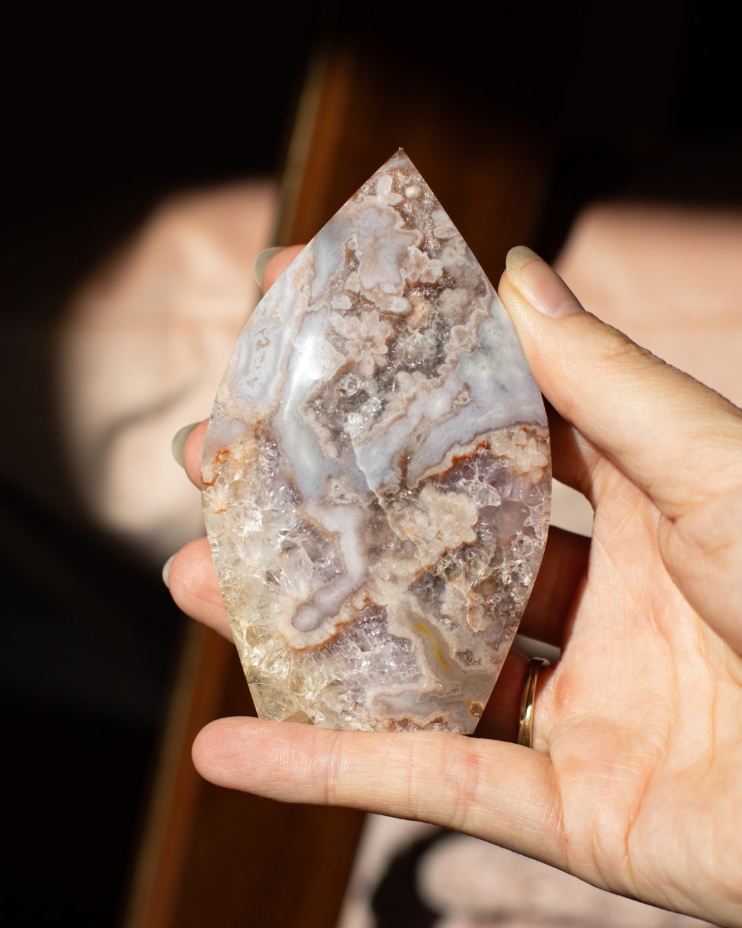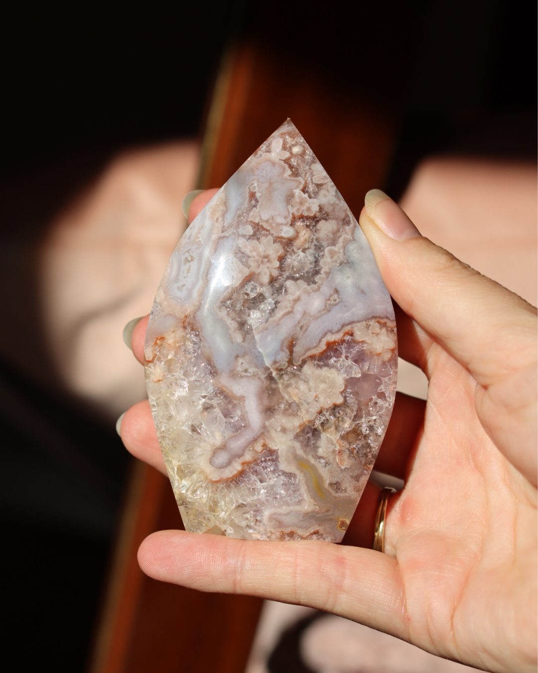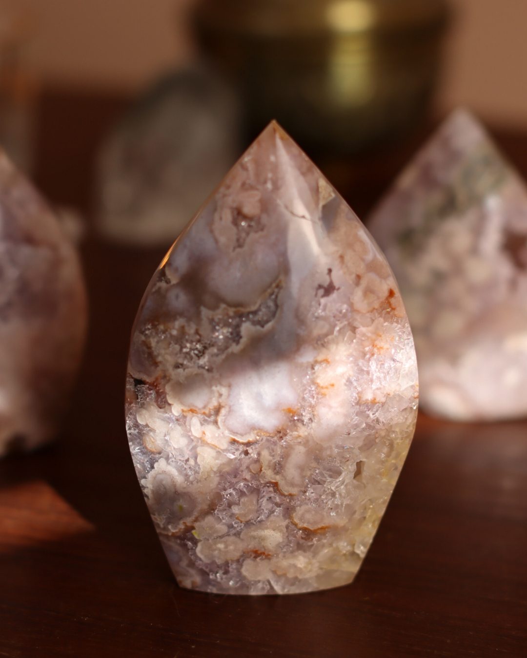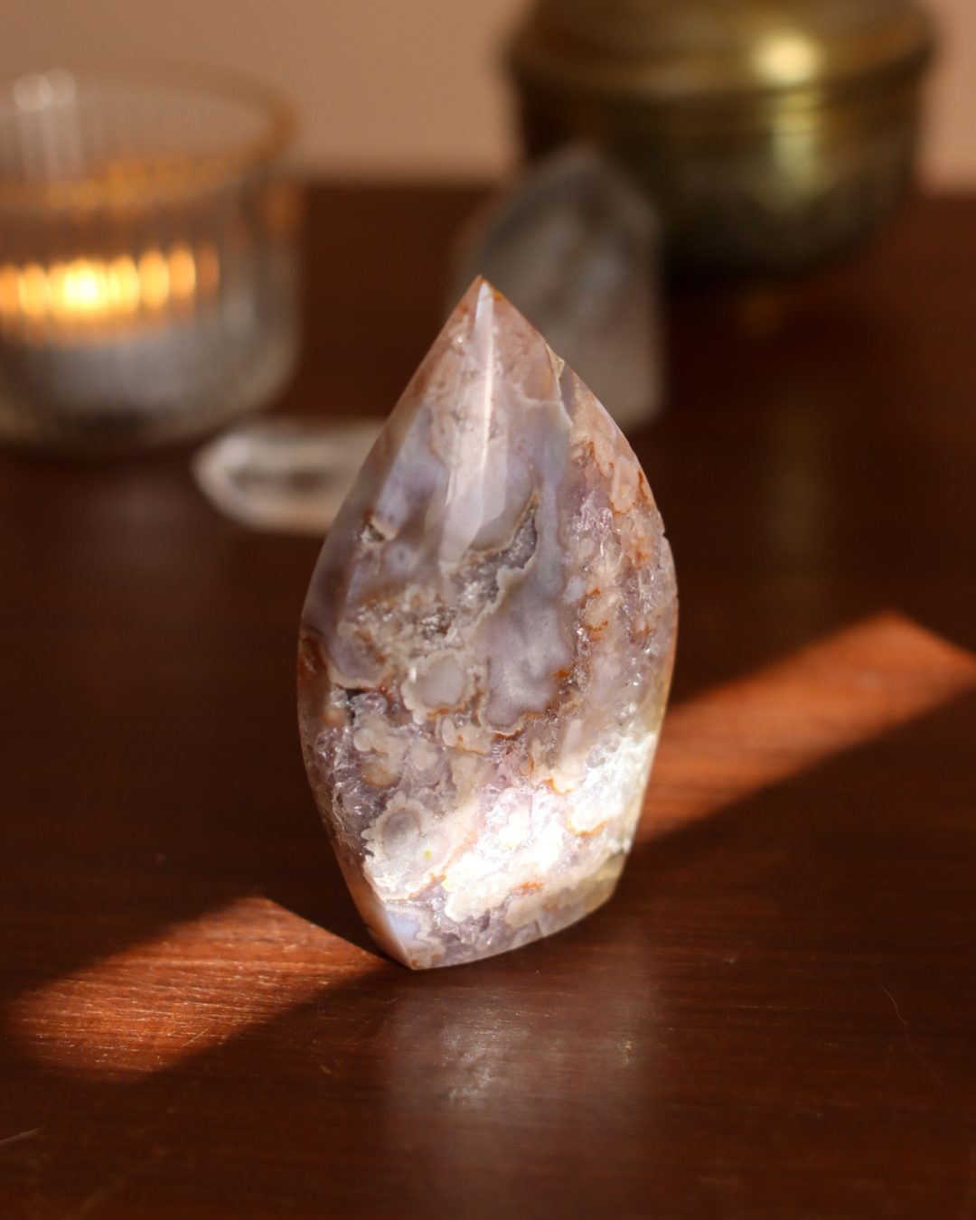 Bloemagaat is een betoverende steen, herkenbaar aan de bloemachtige insluitingen die doen denken aan bloesem in steen. Ze wordt vaak gekozen vanwege haar zachte, vrouwelijke energie en het gevoel van groei en potentie dat ze uitstraalt. Bloemagaat ontstaat uit chalcedoon en heeft vaak een melkachtige basis met unieke patronen die lijken op bloesems of kleine explosies van licht. Ze staat bekend als een steen die helpt bij persoonlijke groei, dromen najagen en zacht in beweging komen.