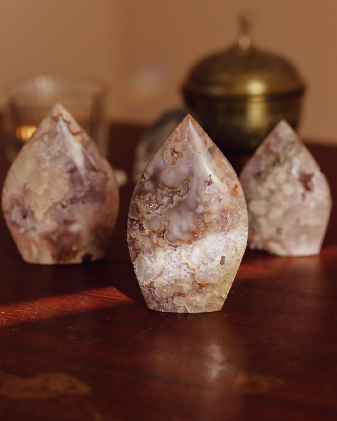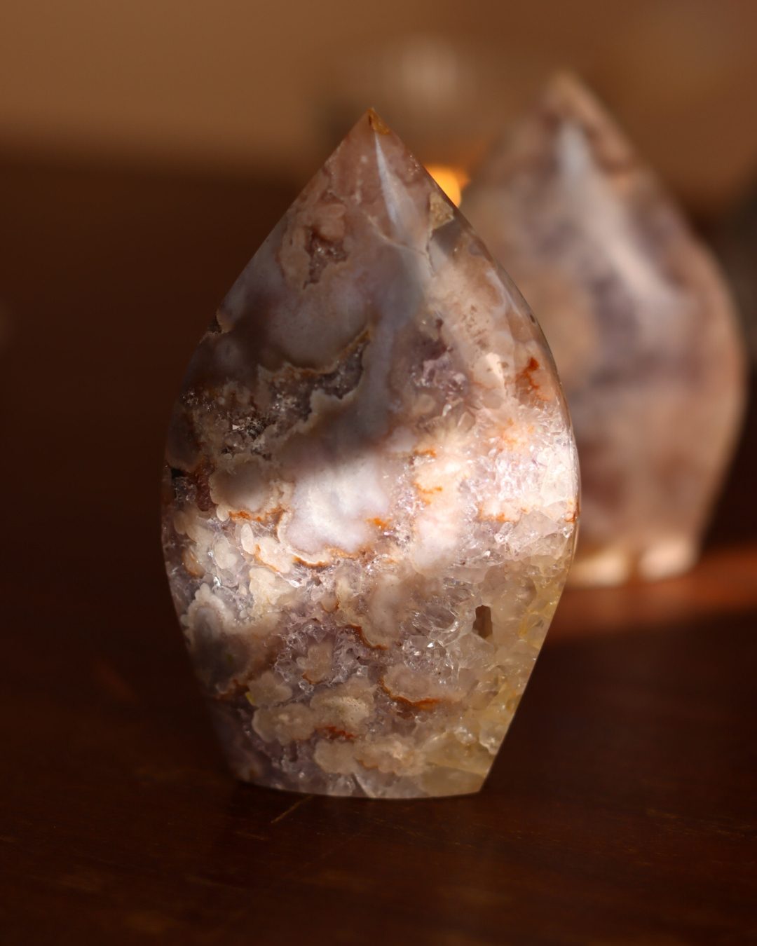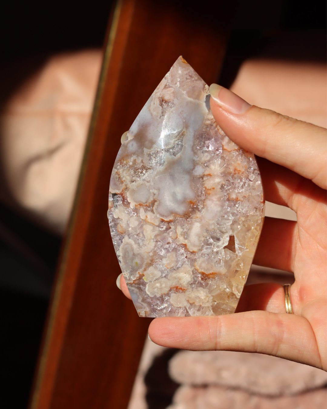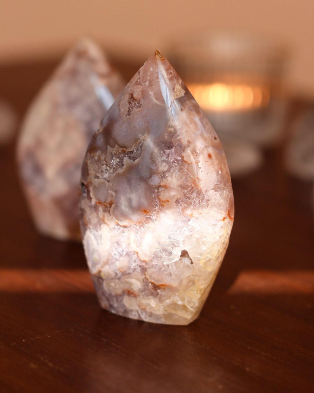 Bloemagaat is een betoverende steen, herkenbaar aan de bloemachtige insluitingen die doen denken aan bloesem in steen. Ze wordt vaak gekozen vanwege haar zachte, vrouwelijke energie en het gevoel van groei en potentie dat ze uitstraalt. Bloemagaat ontstaat uit chalcedoon en heeft vaak een melkachtige basis met unieke patronen die lijken op bloesems of kleine explosies van licht. Ze staat bekend als een steen die helpt bij persoonlijke groei, dromen najagen en zacht in beweging komen.