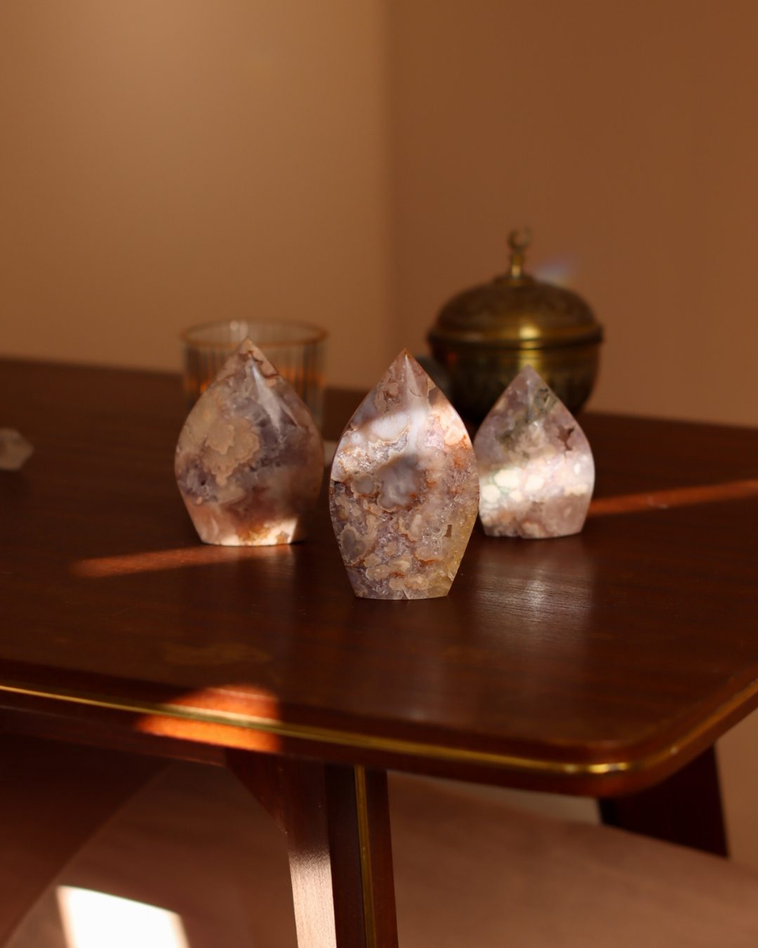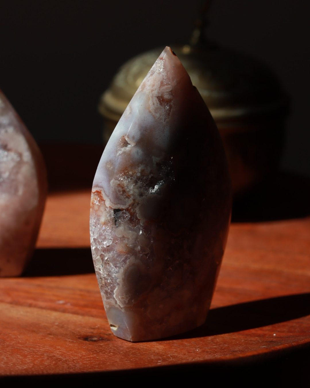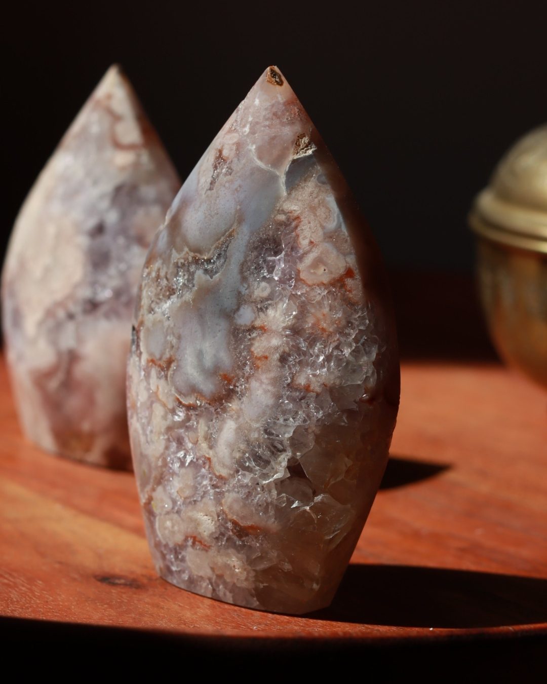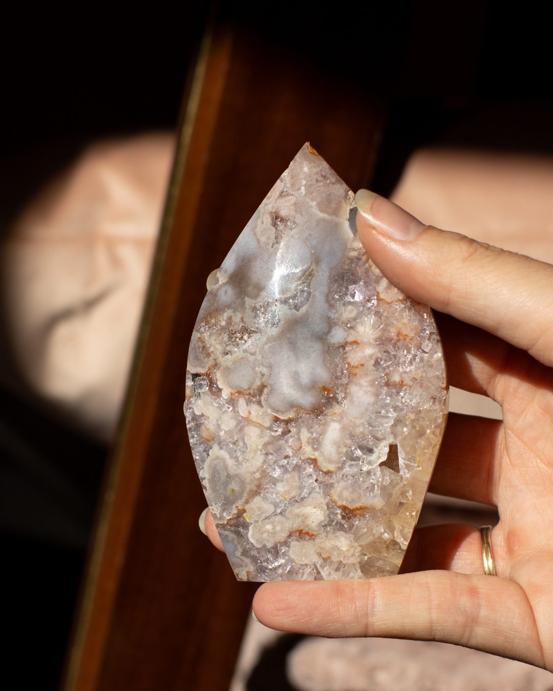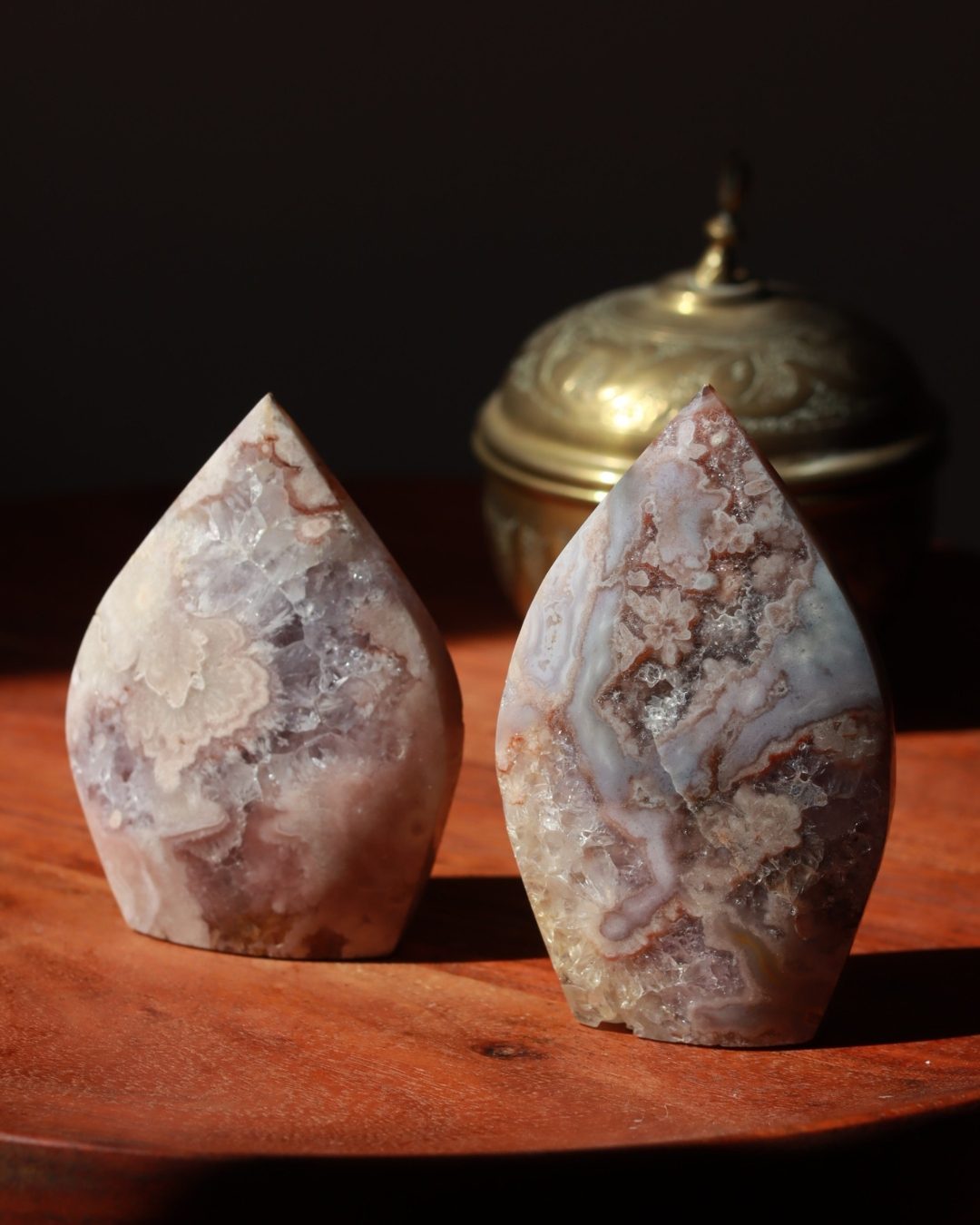 Bloemagaat is een betoverende steen, herkenbaar aan de bloemachtige insluitingen die doen denken aan bloesem in steen. Ze wordt vaak gekozen vanwege haar zachte, vrouwelijke energie en het gevoel van groei en potentie dat ze uitstraalt. Bloemagaat ontstaat uit chalcedoon en heeft vaak een melkachtige basis met unieke patronen die lijken op bloesems of kleine explosies van licht. Ze staat bekend als een steen die helpt bij persoonlijke groei, dromen najagen en zacht in beweging komen.