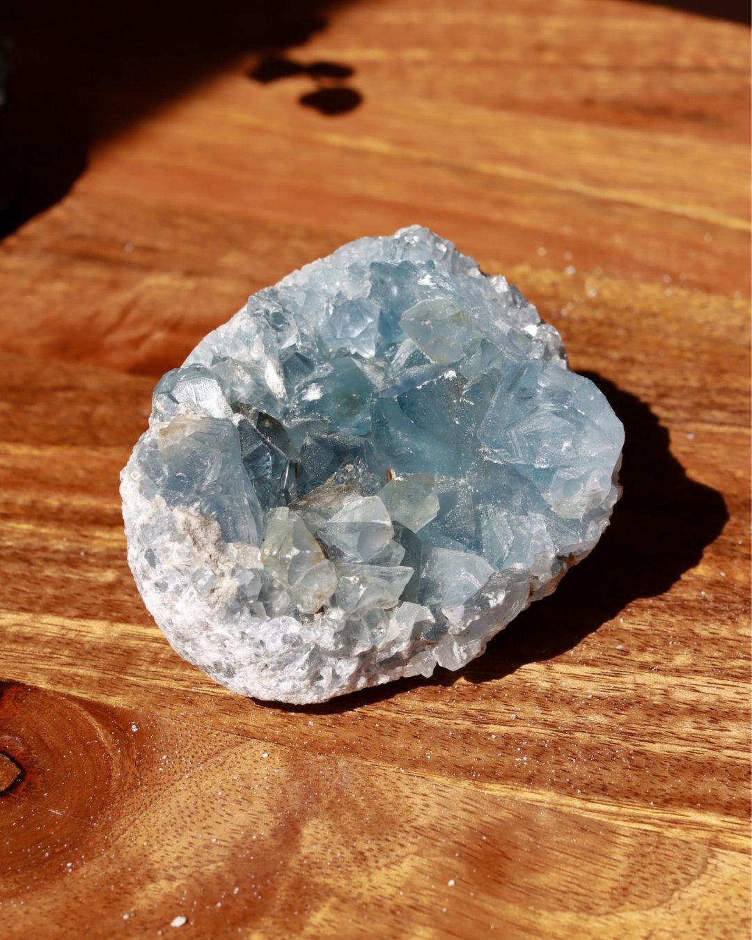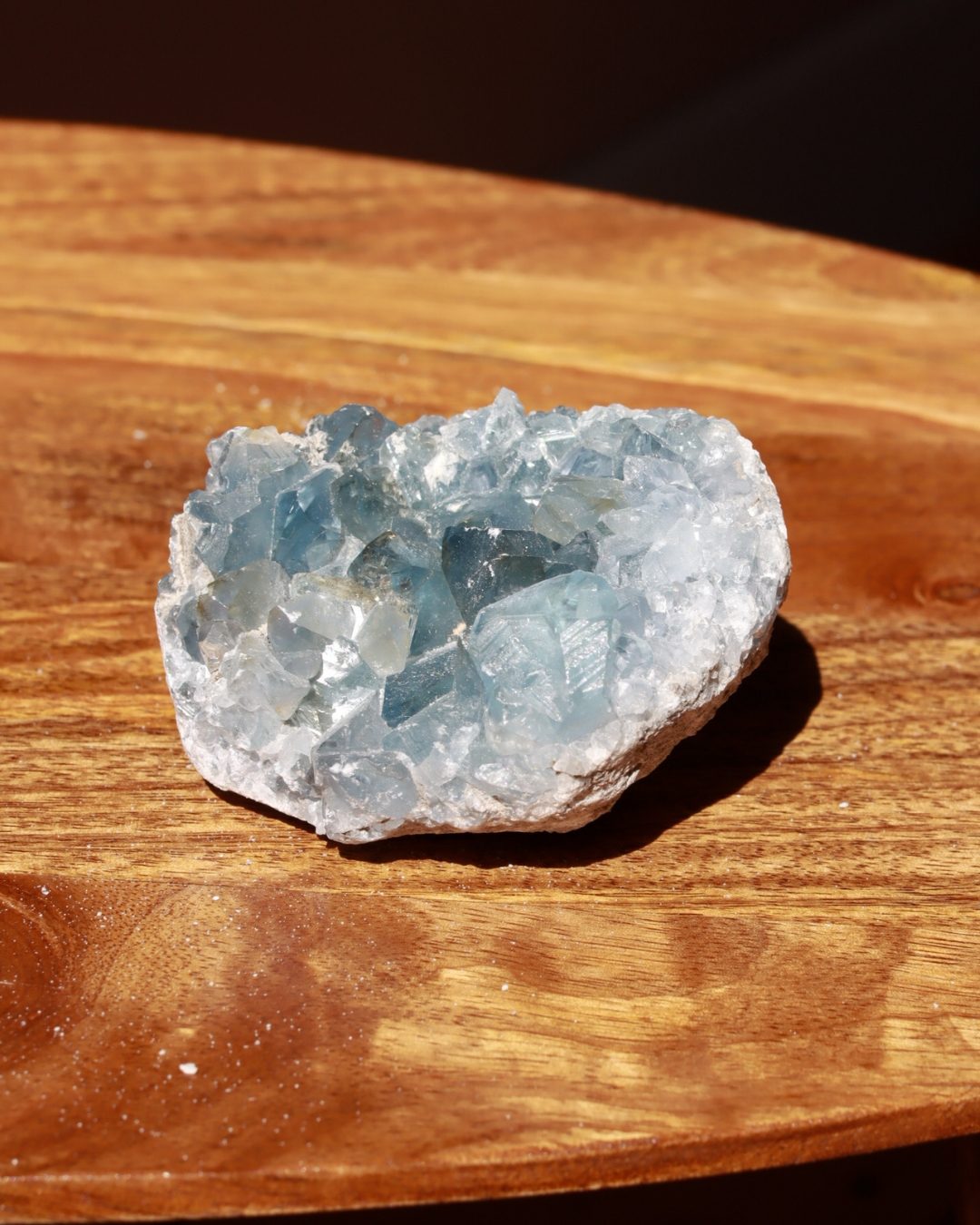 Celestien cluster van hoge kwaliteit. Deze cluster heeft zachte blauwtinten en is rijk aan kleine kristallen die het licht mooi weerkaatsen. De natuurlijke glinstering en rustige uitstraling maken het een fijne toevoeging aan je interieur of kristalverzameling.