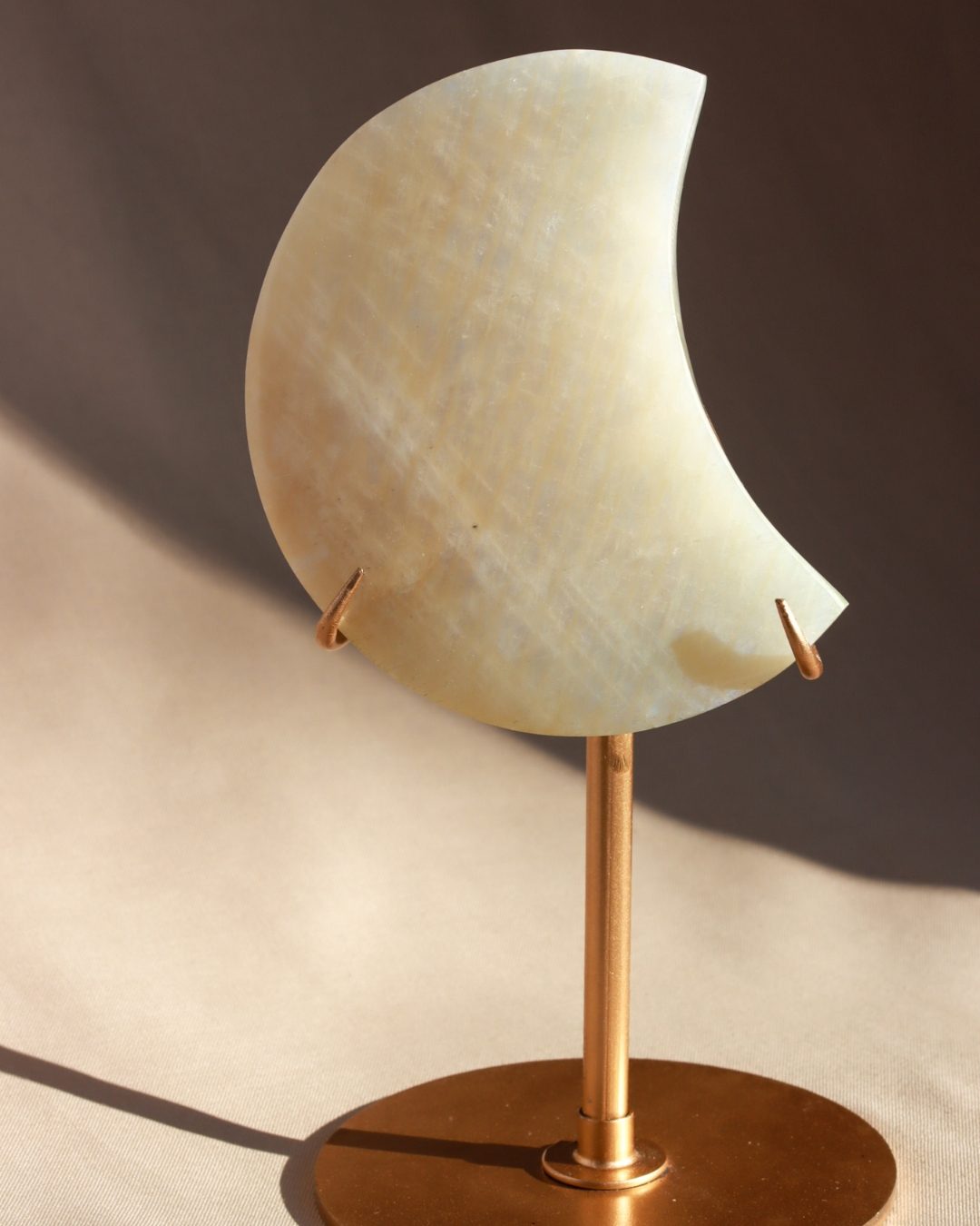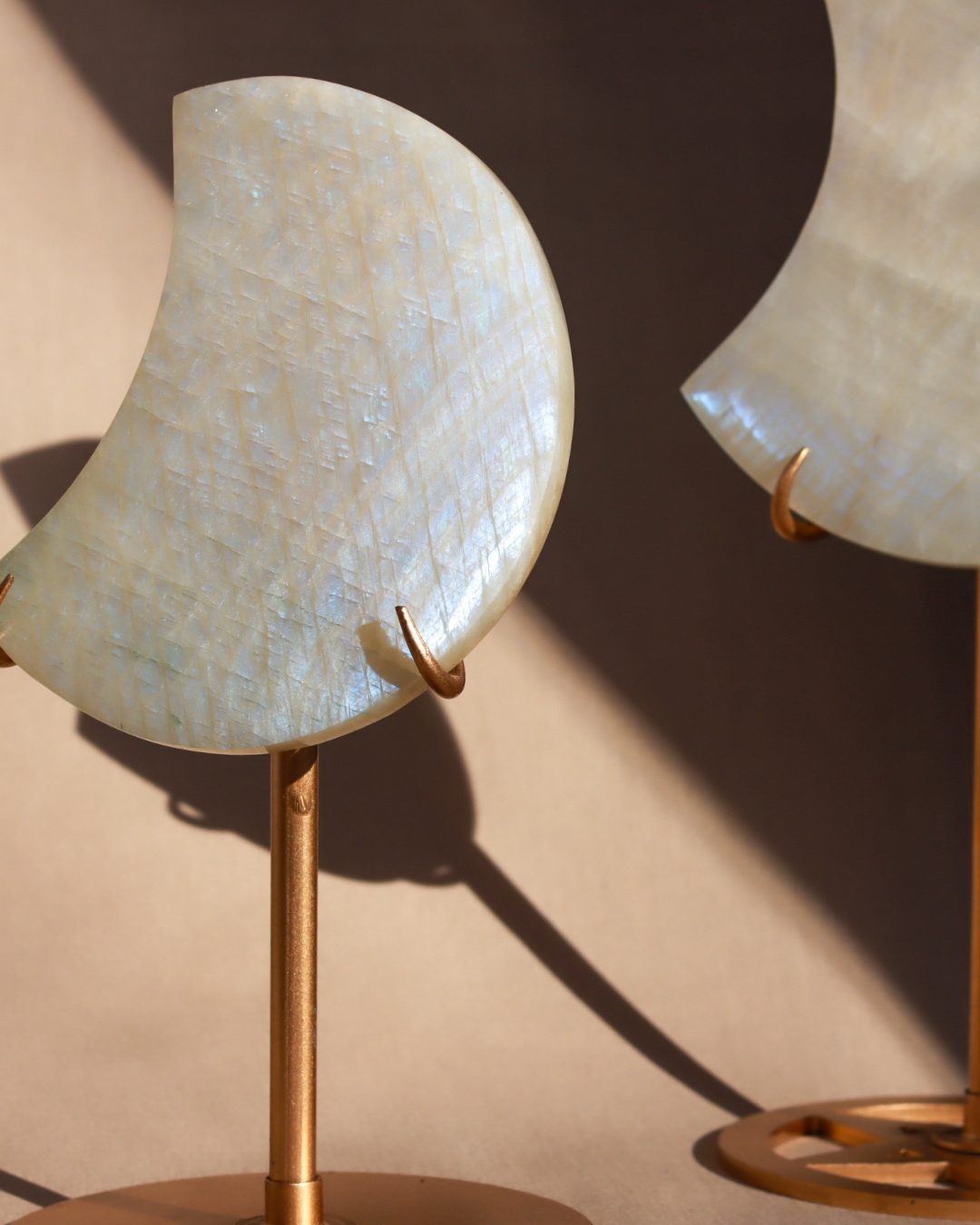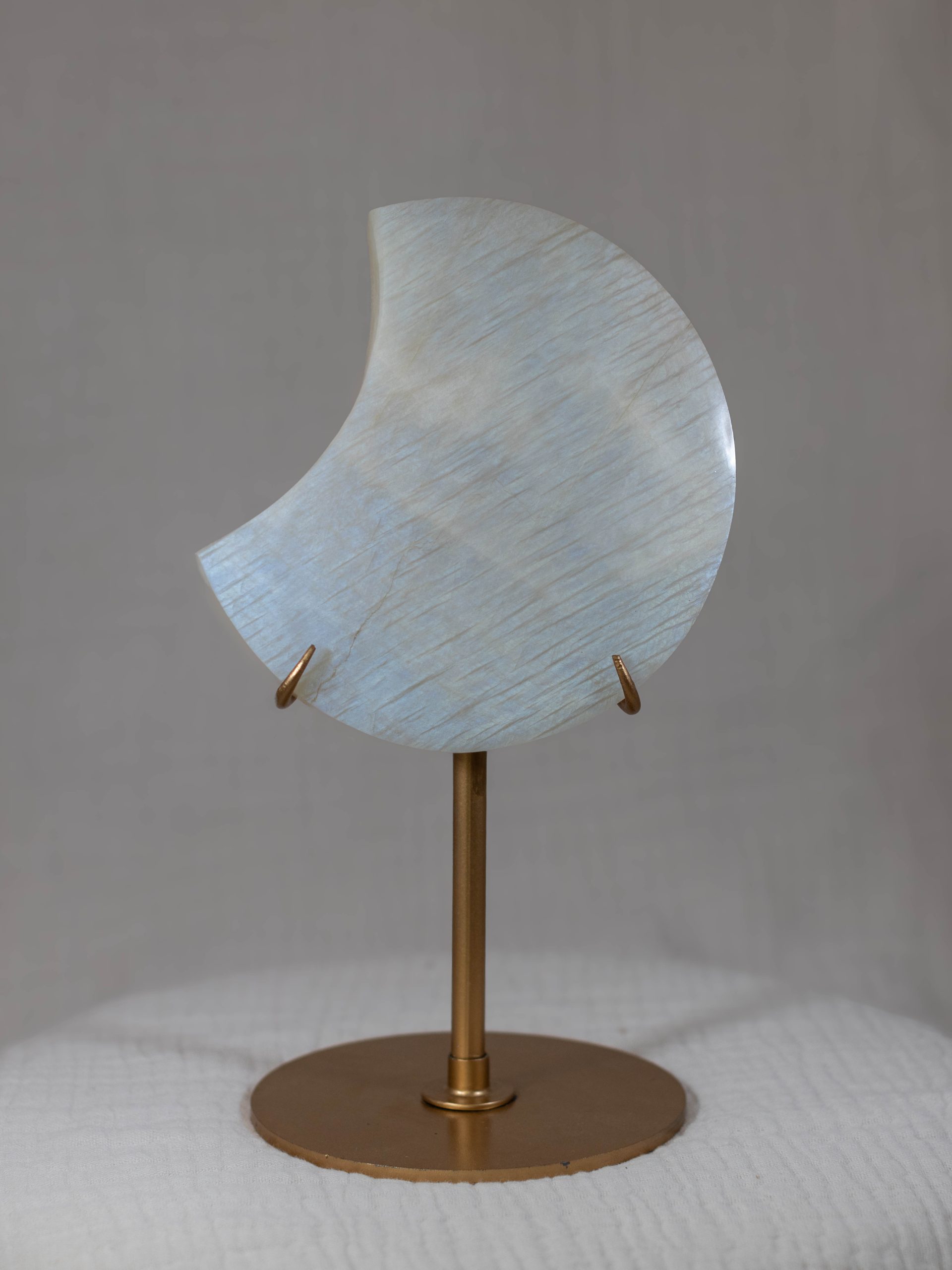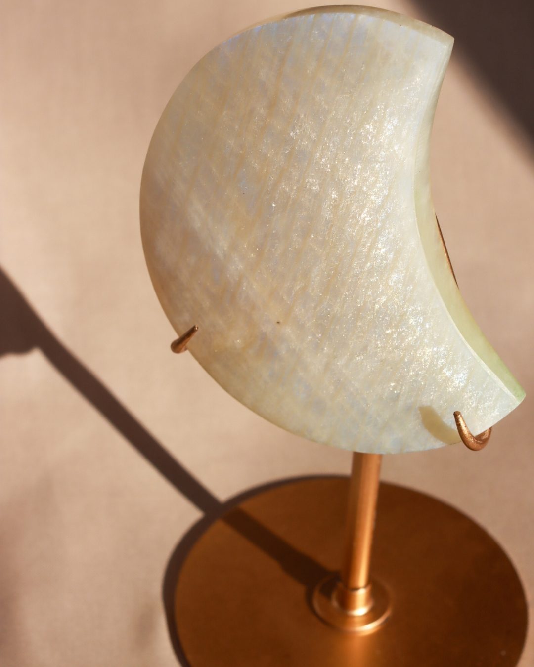 Unieke maansteen in maanvorm op standaard met de typische maansteen glow (adularescentie) die een zachte, blauwe gloed laat zien. Een elegant stuk dat zowel in je interieur als in je kristalcollectie prachtig tot zijn recht komt.