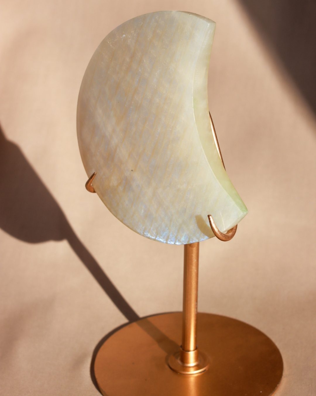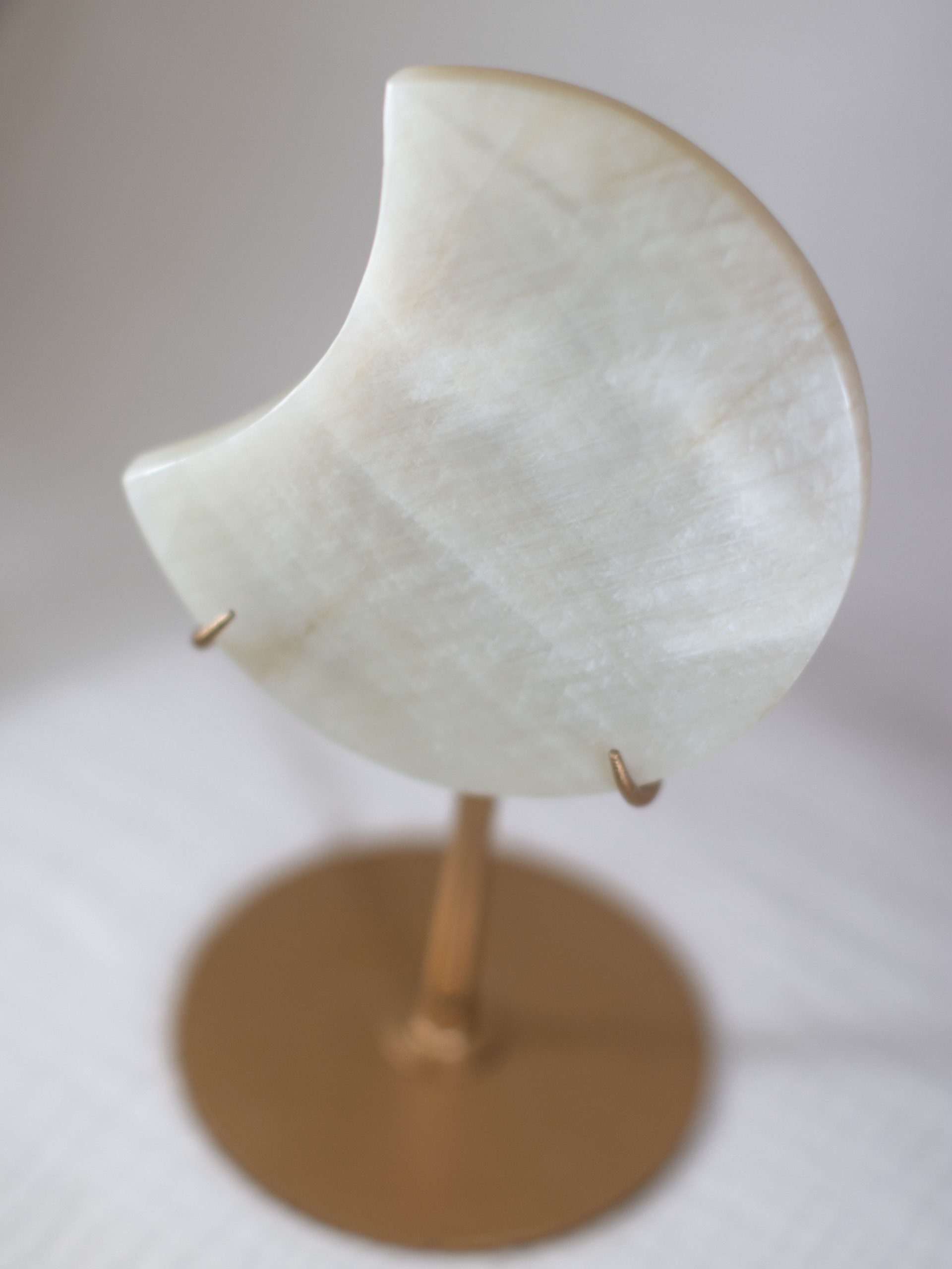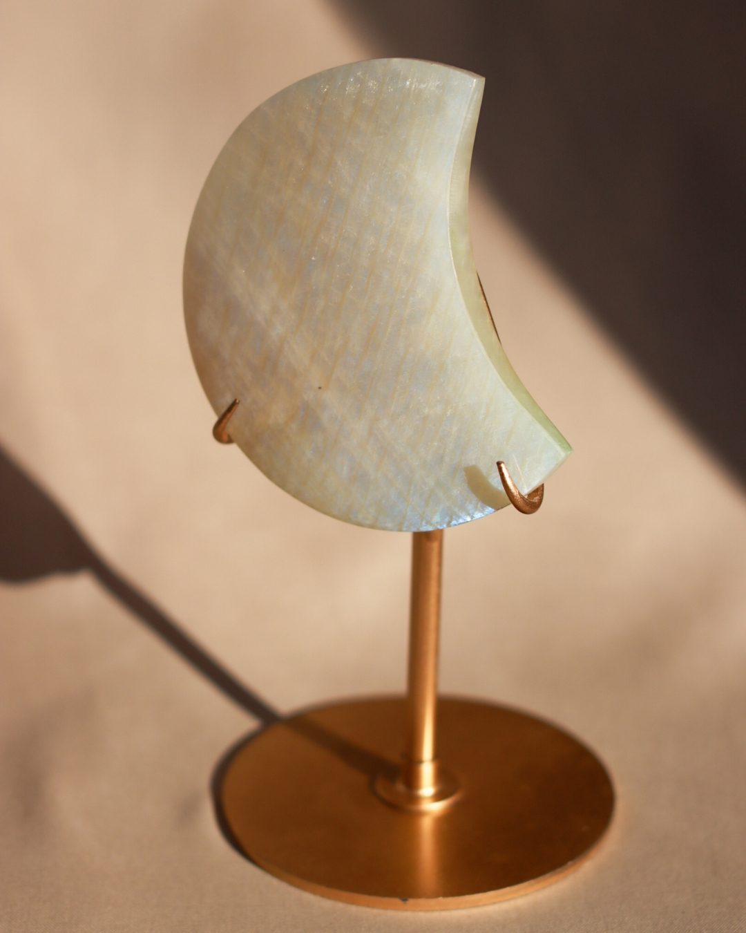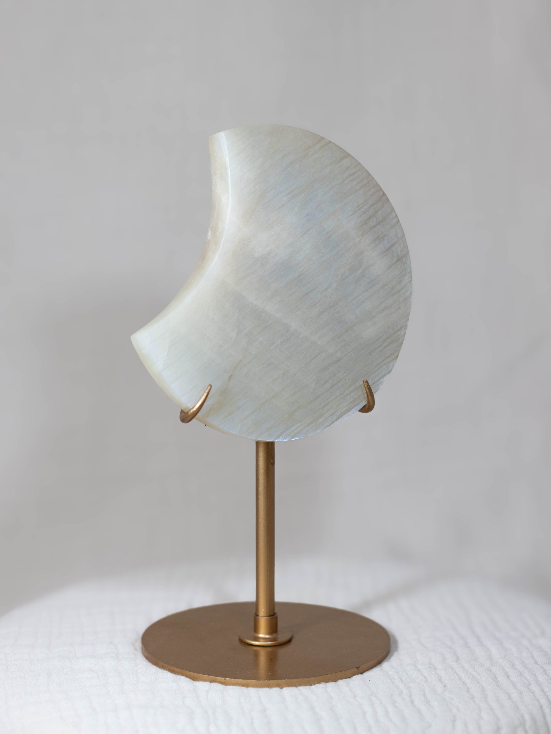 Unieke maansteen in maanvorm op standaard met de typische maansteen glow (adularescentie) die een zachte, blauwe gloed laat zien. Een elegant stuk dat zowel in je interieur als in je kristalcollectie prachtig tot zijn recht komt.