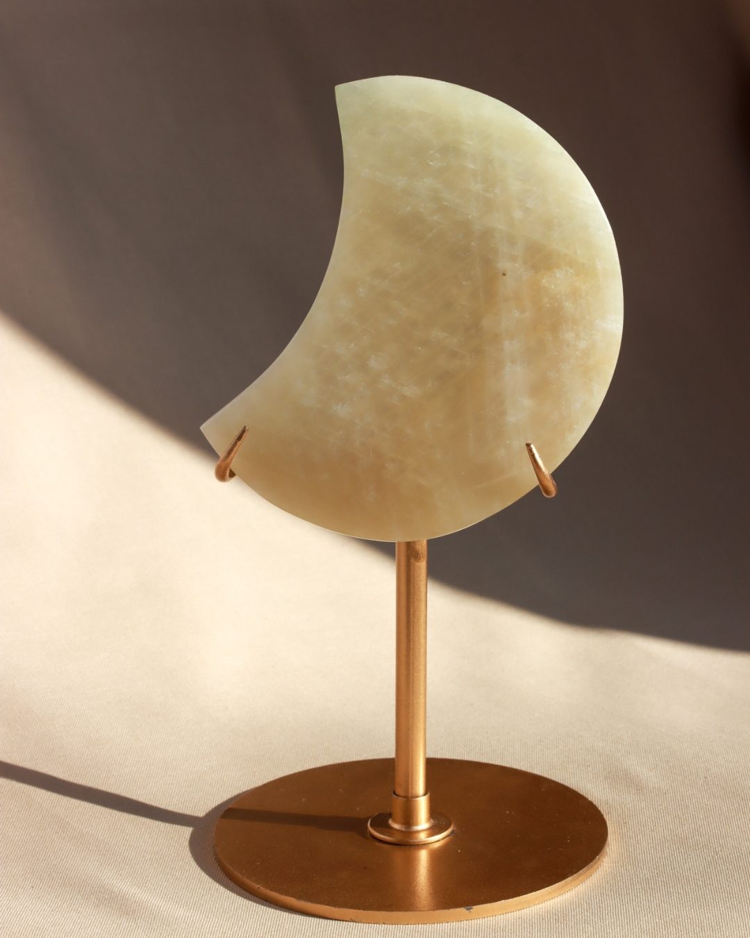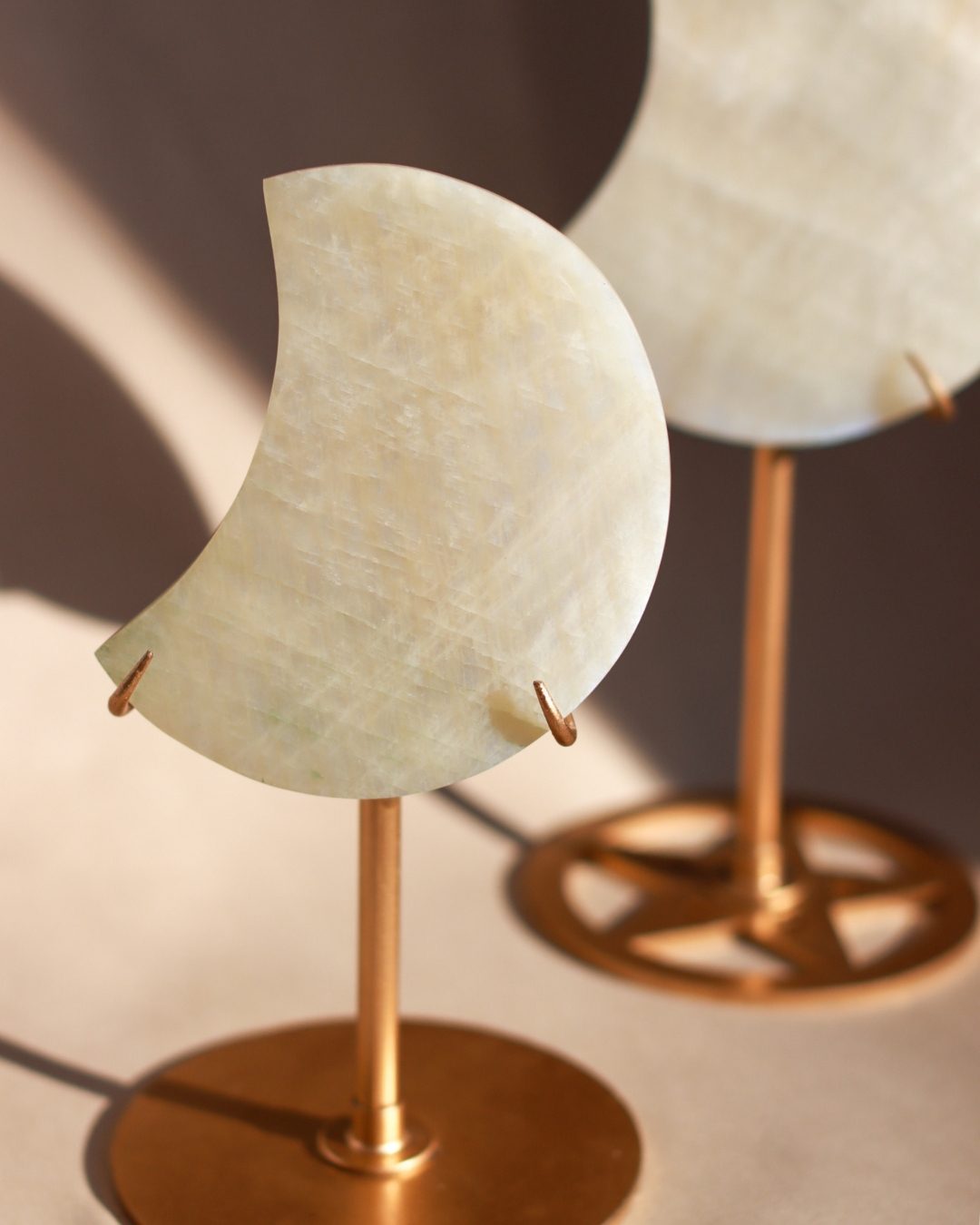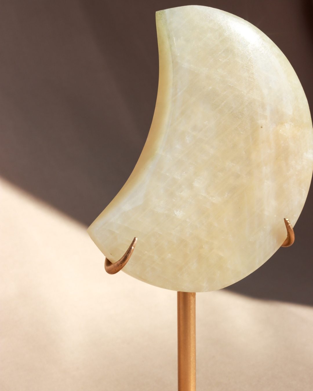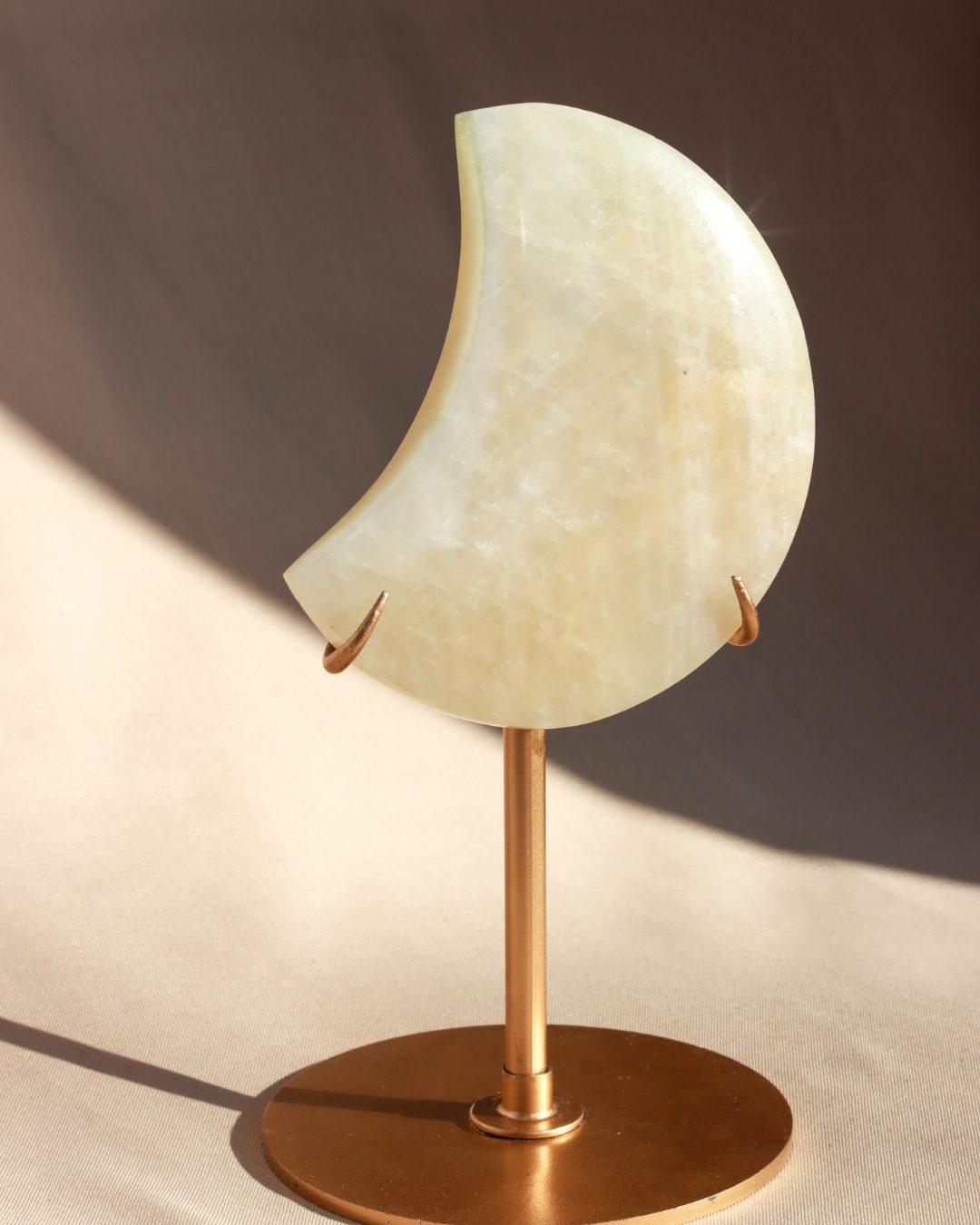 Unieke maansteen in maanvorm op standaard met de typische maansteen glow (adularescentie) die een zachte, blauwe gloed laat zien. Een elegant stuk dat zowel in je interieur als in je kristalcollectie prachtig tot zijn recht komt.