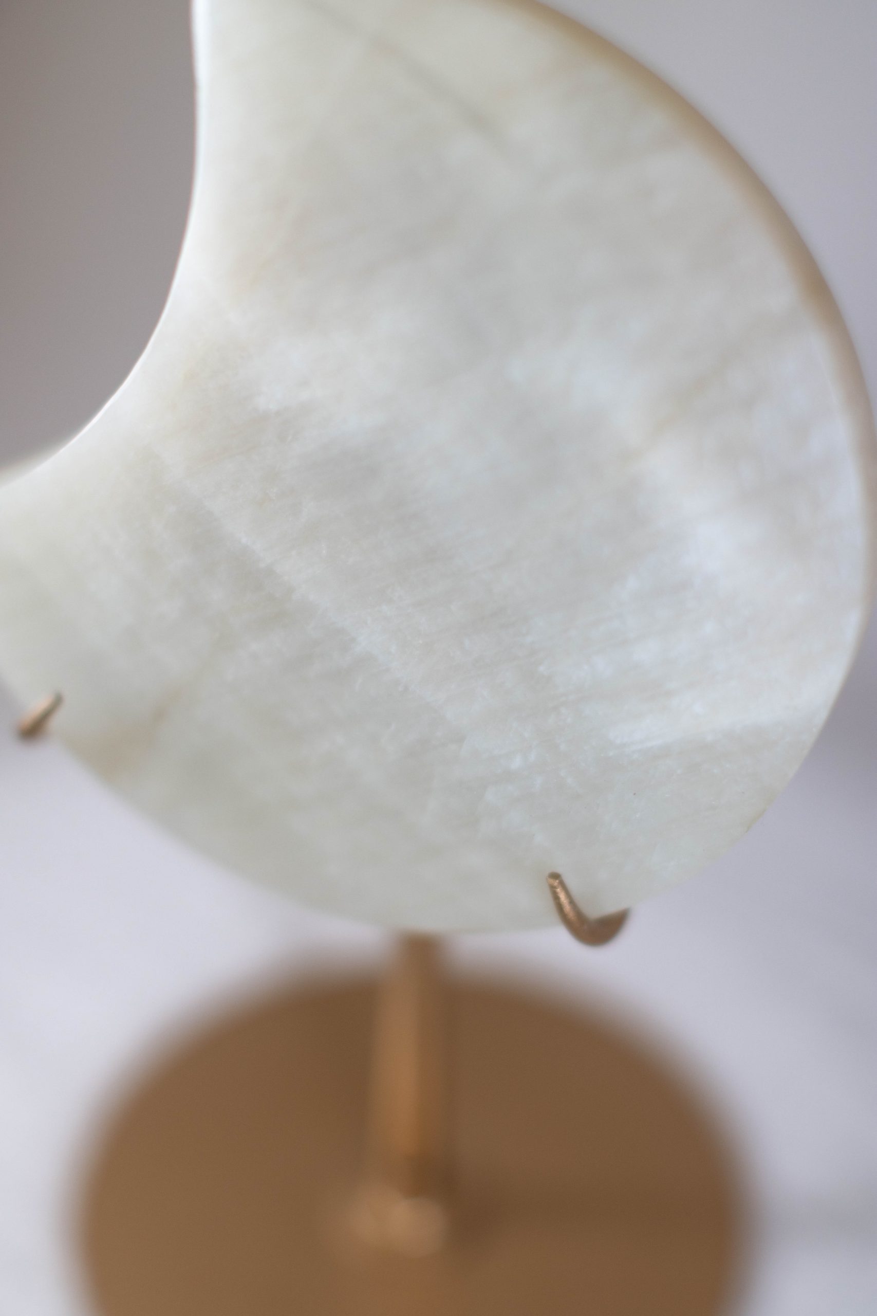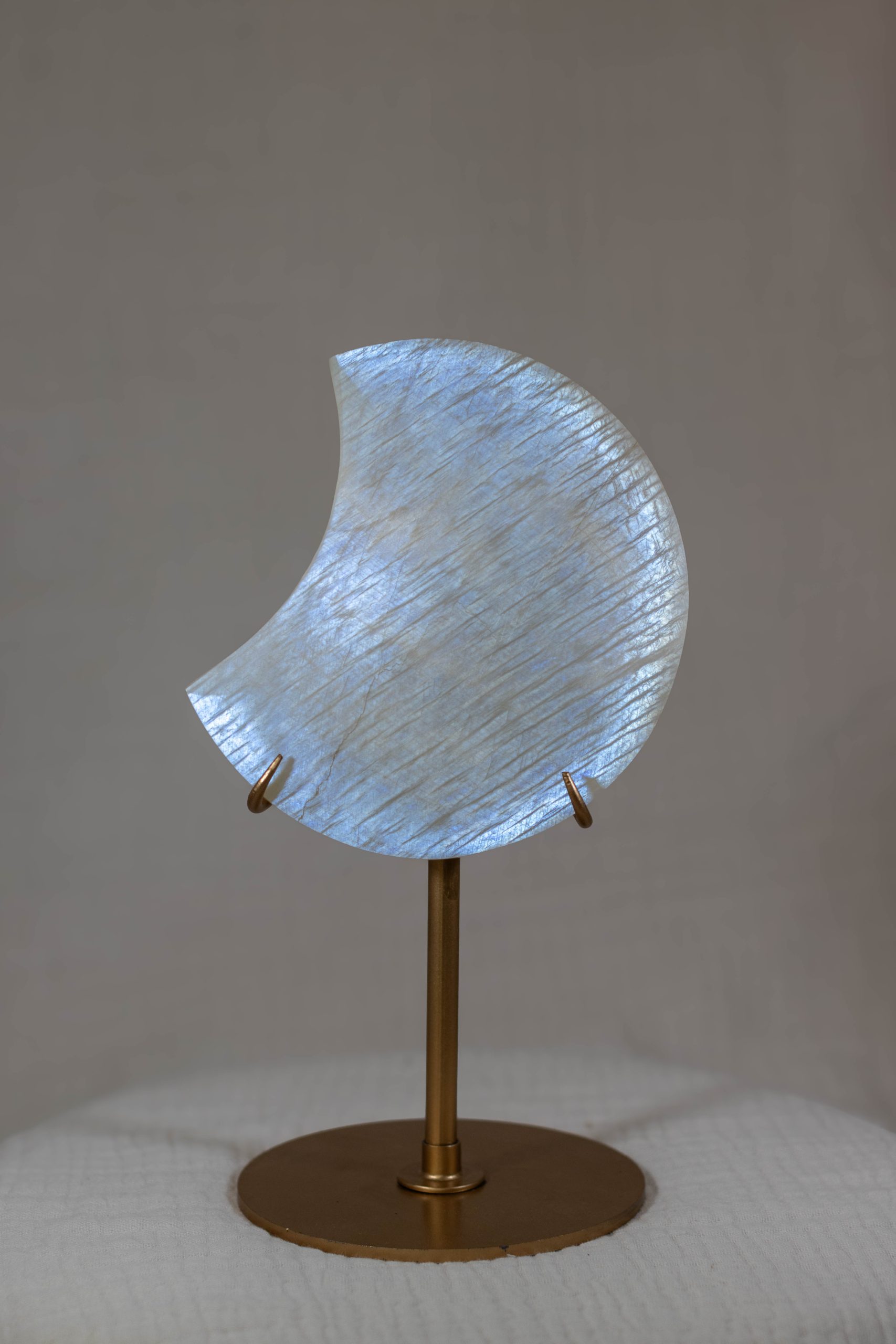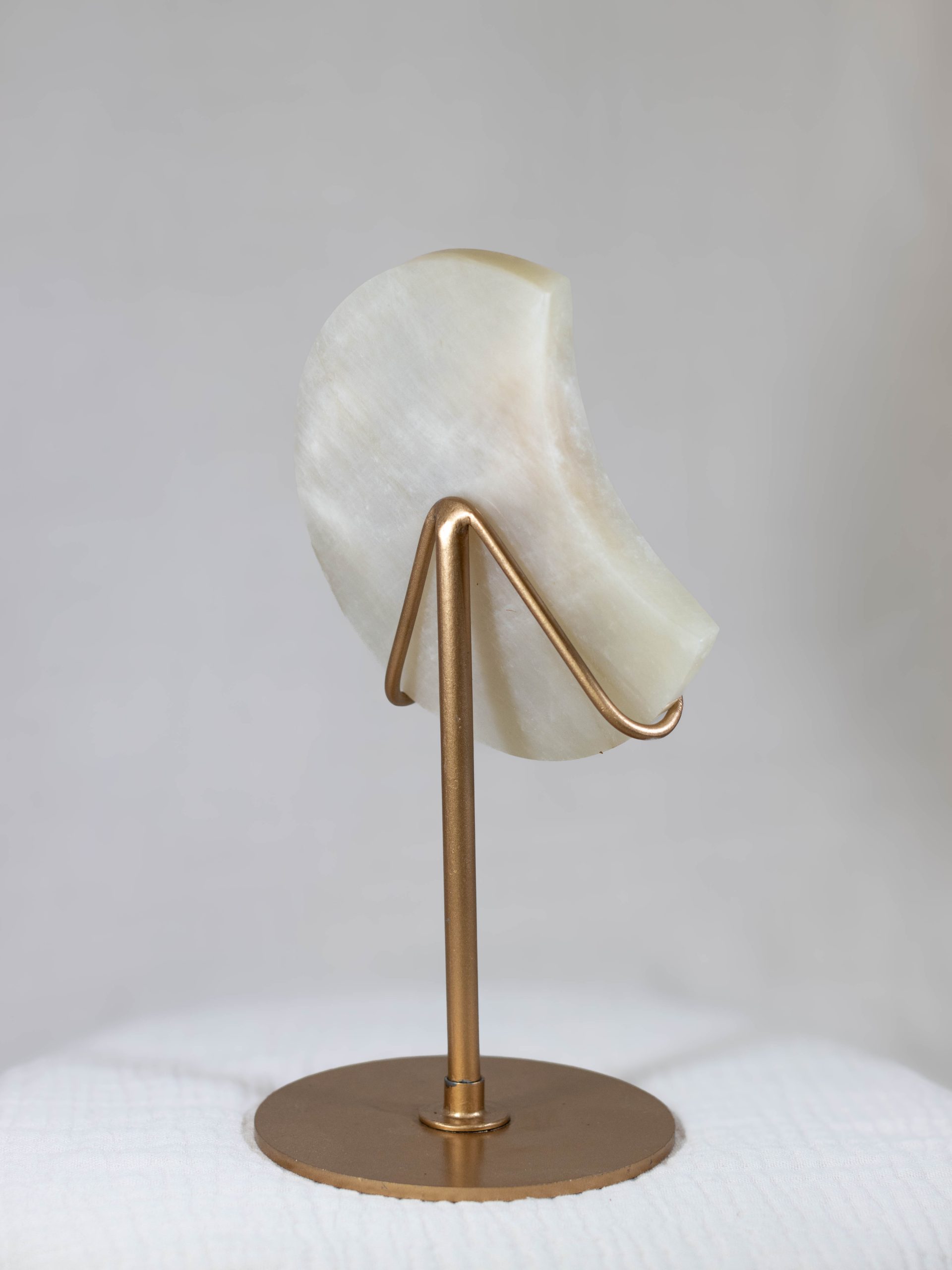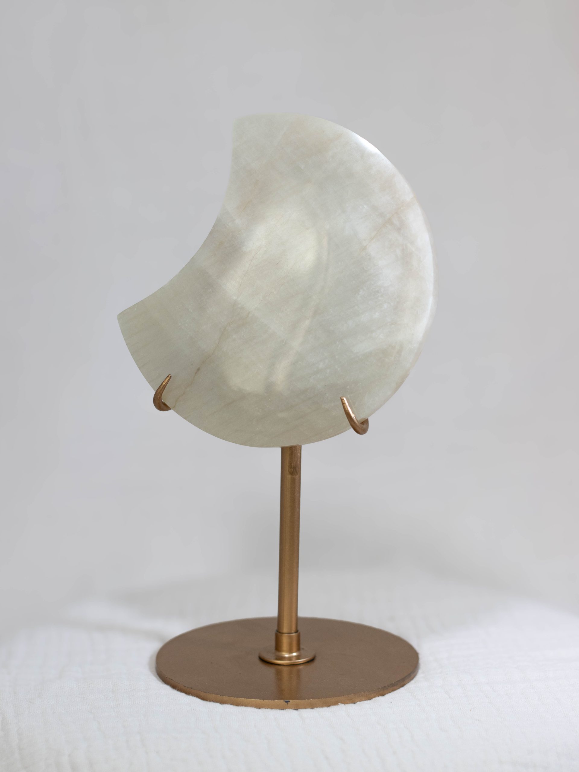Unieke maansteen in maanvorm op standaard met de typische maansteen glow (adularescentie) die een zachte, blauwe gloed laat zien. Een elegant stuk dat zowel in je interieur als in je kristalcollectie prachtig tot zijn recht komt.