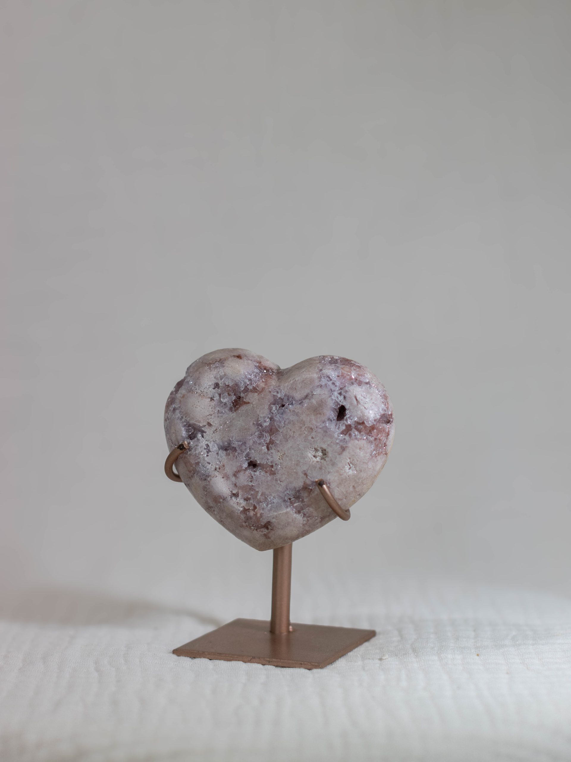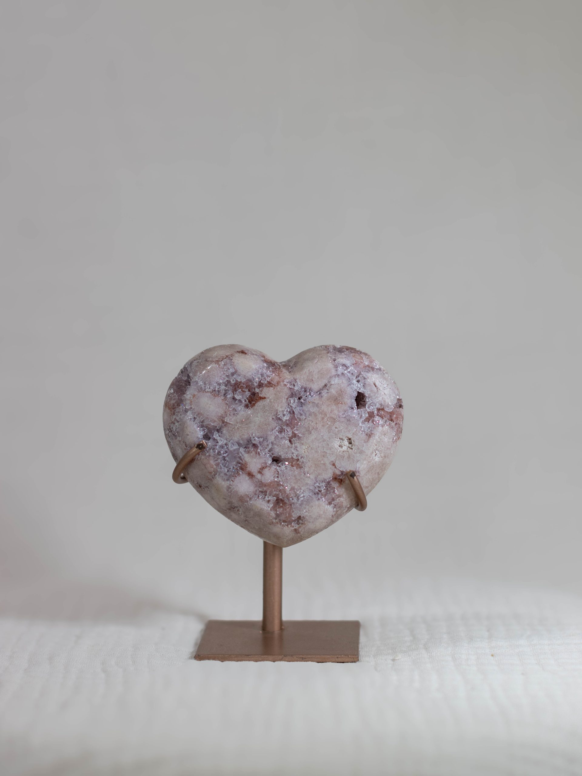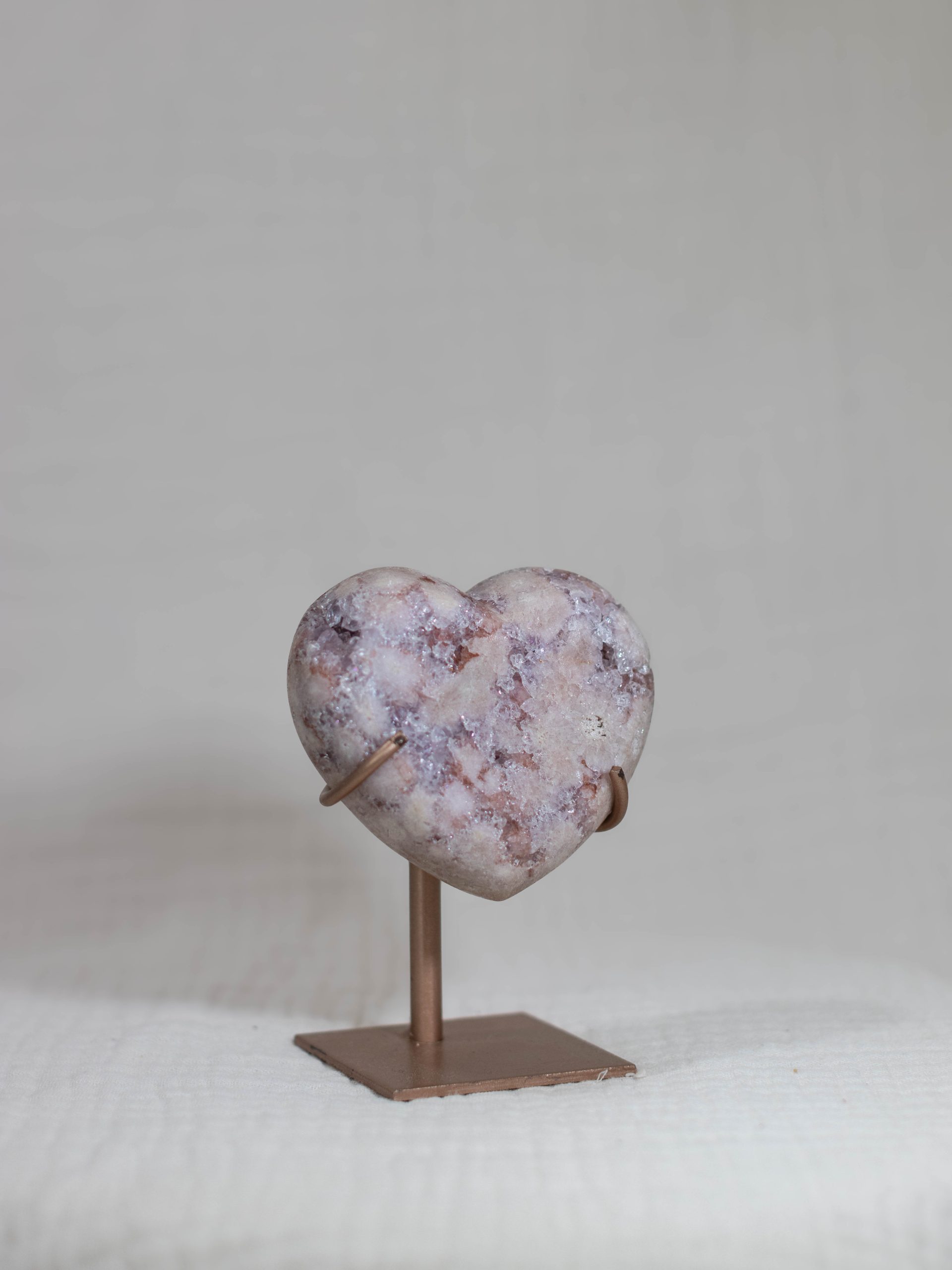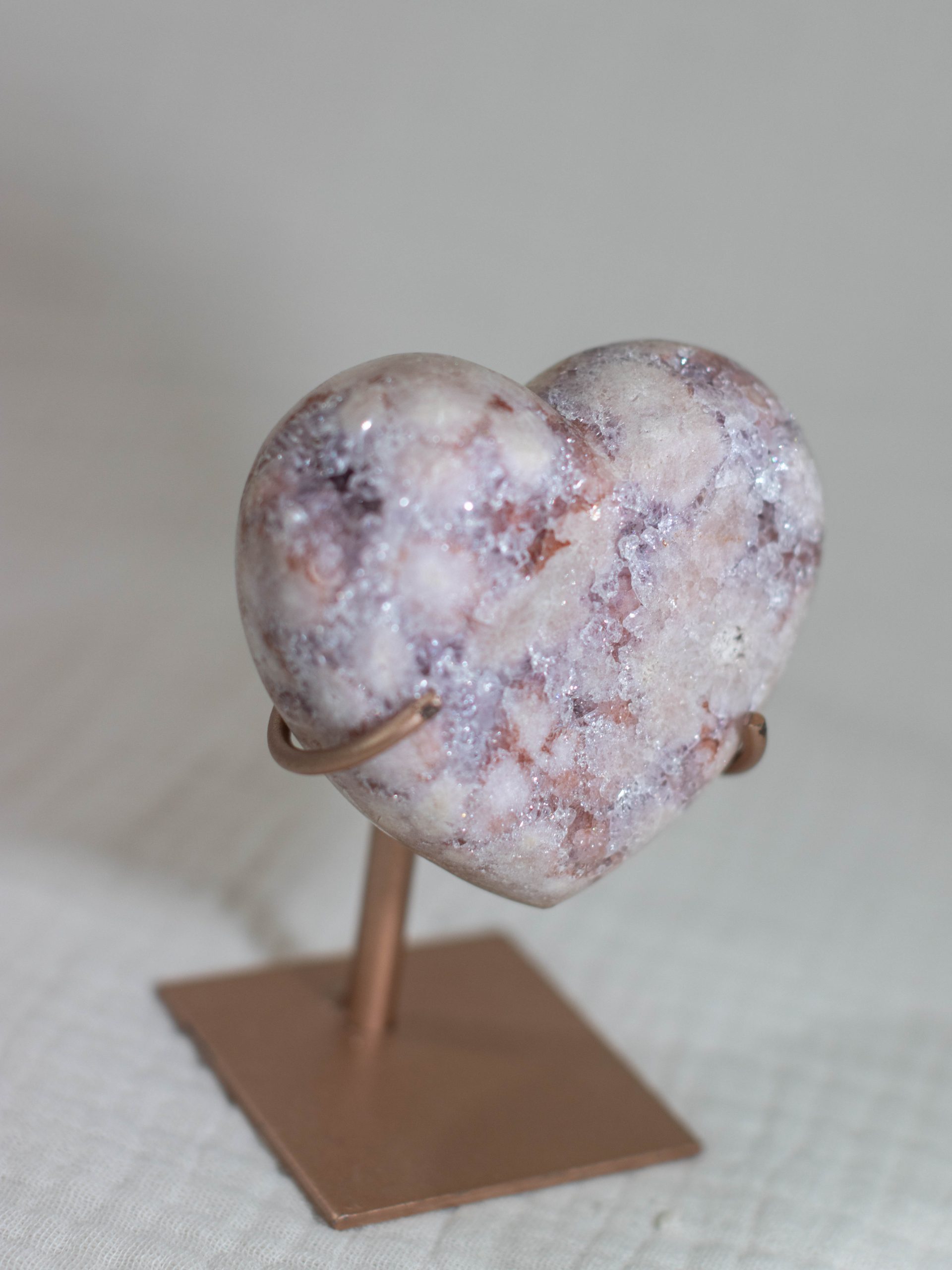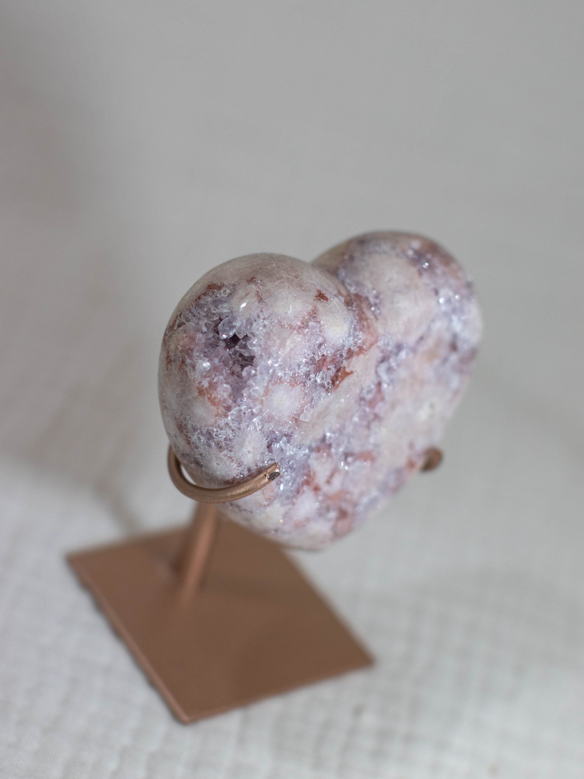 Dit prachtige roze amethist hart bevat alle zachte kleuren waar je bij deze edelsteen blij van wordt. De poederroze tinten met paarse insluitingen en dieproze patronen maken dit een zeldzaam exemplaar van hoge kwaliteit