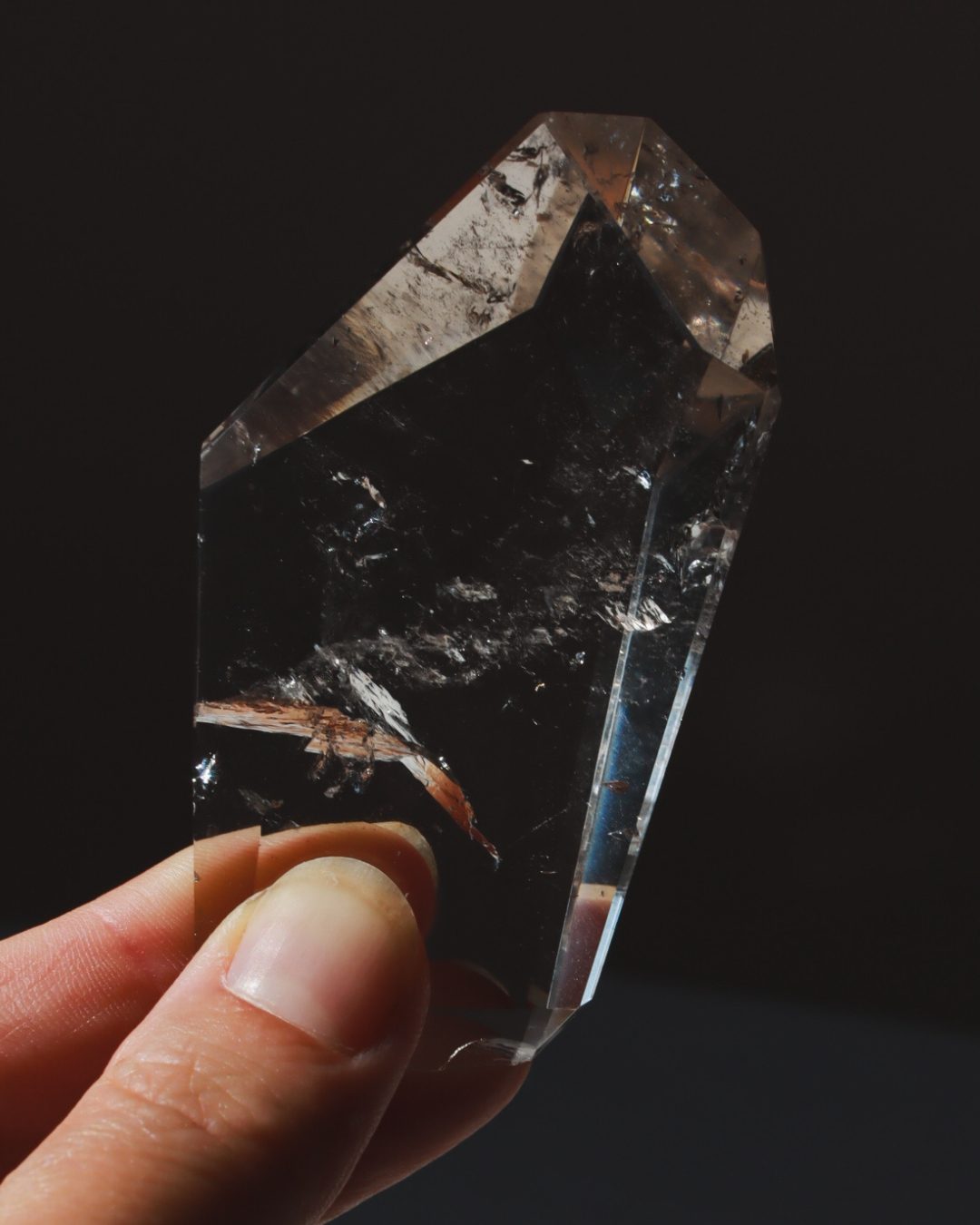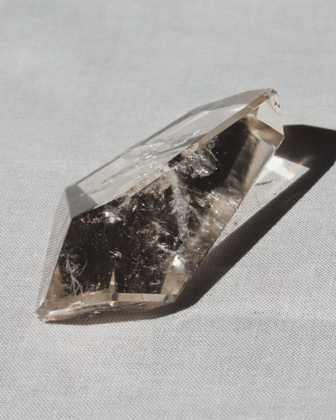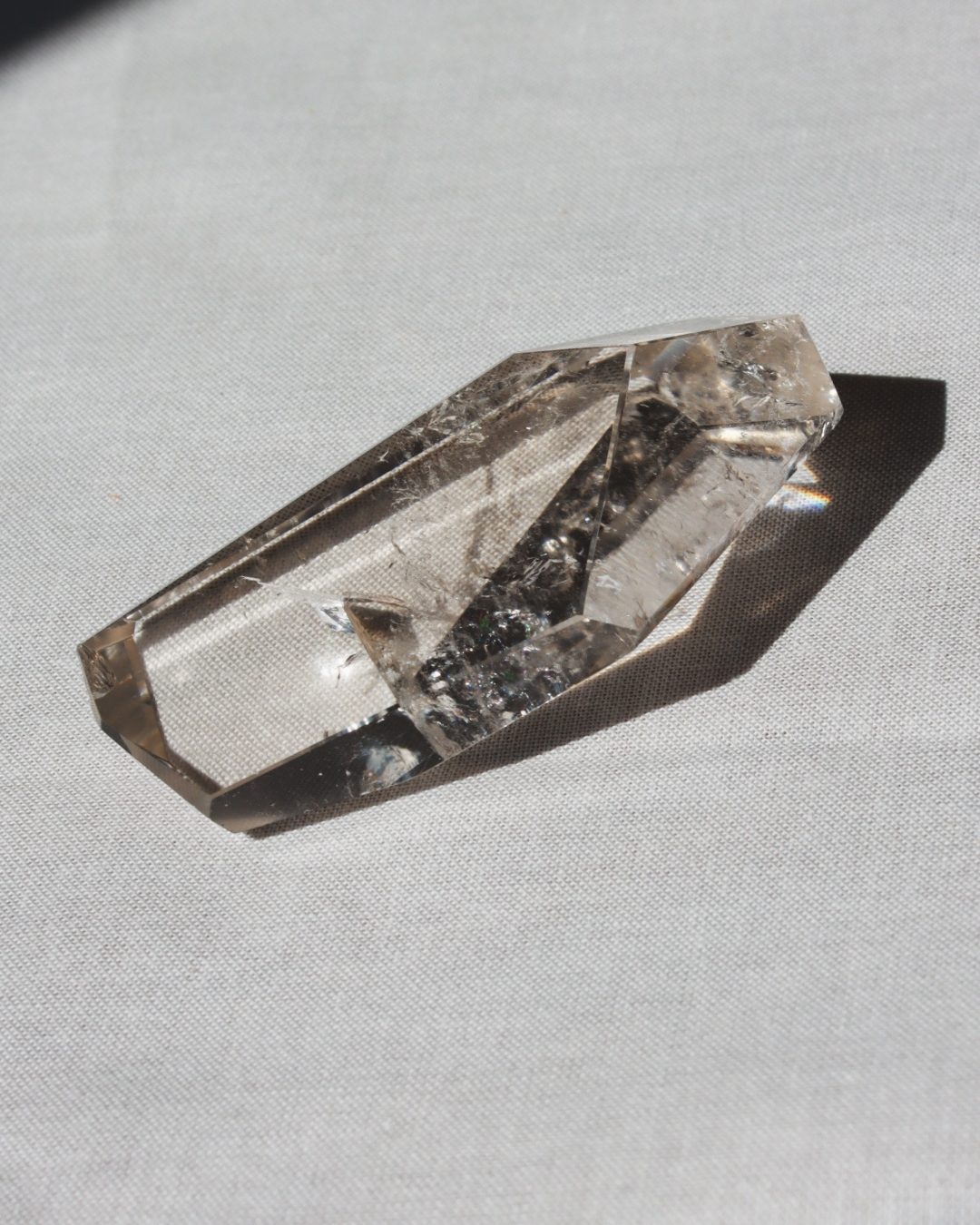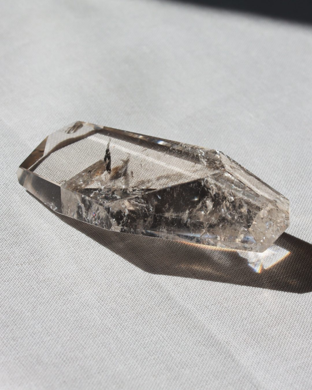 Bijna transparante rookkwarts in vrije vorm, met een zuiver en lichte uitstraling en subtiele natuurlijke insluitingen. De fijne lijntjes aan de binnenkant maken elk exemplaar uniek en tonen de natuurlijke vorming en geschiedenis van het kristal.