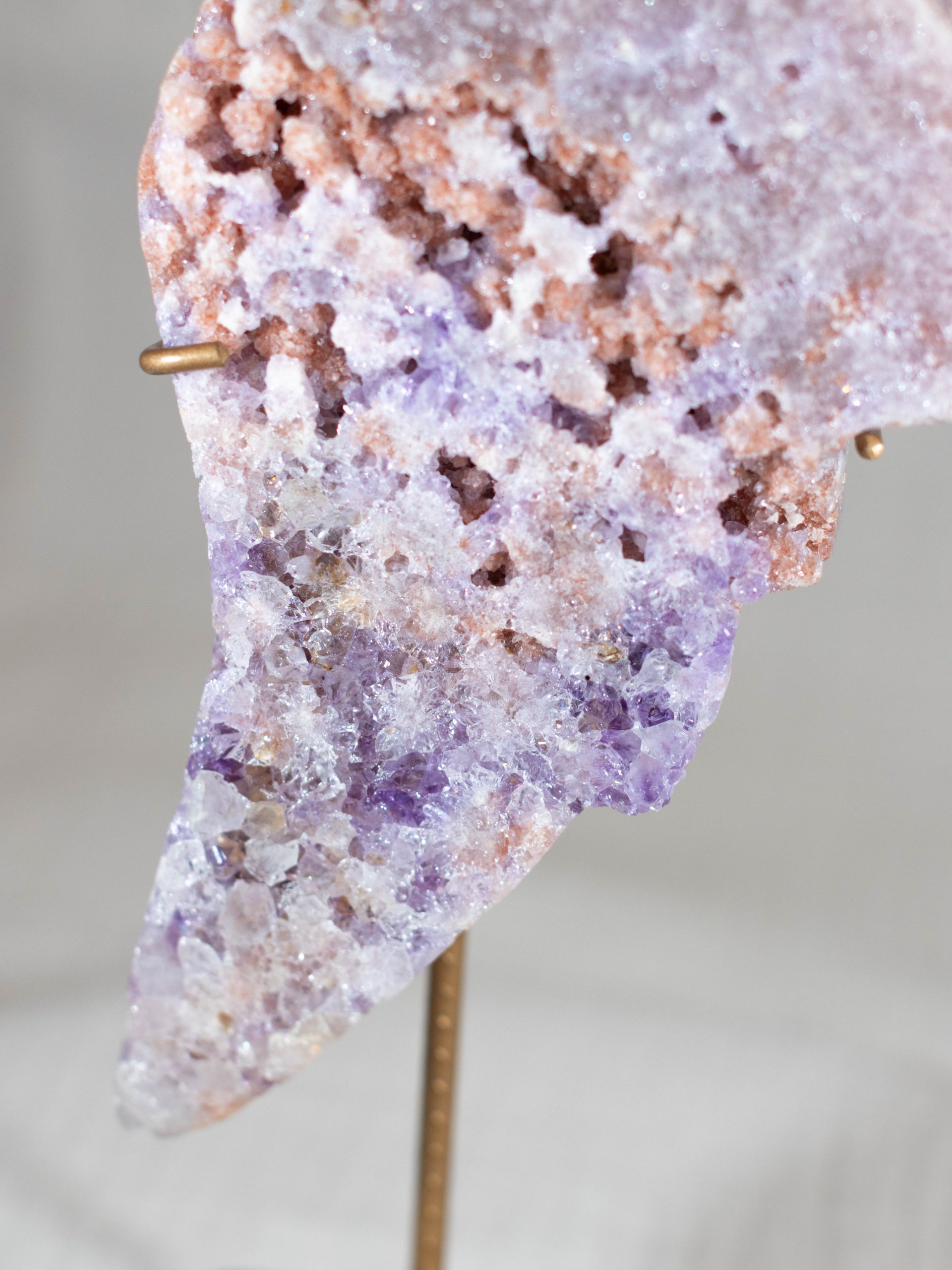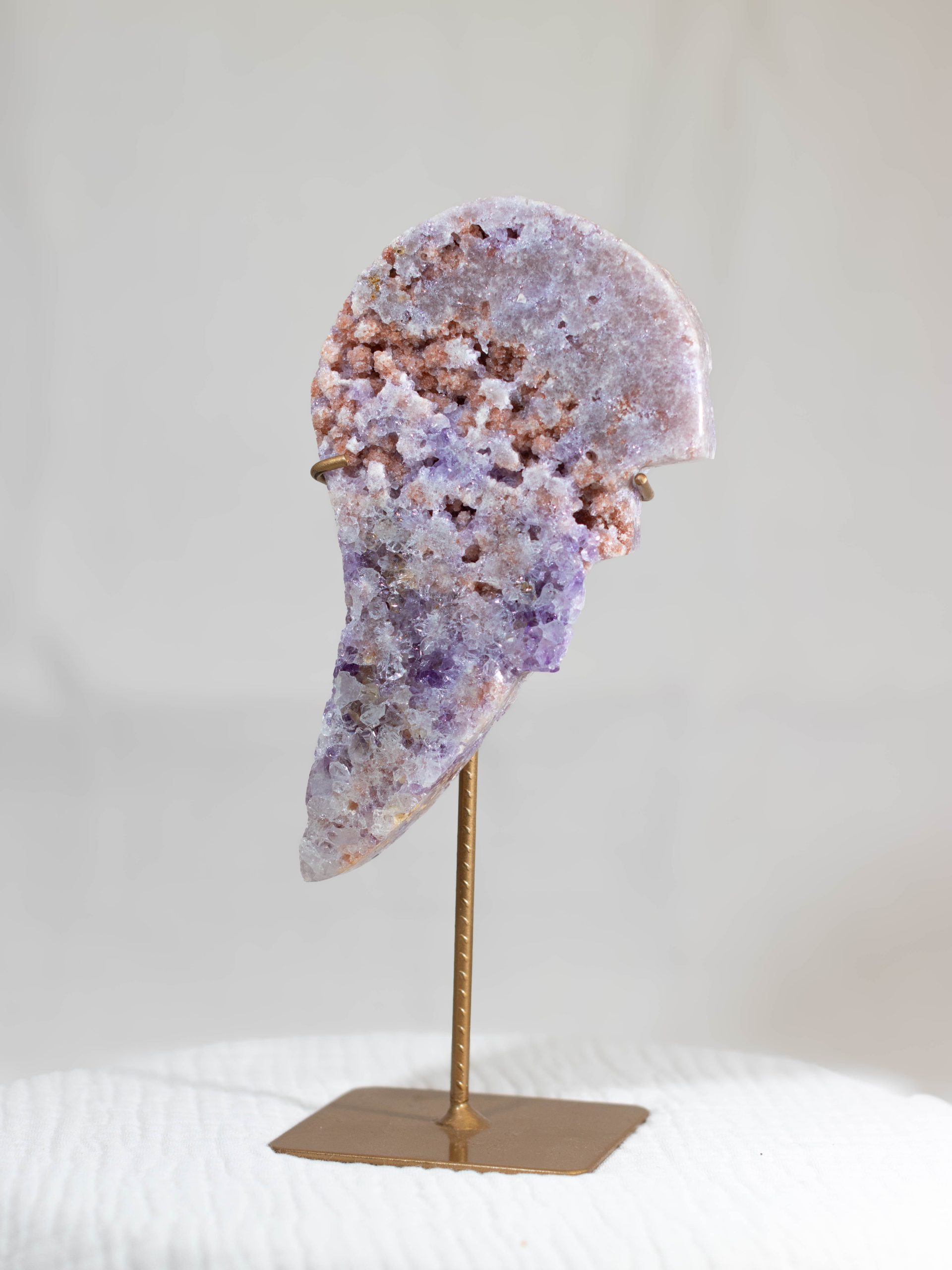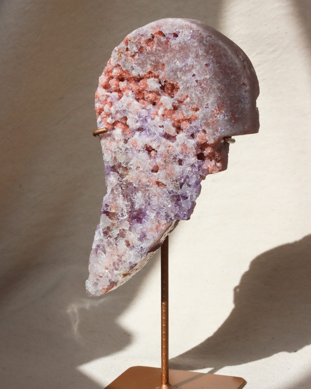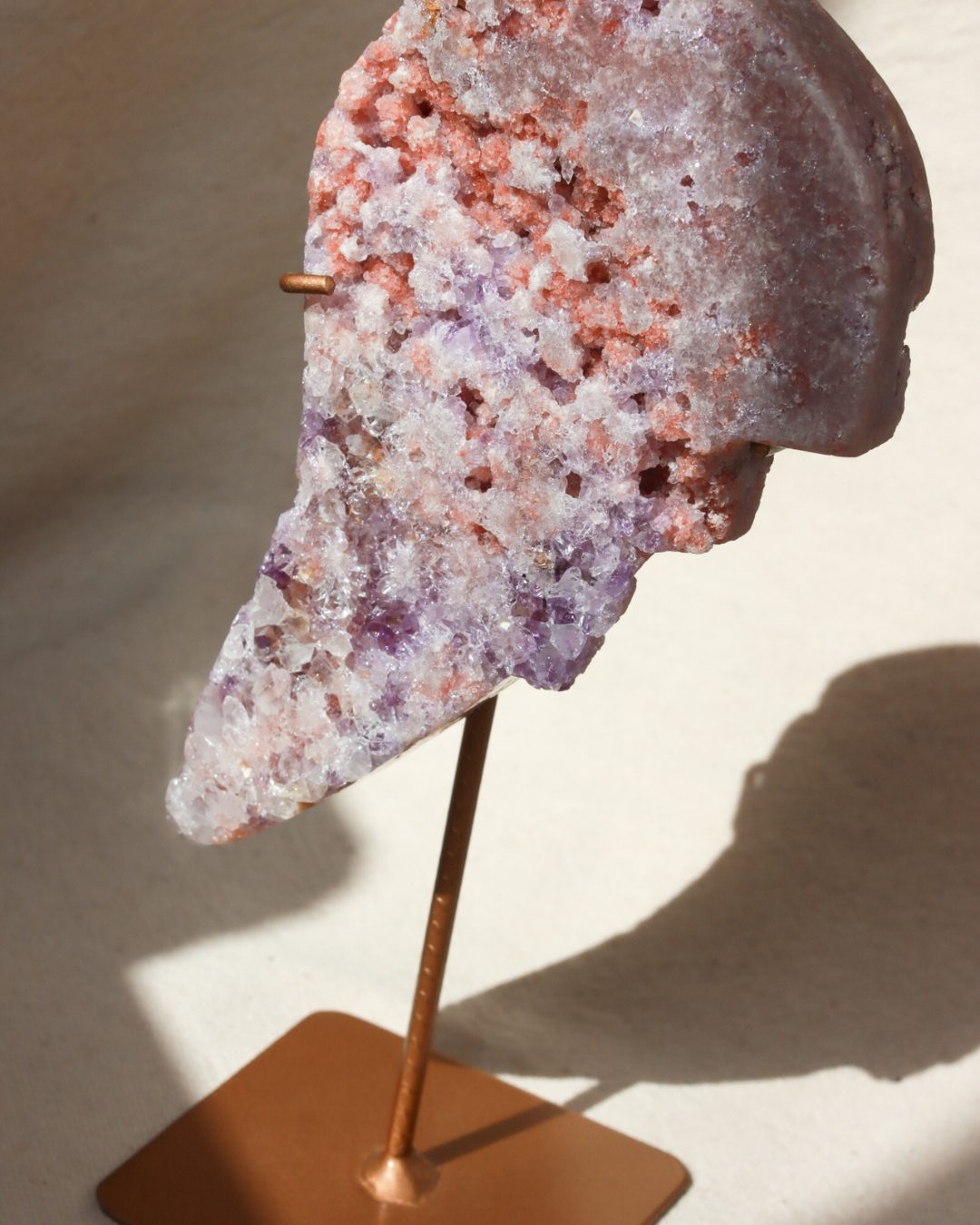 Een betoverende roze amethist angel wing in de vorm van een engelenvleugel. De zachtroze en paarse tinten komen prachtig samen met natuurlijke accenten van rood en aardse tinten. Dit geeft het een werkelijk unieke uitstraling. De complexe druzy details vangen het licht, waardoor dit een opvallend statement piece is voor je collectie en interieur.