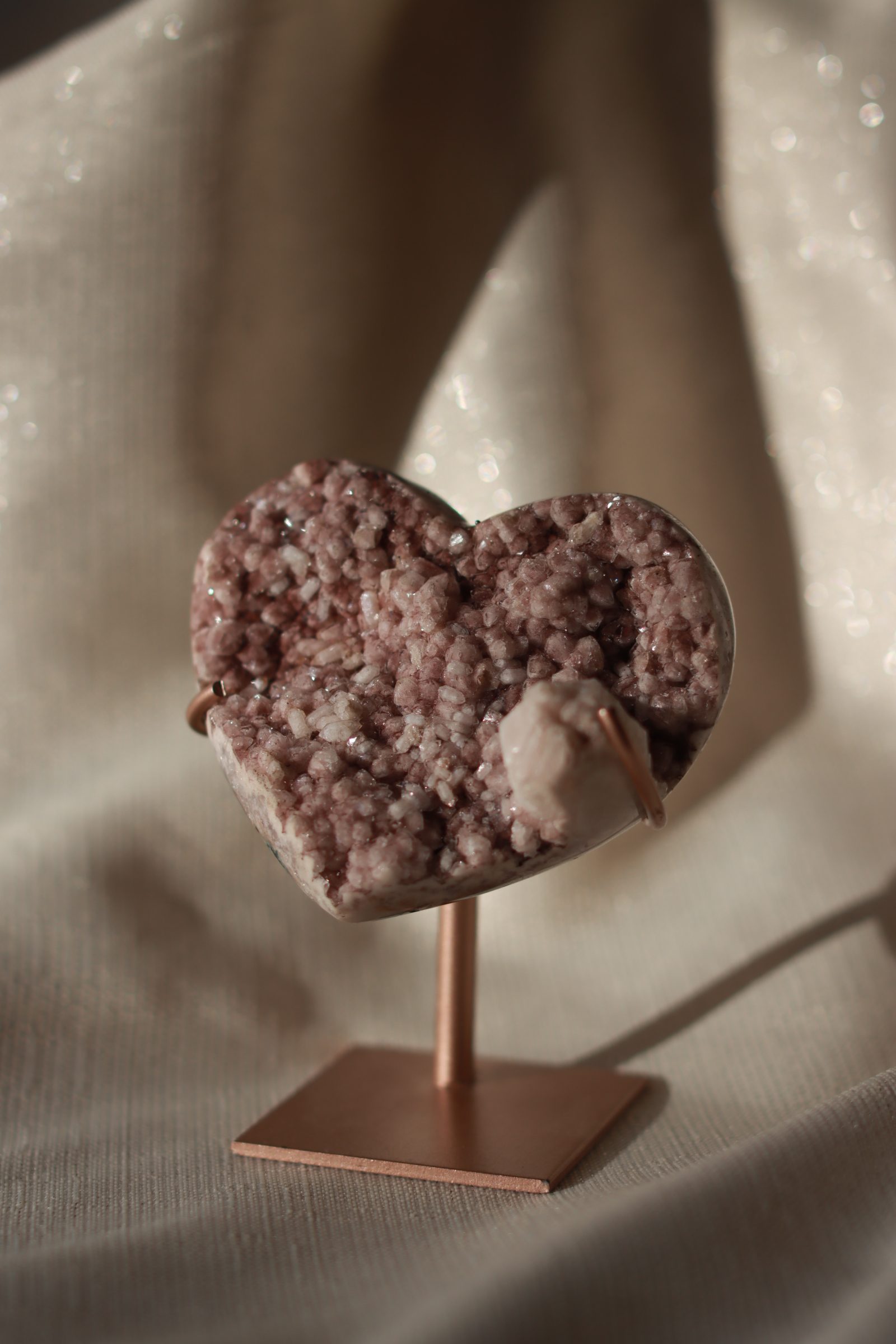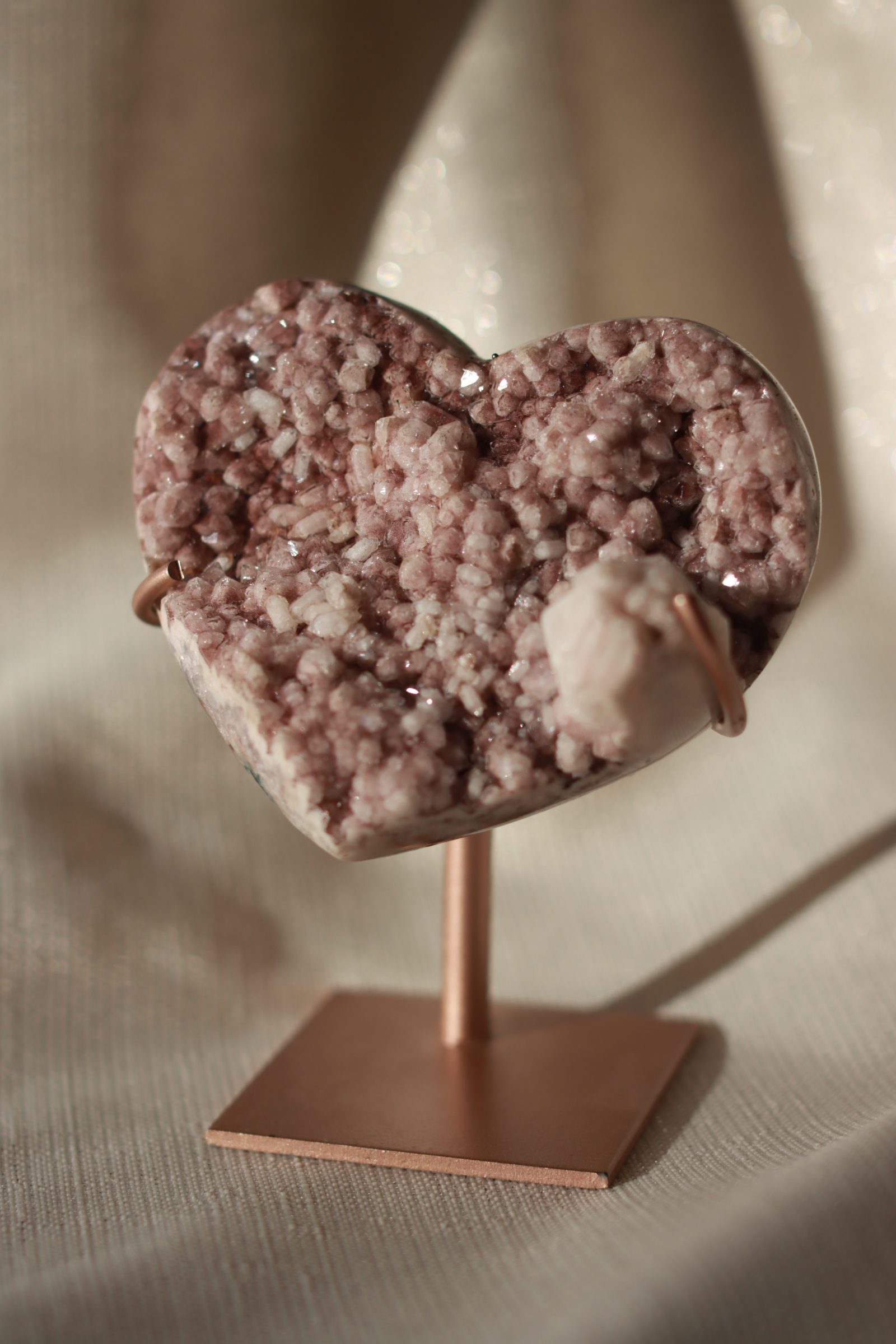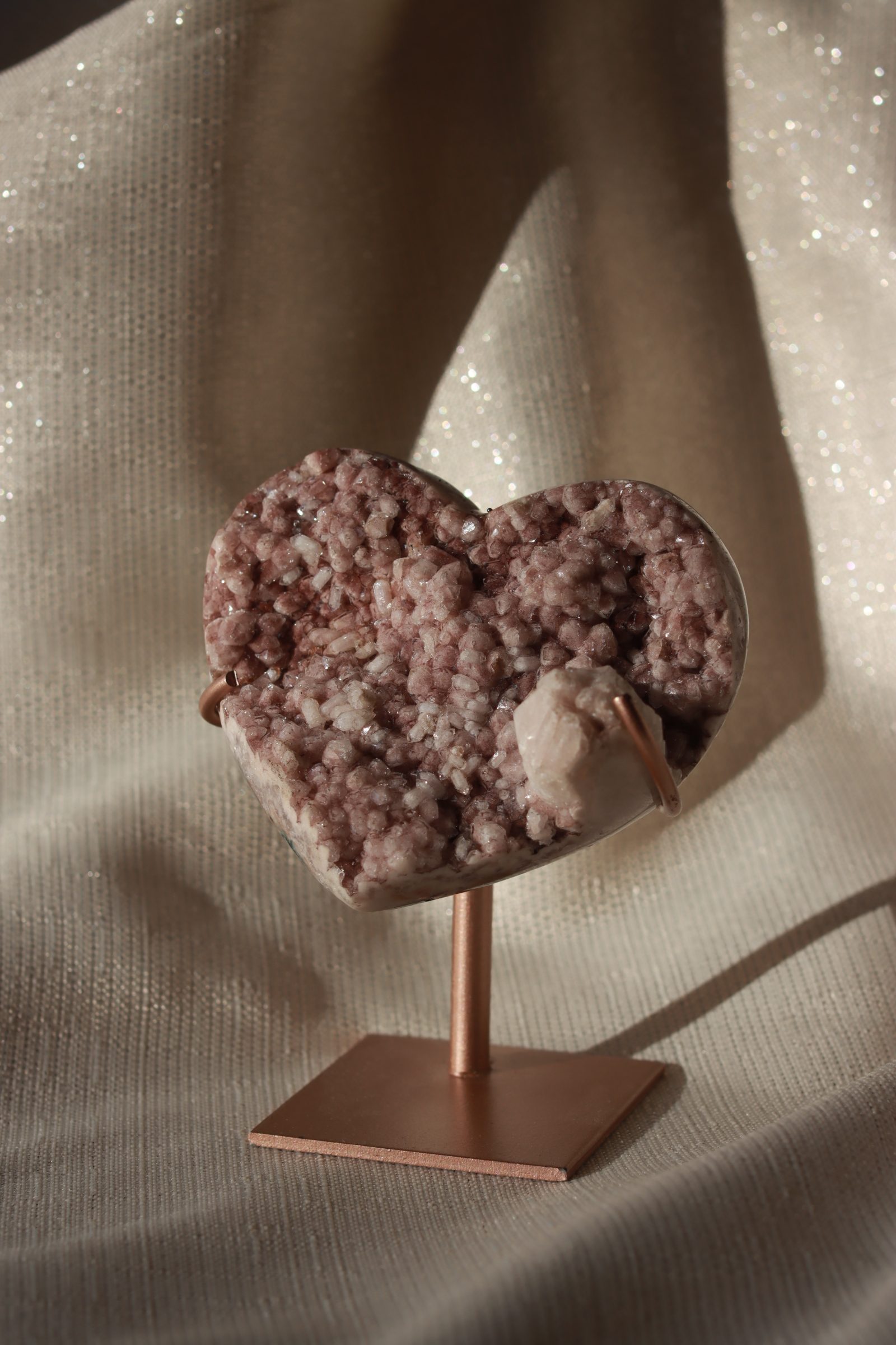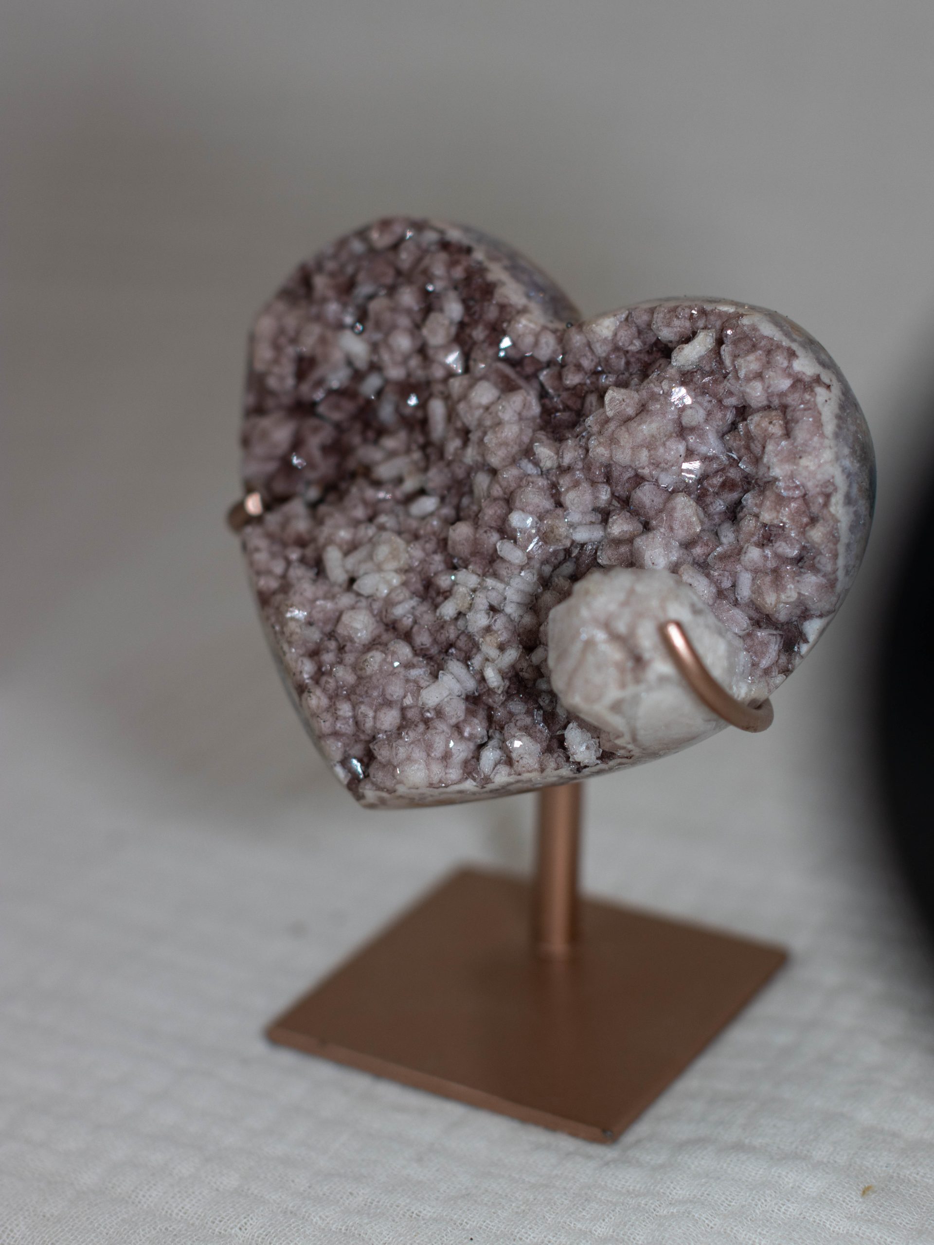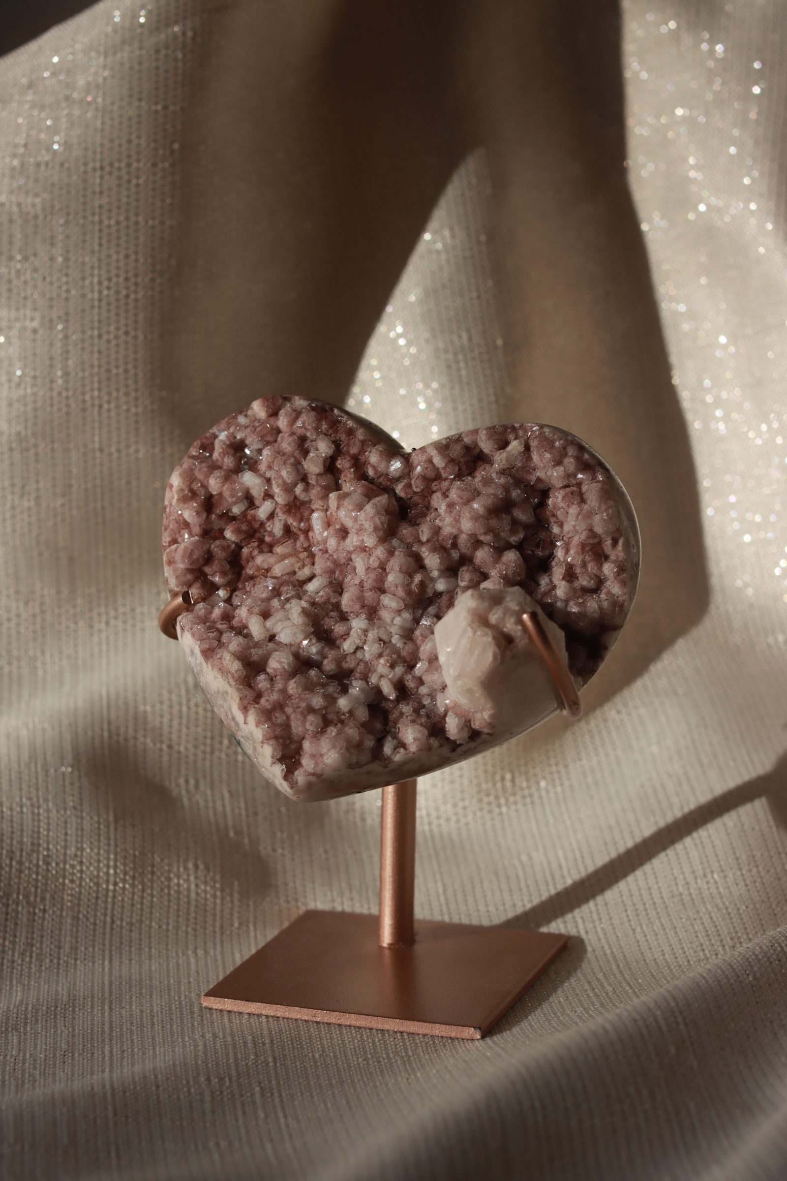 Dit prachtige hart van roze amethist trekt de aandacht met zijn glinsterende kristalpunten, met één speciaal punt dat zich onderscheidt van de rest. De zachte paarsroze kleur danst in het licht, waardoor elke kristalformatie schittert. Het is een prachtig sieraad dat zowel natuurlijke charme als elegantie toevoegt aan elke ruimte.
