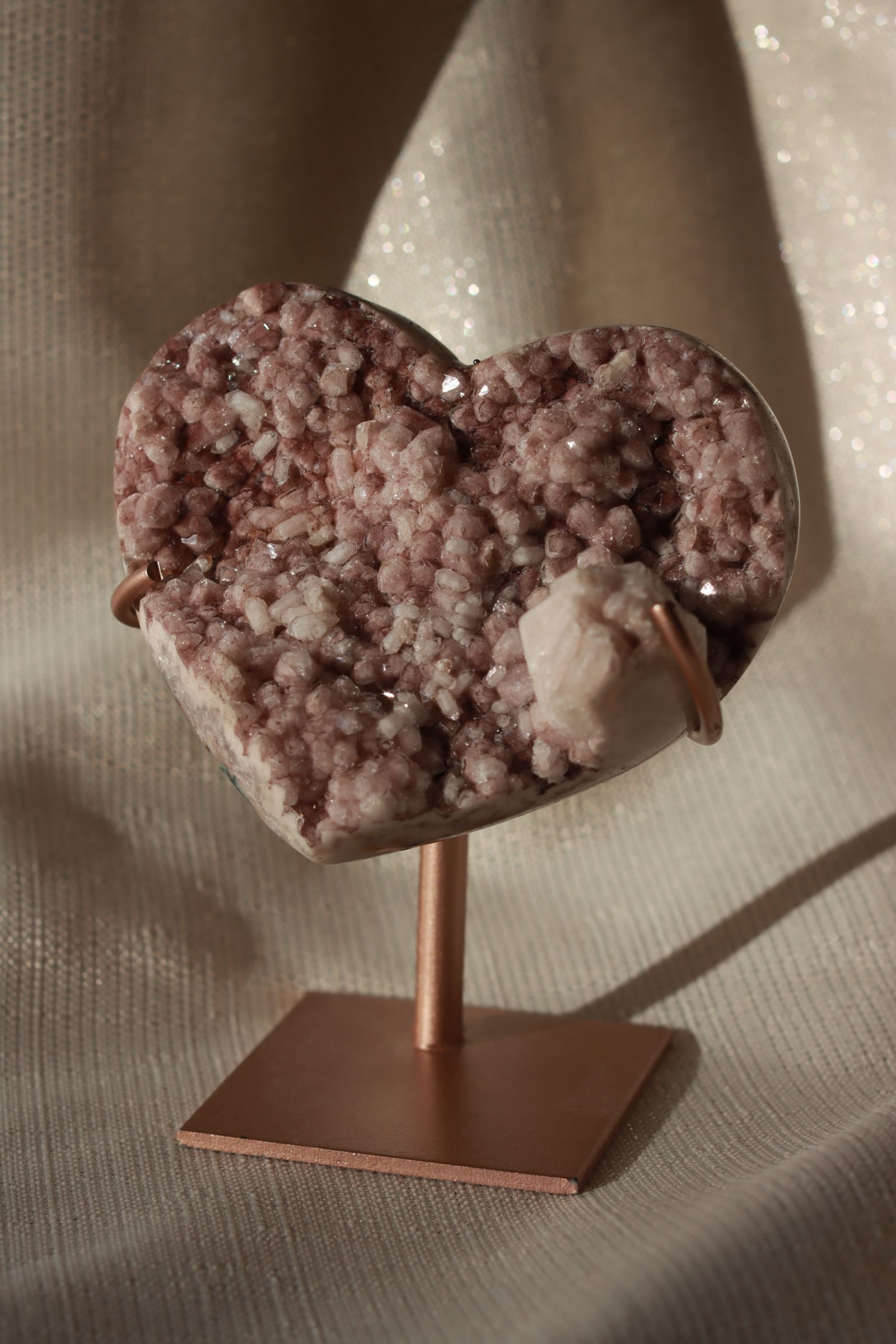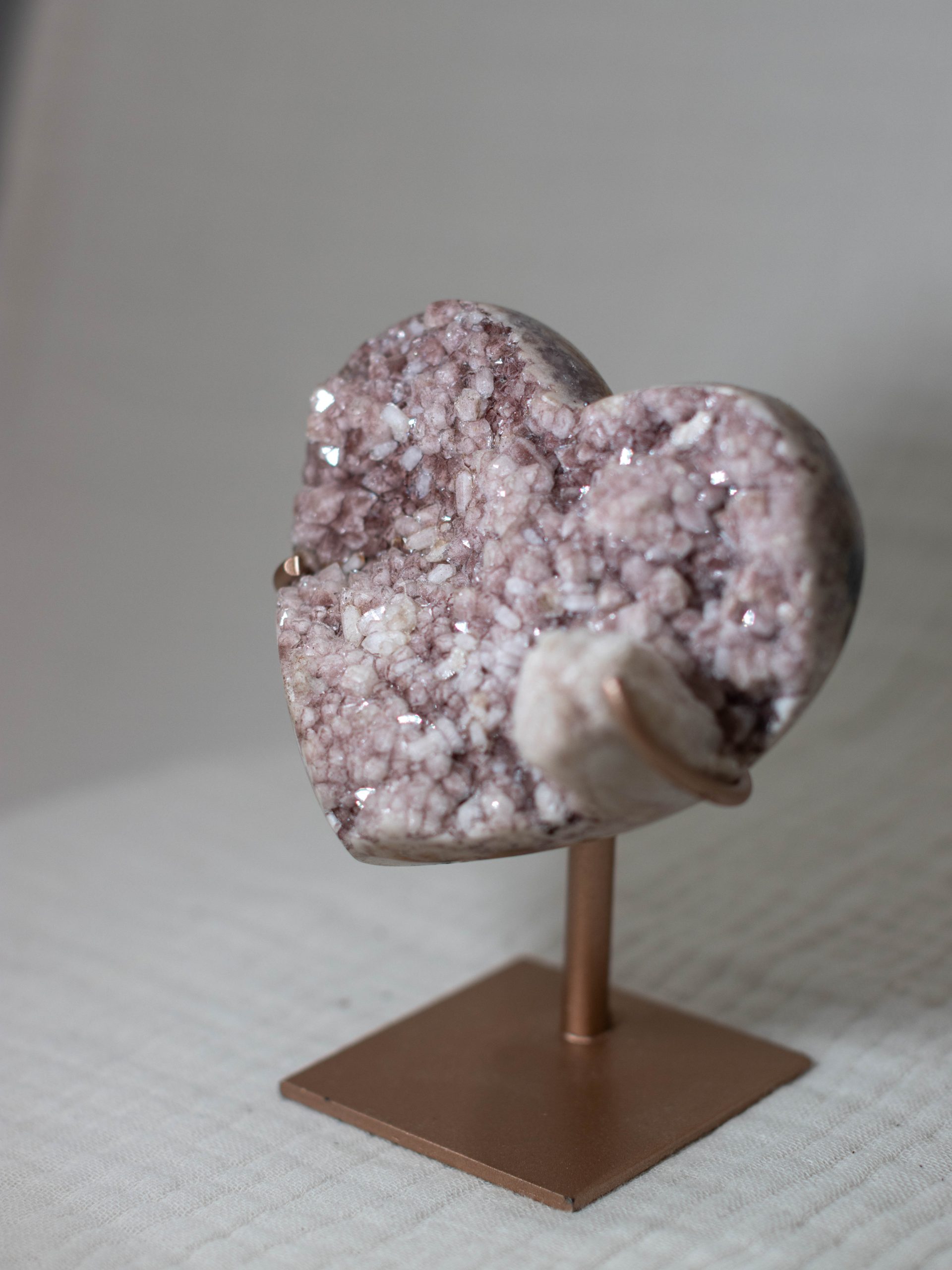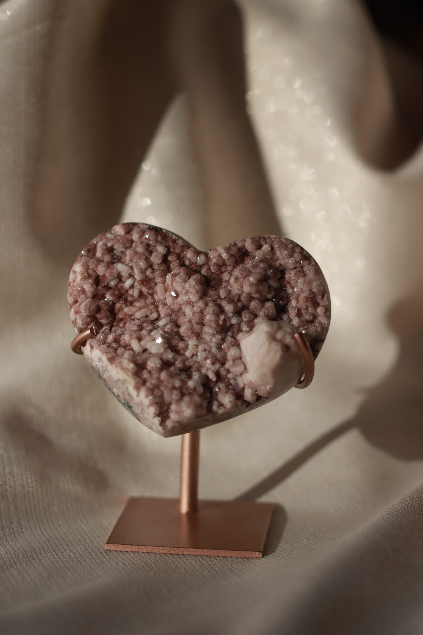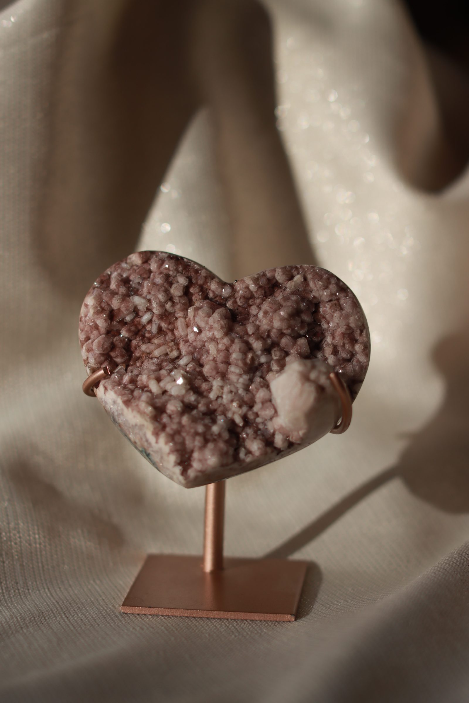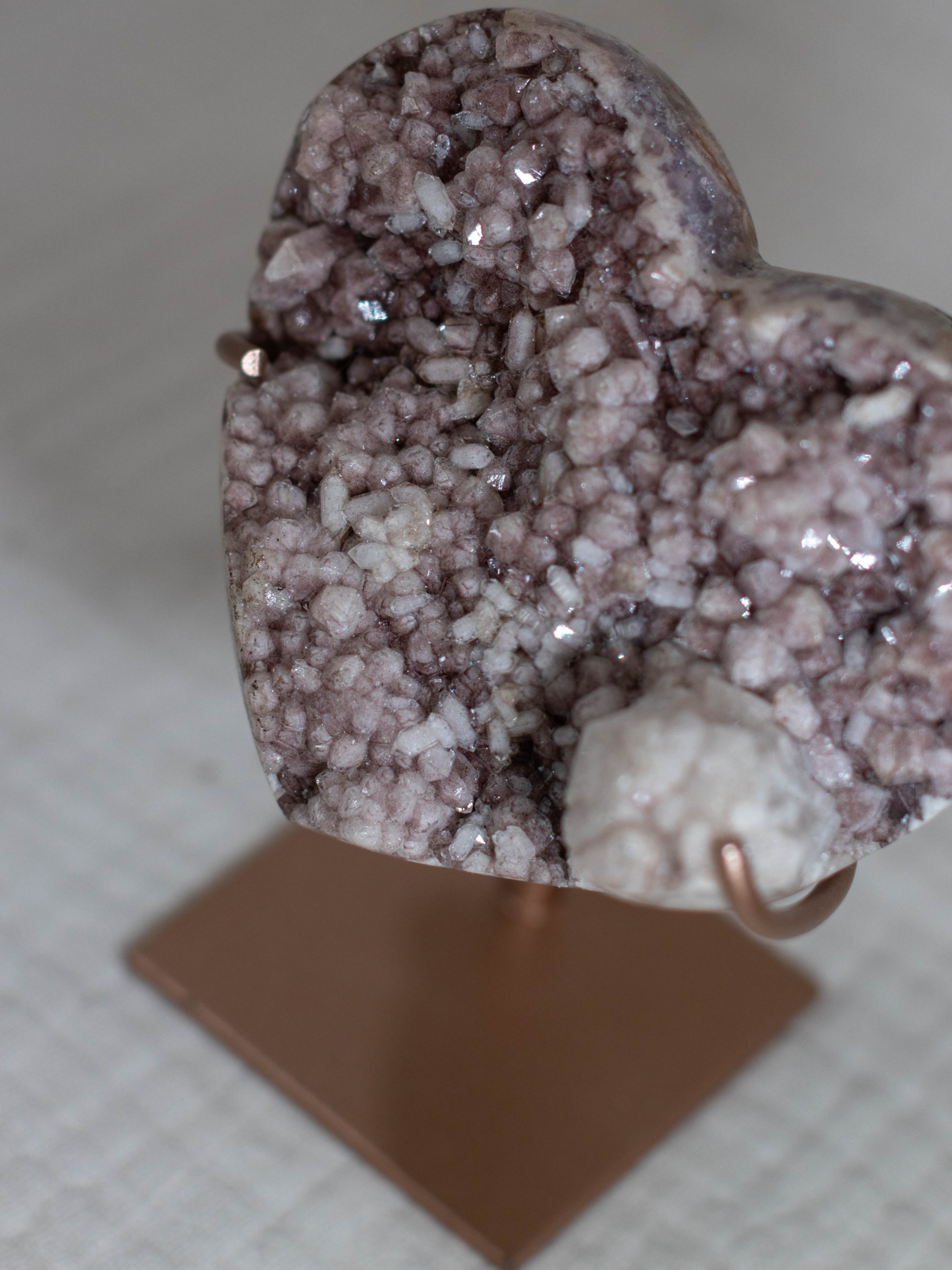 Dit prachtige hart van roze amethist trekt de aandacht met zijn glinsterende kristalpunten, met één speciaal punt dat zich onderscheidt van de rest. De zachte paarsroze kleur danst in het licht, waardoor elke kristalformatie schittert. Het is een prachtig sieraad dat zowel natuurlijke charme als elegantie toevoegt aan elke ruimte.