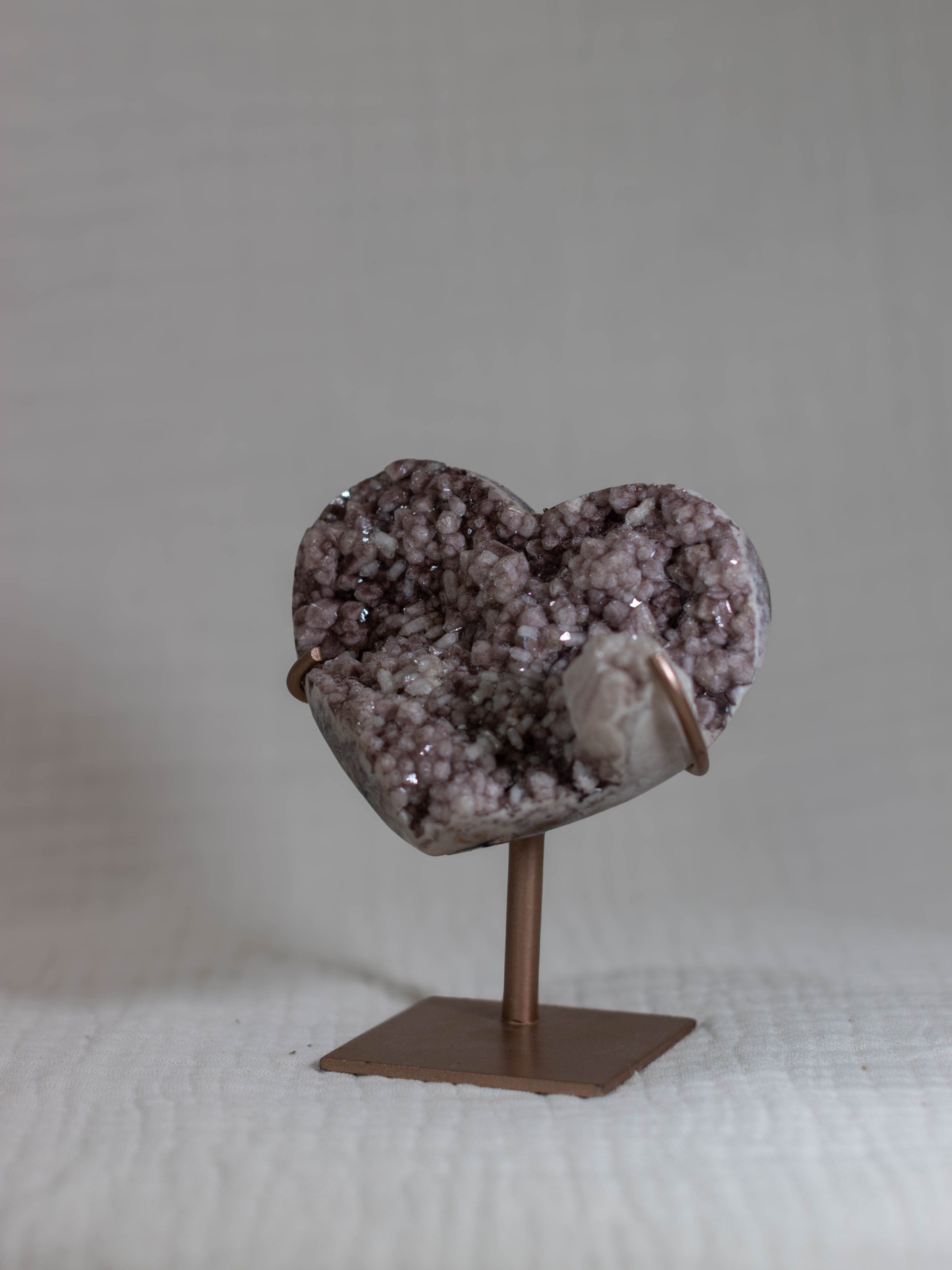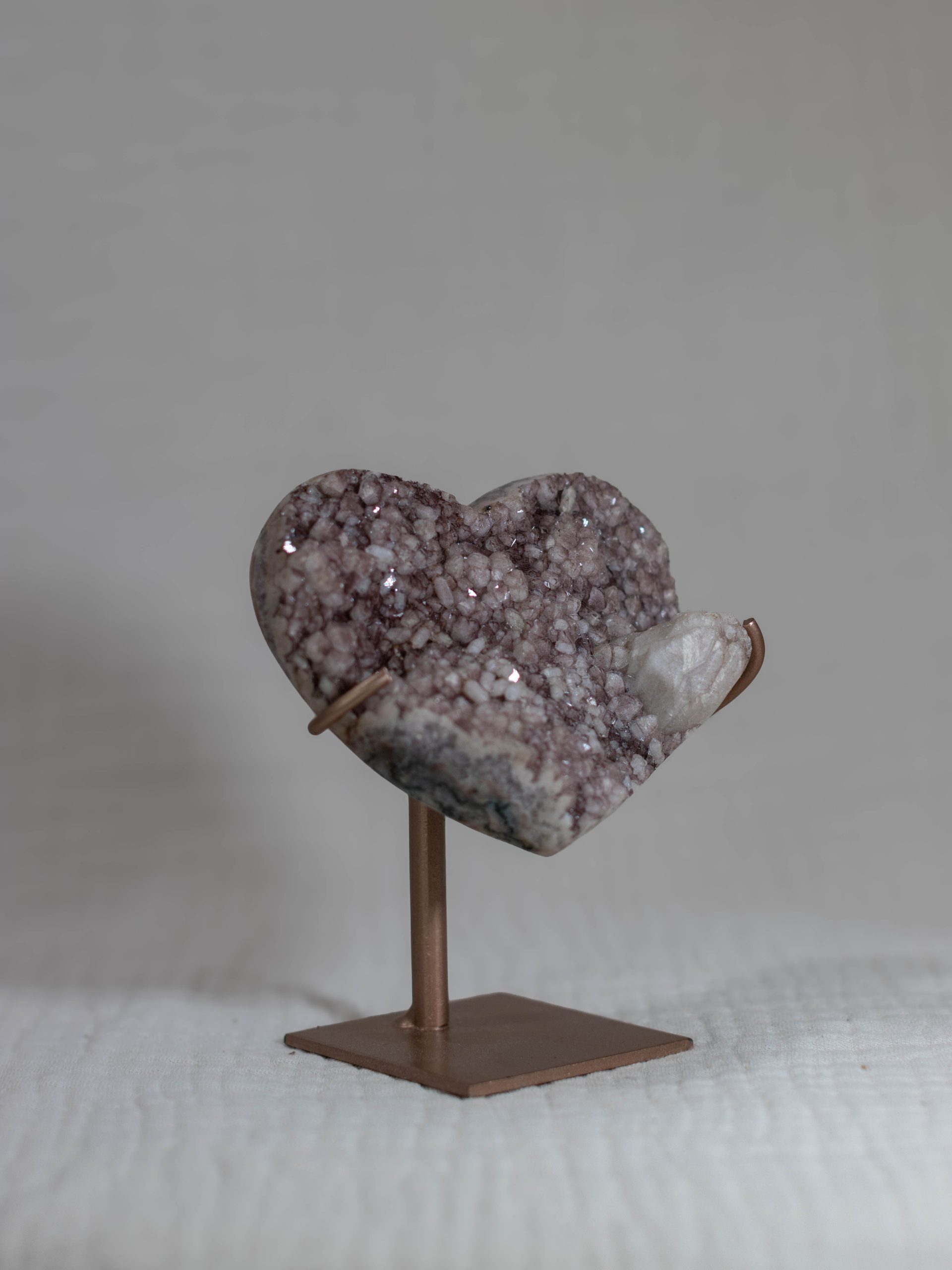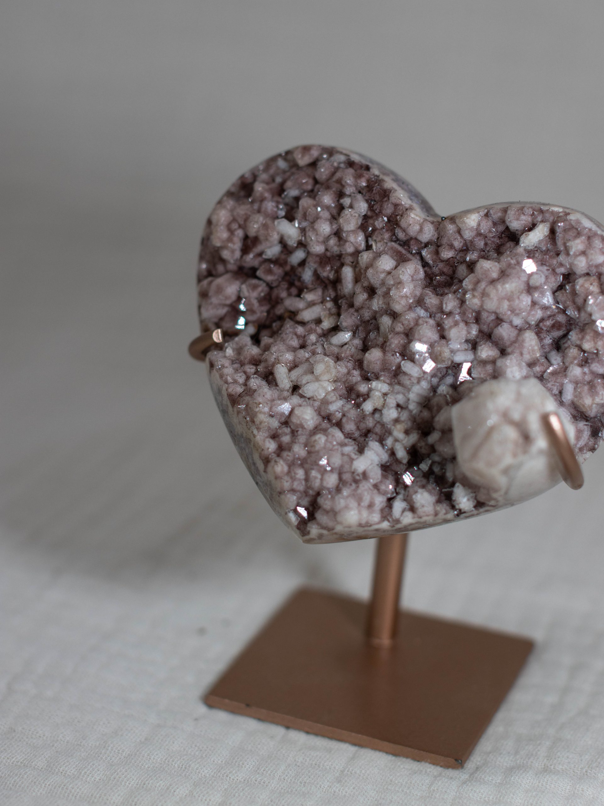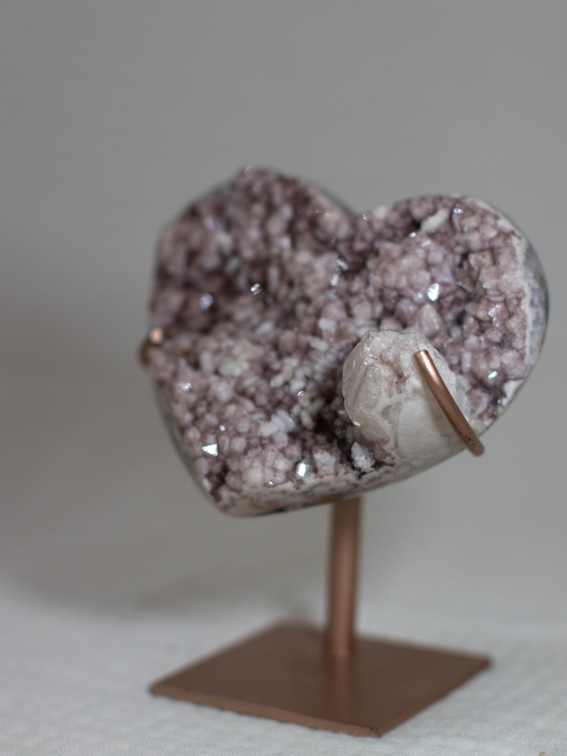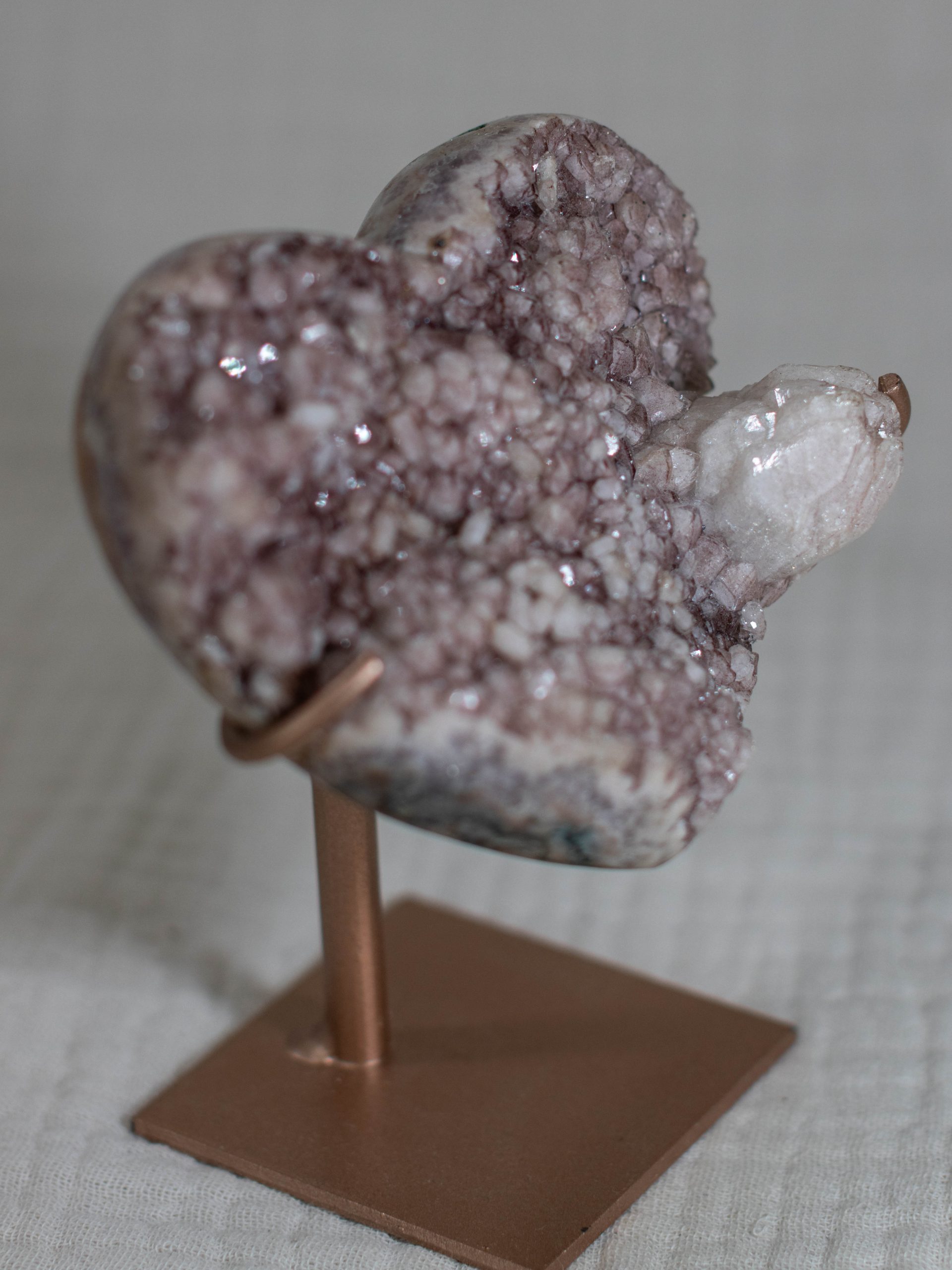 Dit prachtige hart van roze amethist trekt de aandacht met zijn glinsterende kristalpunten, met één speciaal punt dat zich onderscheidt van de rest. De zachte paarsroze kleur danst in het licht, waardoor elke kristalformatie schittert. Het is een prachtig sieraad dat zowel natuurlijke charme als elegantie toevoegt aan elke ruimte.