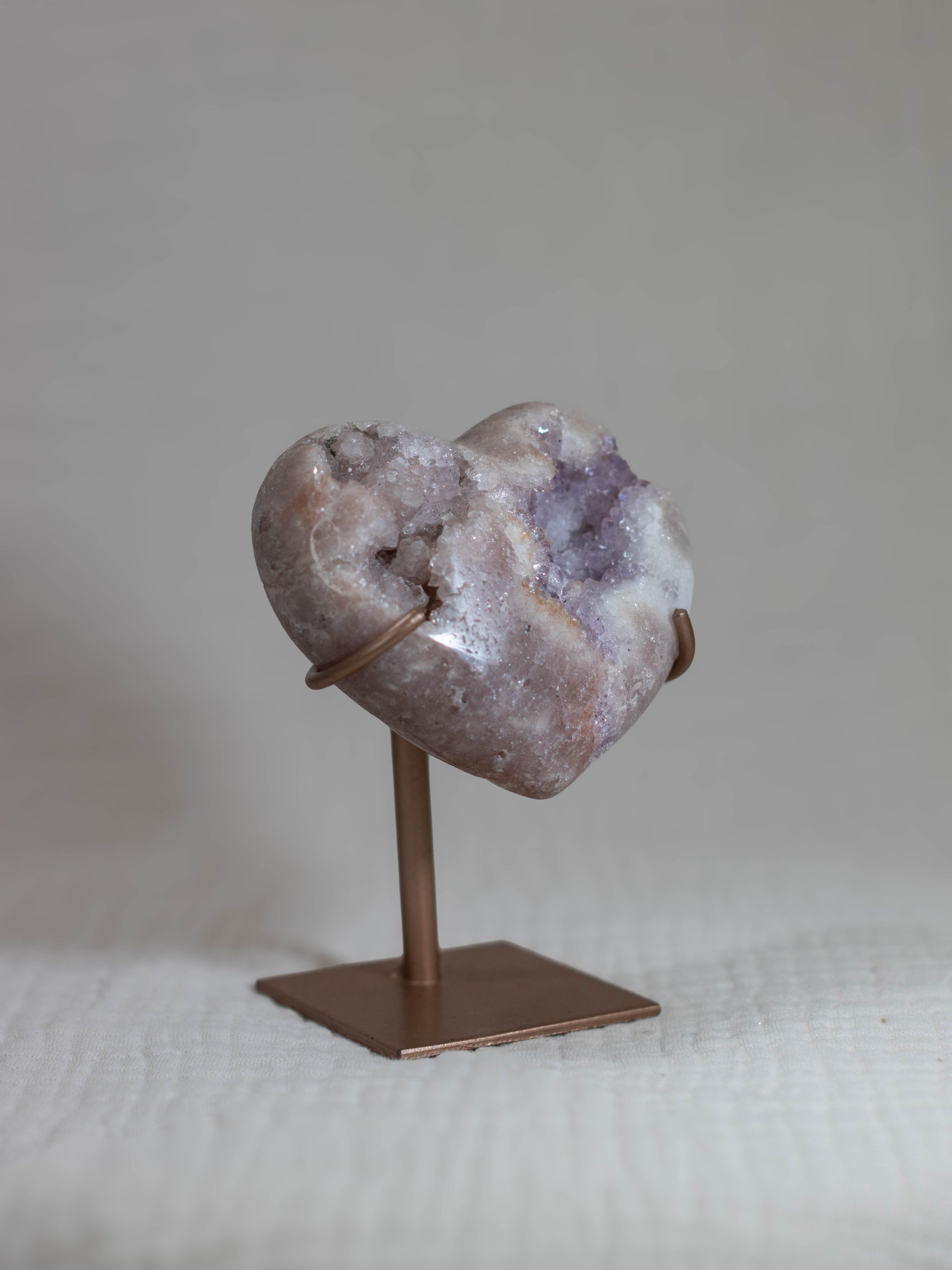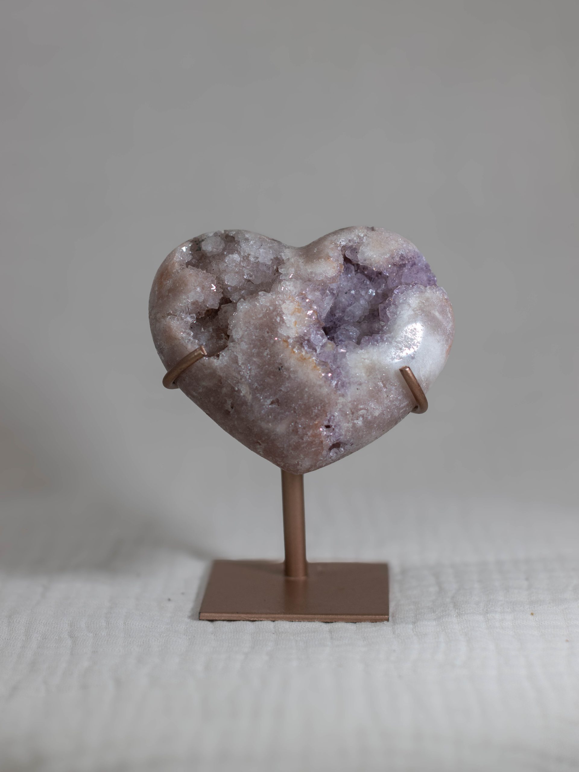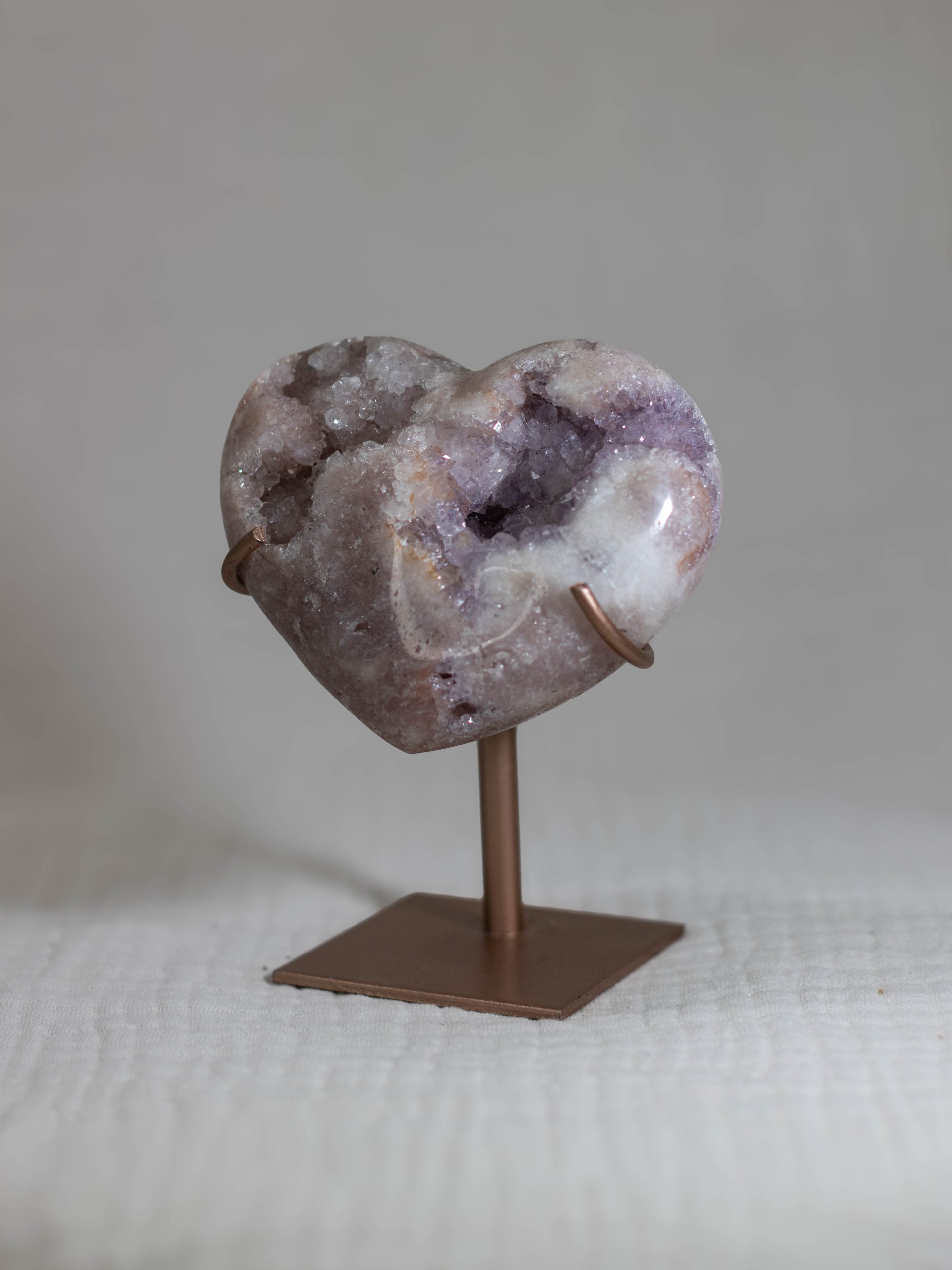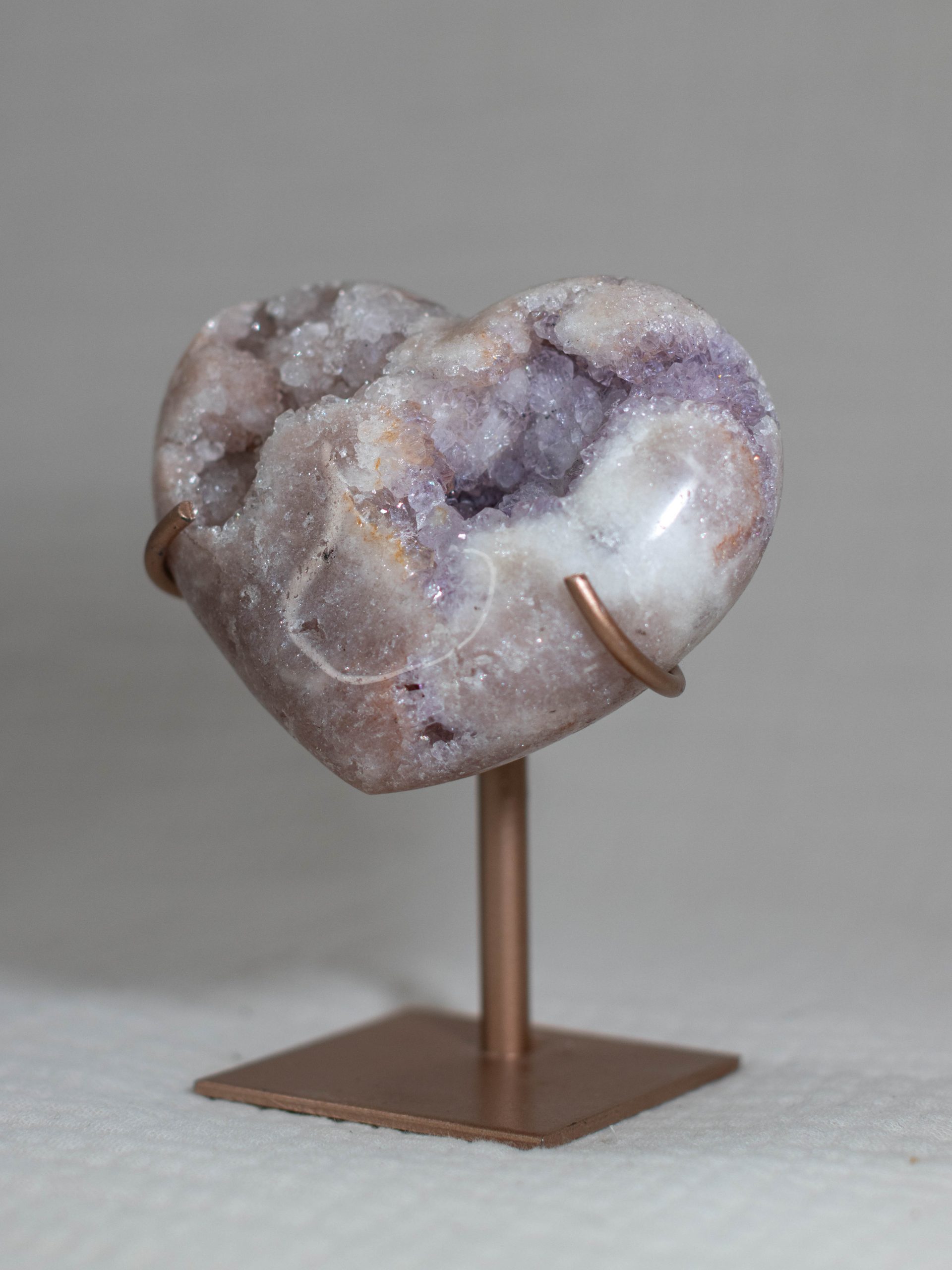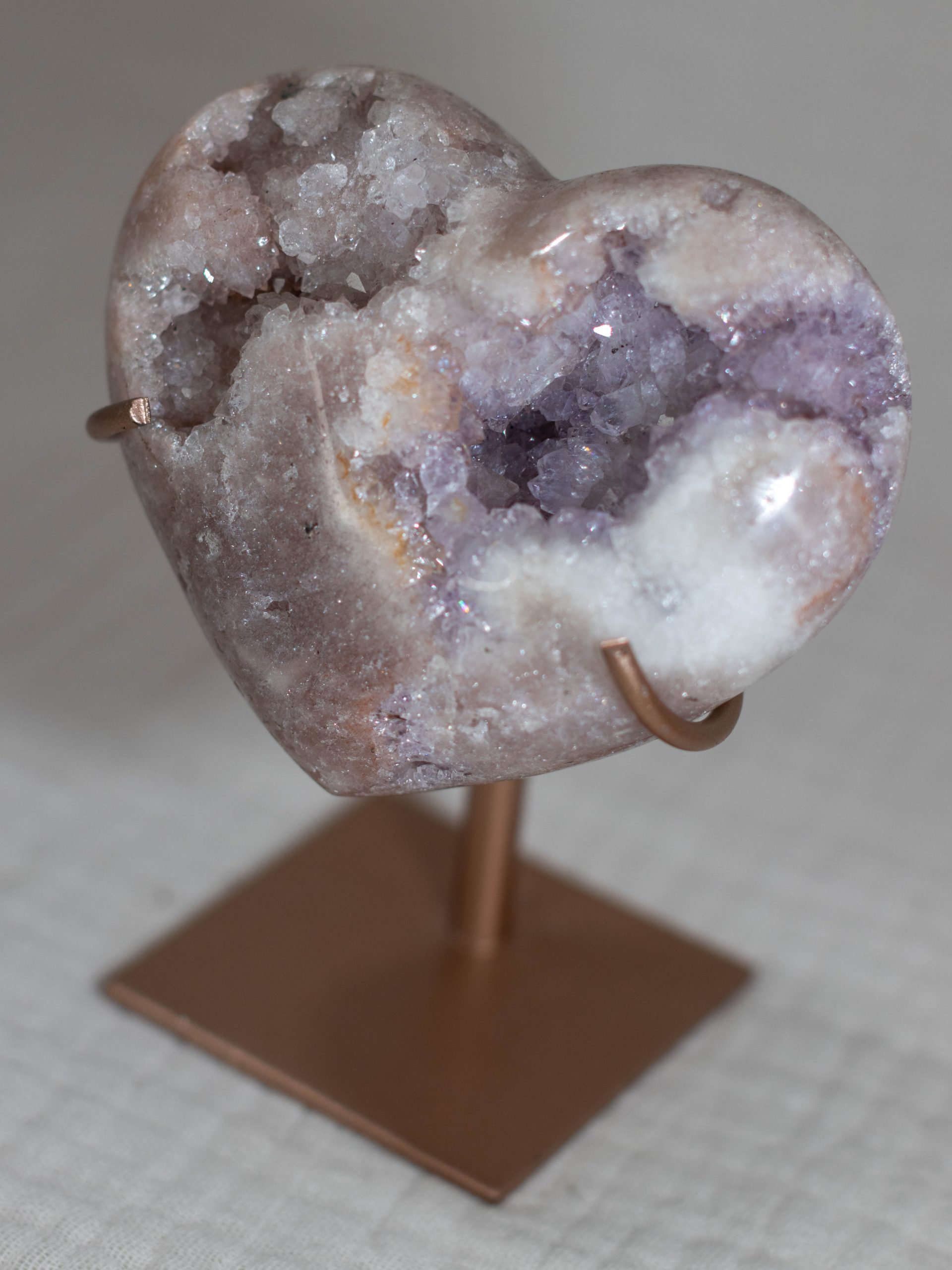 Dit roze amethist hart heeft een prachtige mix van witte, beige en roze kleuren, met een prachtige zachtpaarse geode. De hartvorm en natuurlijke kristalpatronen maken het zowel een prachtig pronkstuk als een prachtig cadeau.