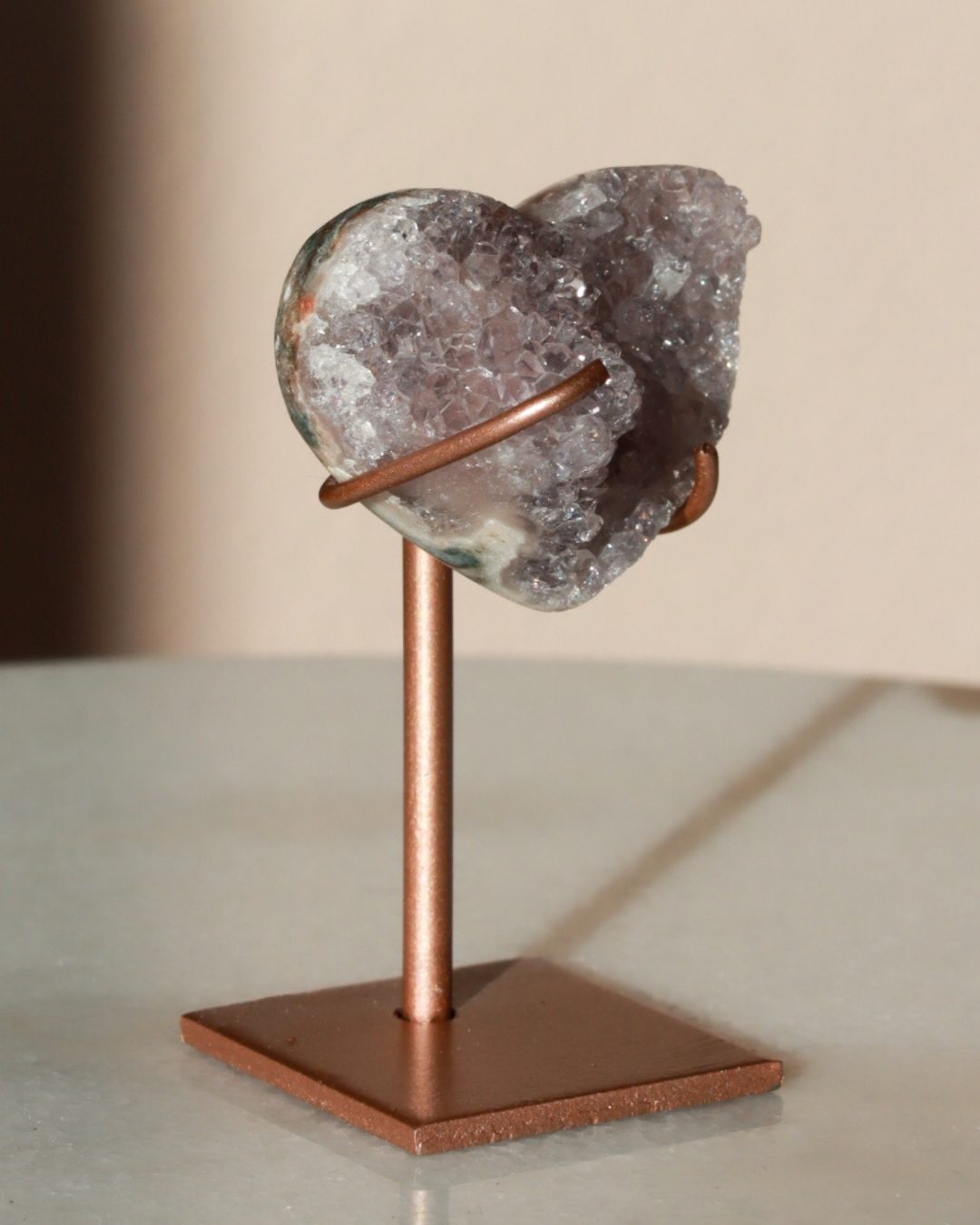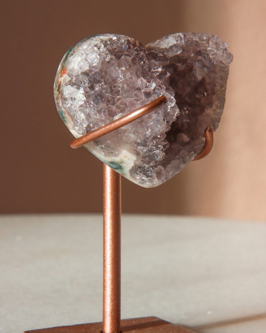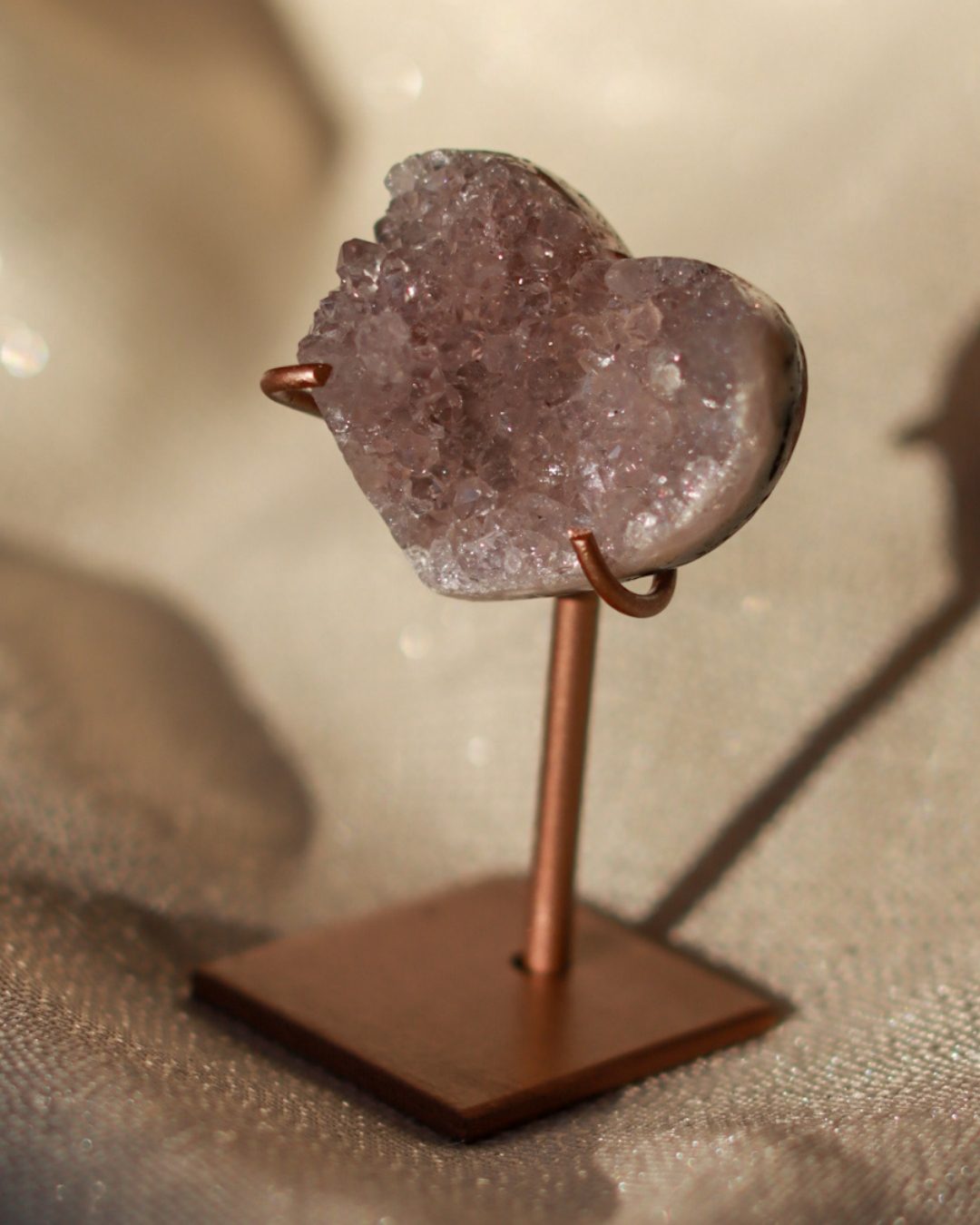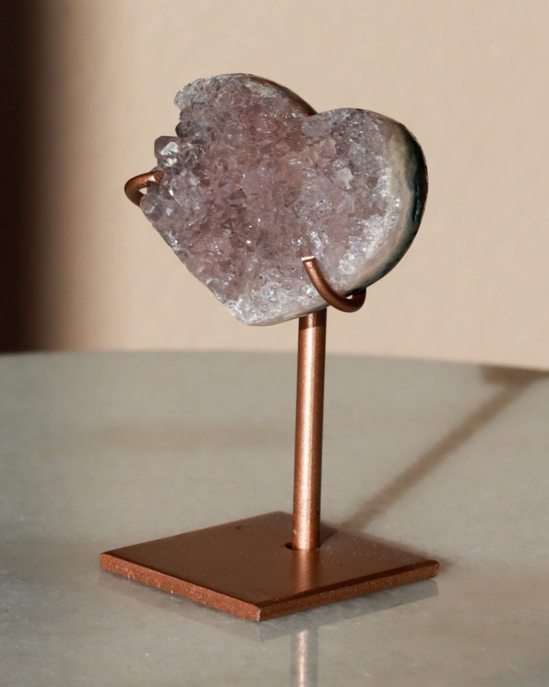 Zeer unieke roze amethist hart op standaard met zachte pasteltinten, paarse kristalgeodes en diepe, donkerroze accenten.