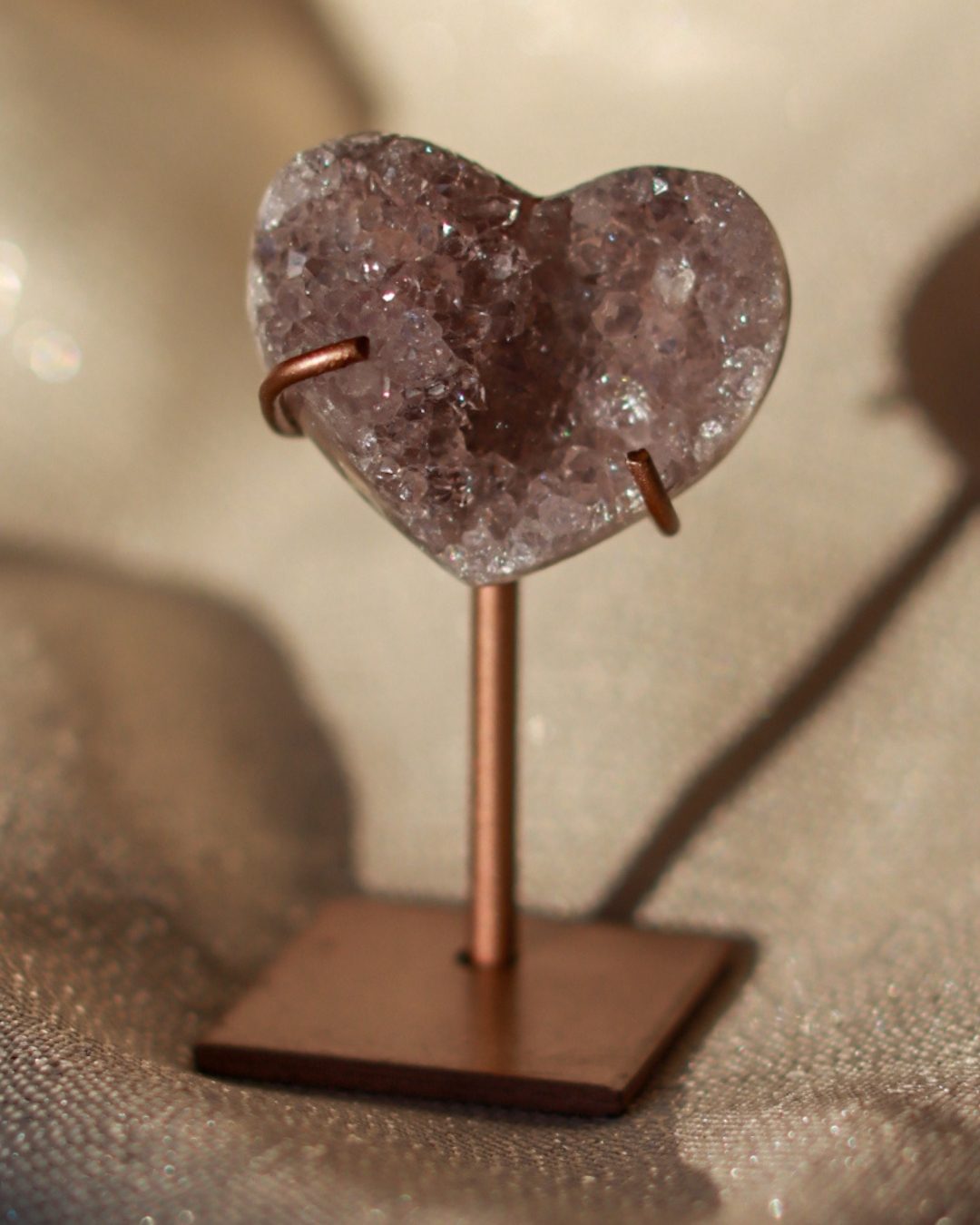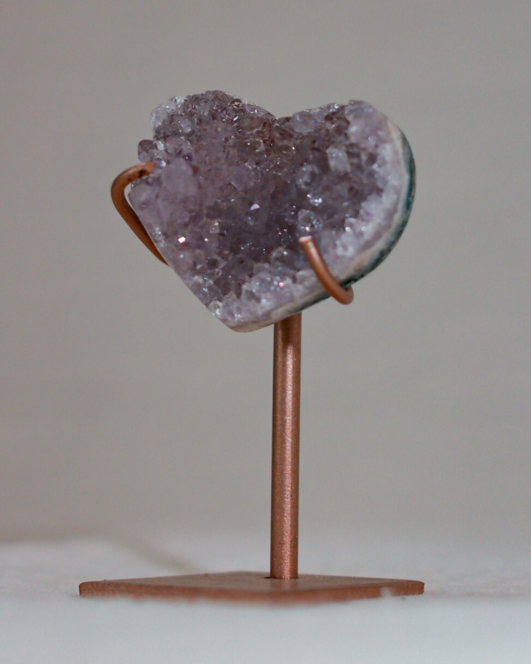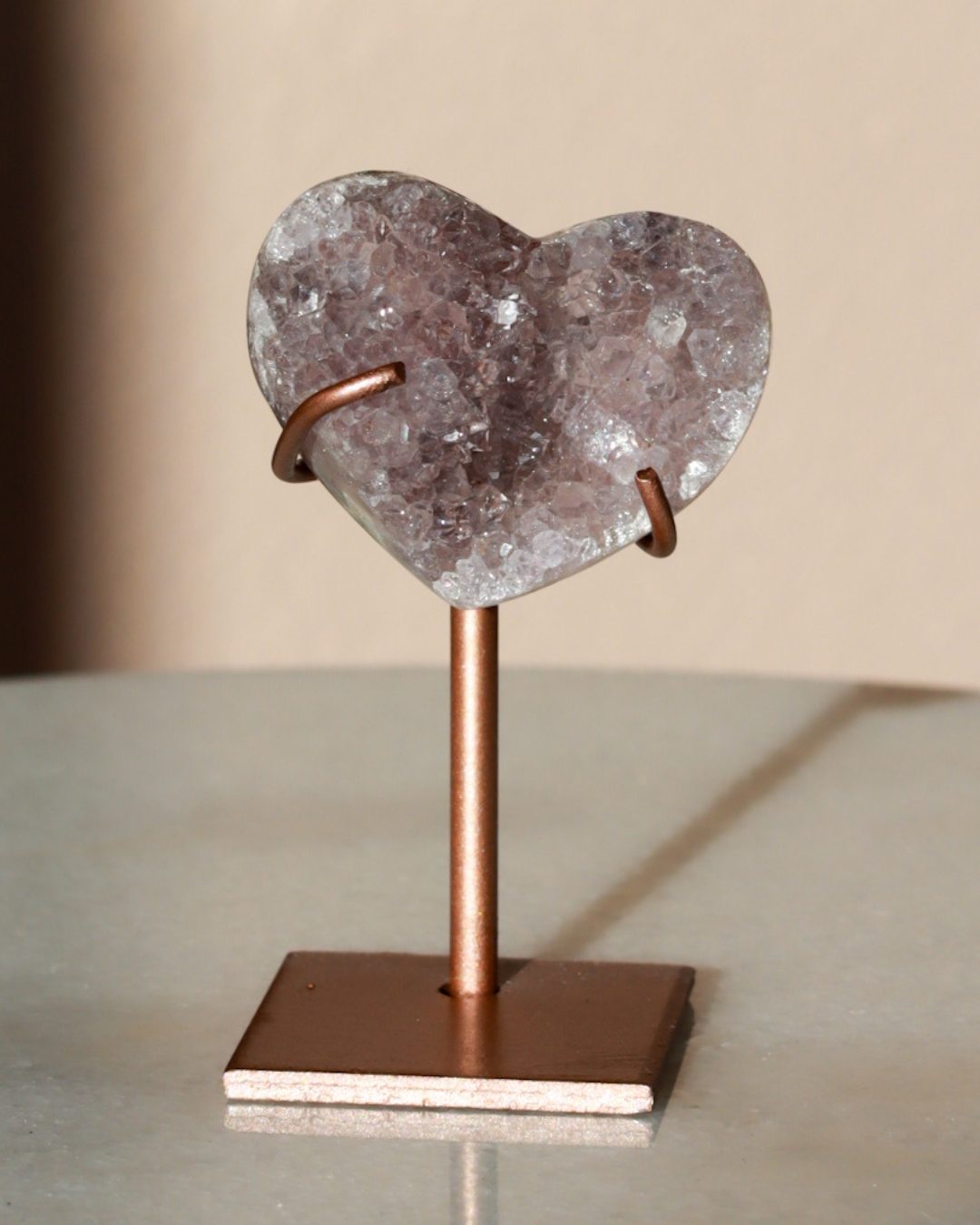 Zeer unieke roze amethist hart op standaard met zachte pasteltinten, paarse kristalgeodes en diepe, donkerroze accenten.