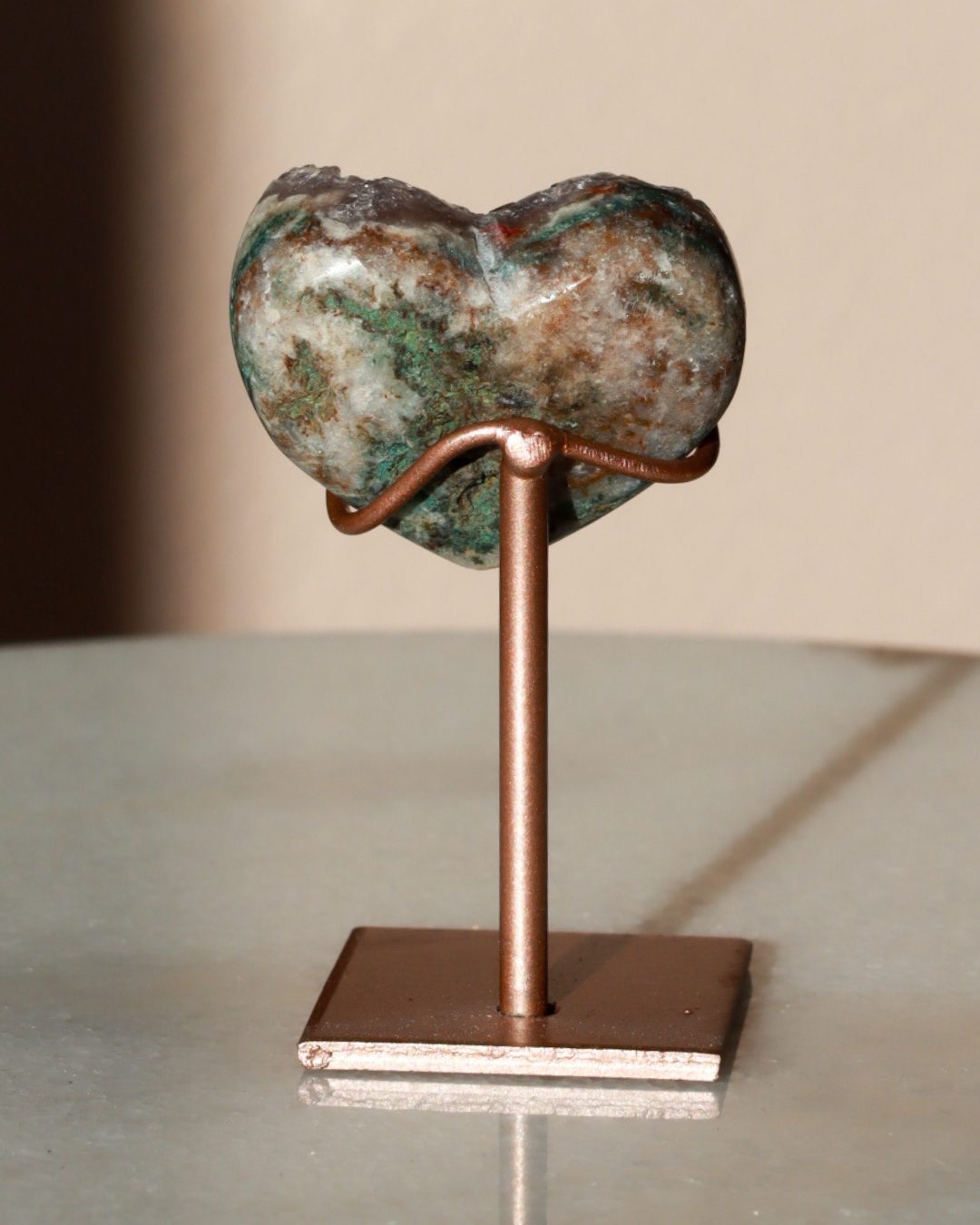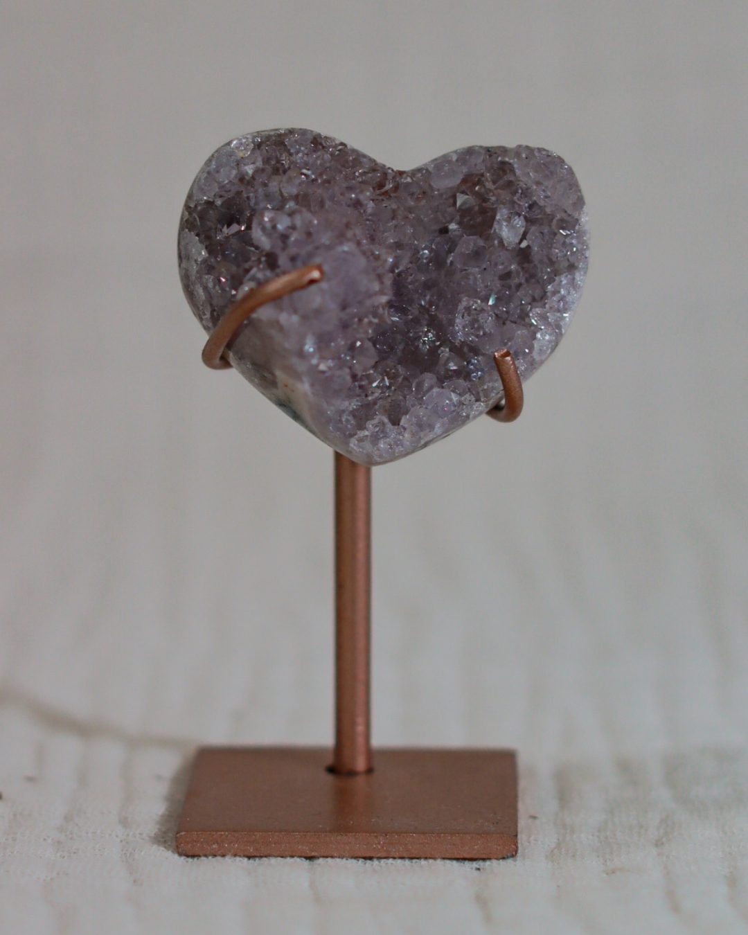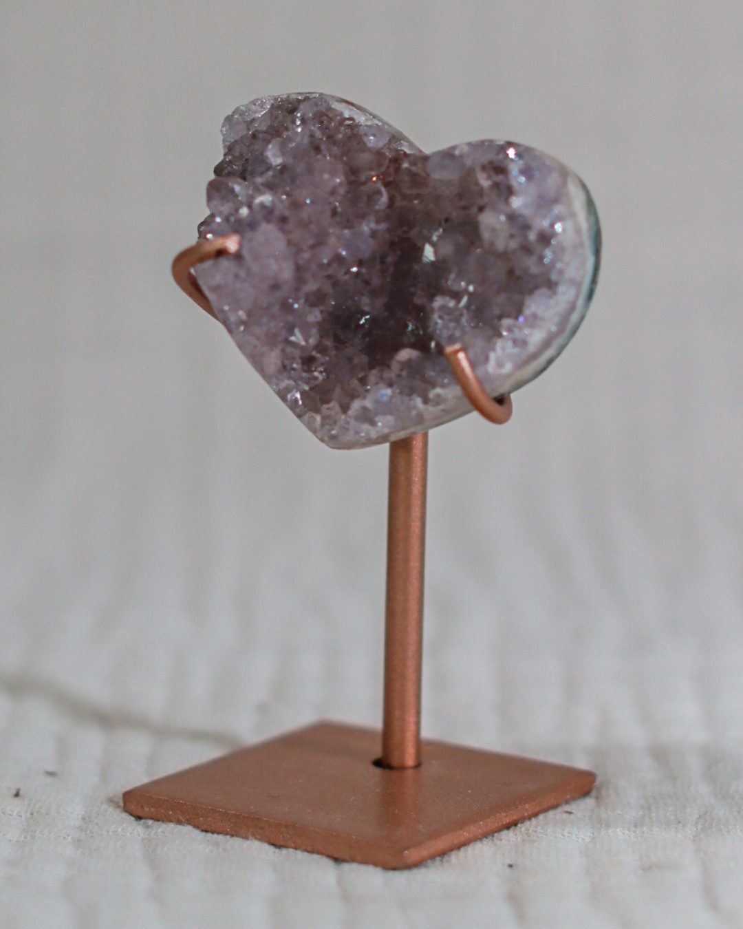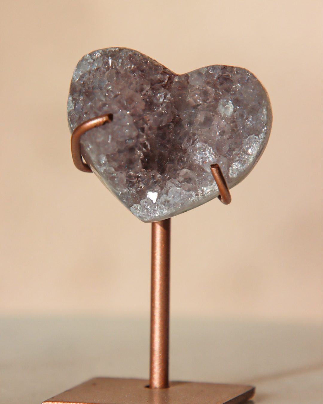Zeer unieke roze amethist hart op standaard met zachte pasteltinten, paarse kristalgeodes en diepe, donkerroze accenten.