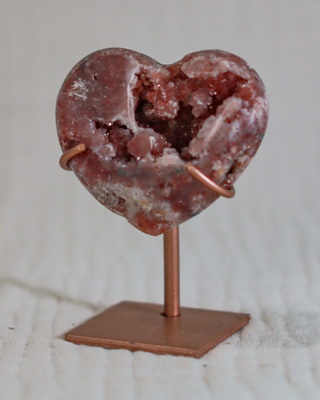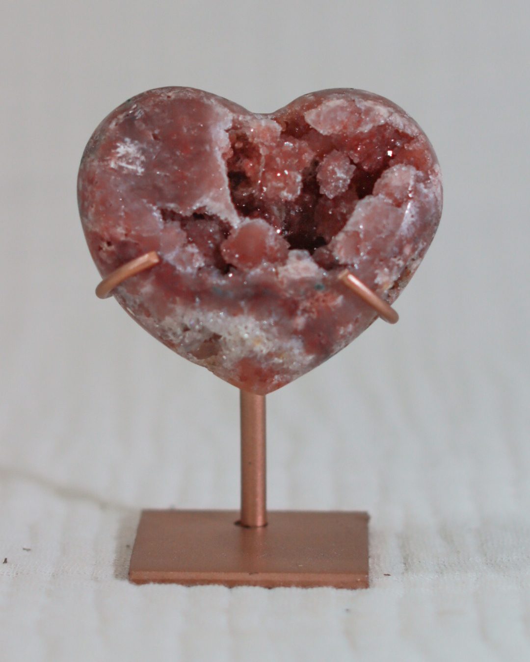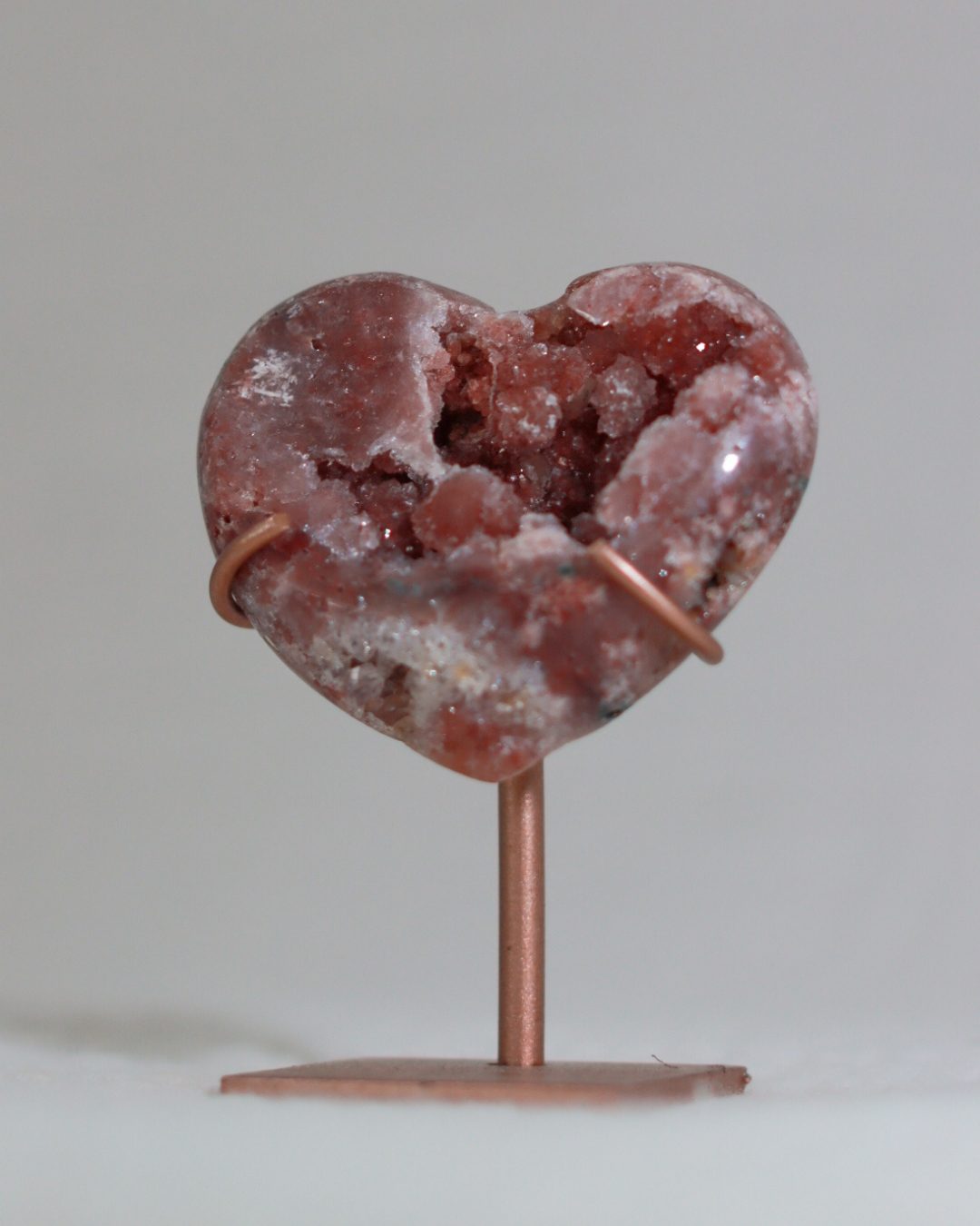 Zeer unieke roze amethist hart op standaard met zachte pasteltinten, paarse kristalgeodes en diepe, donkerroze accenten.