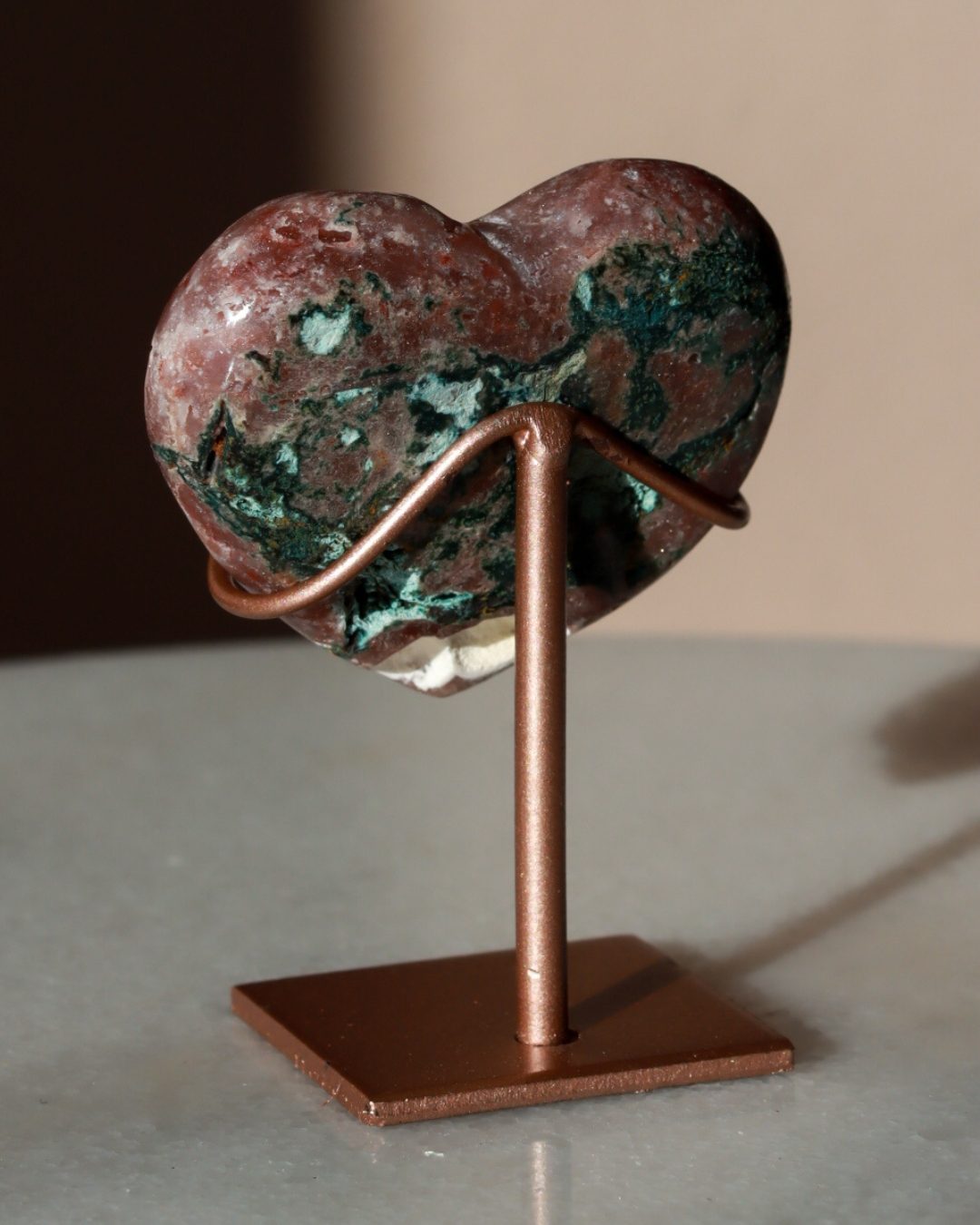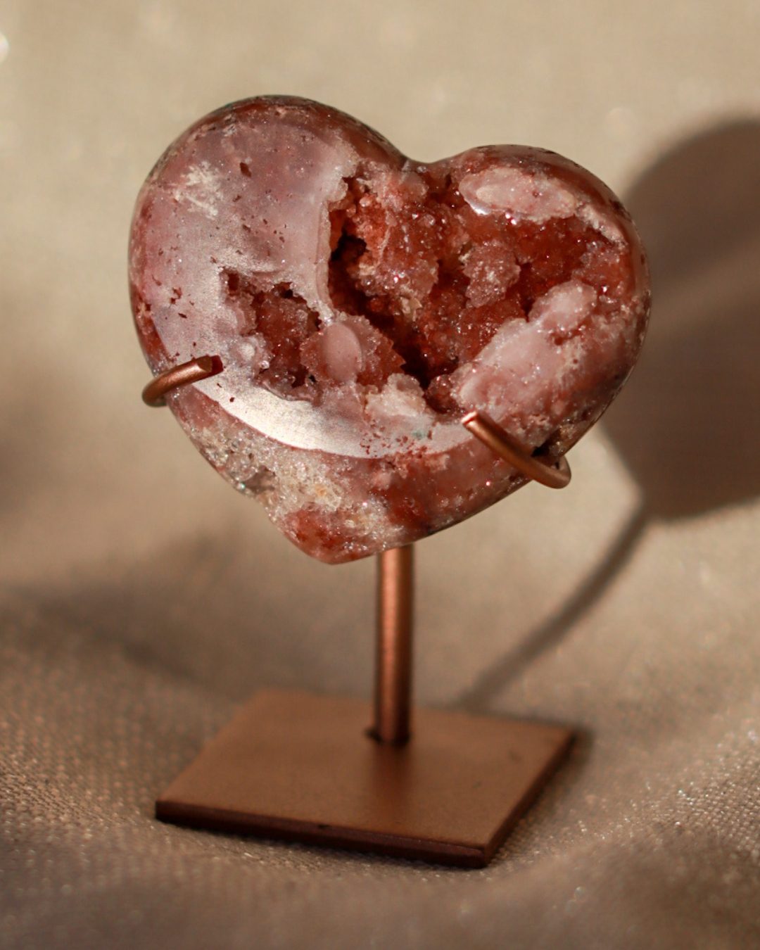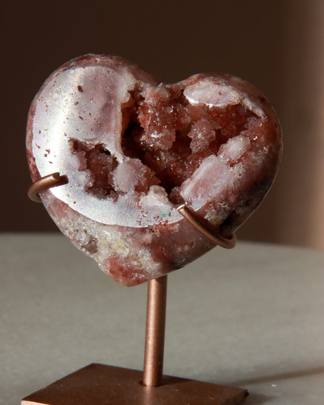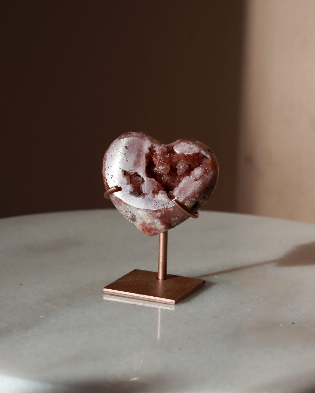 Zeer unieke roze amethist hart op standaard met zachte pasteltinten, paarse kristalgeodes en diepe, donkerroze accenten.
