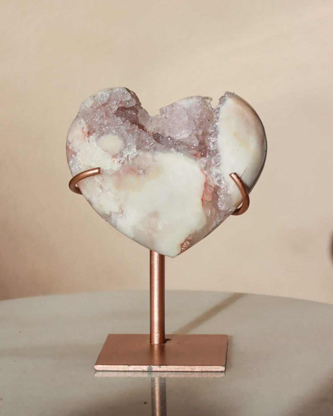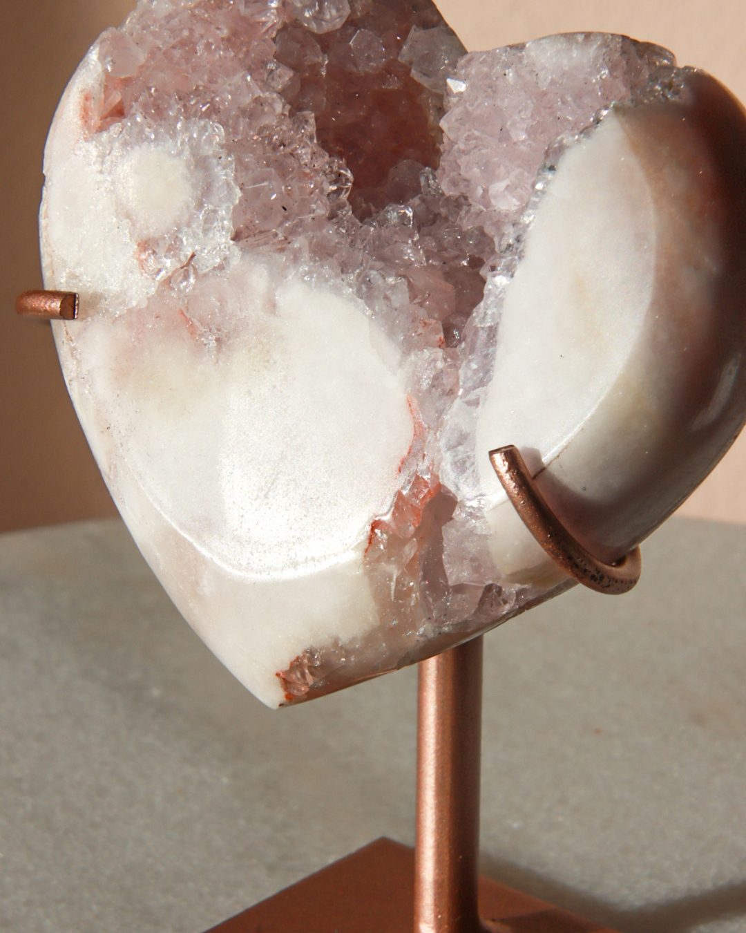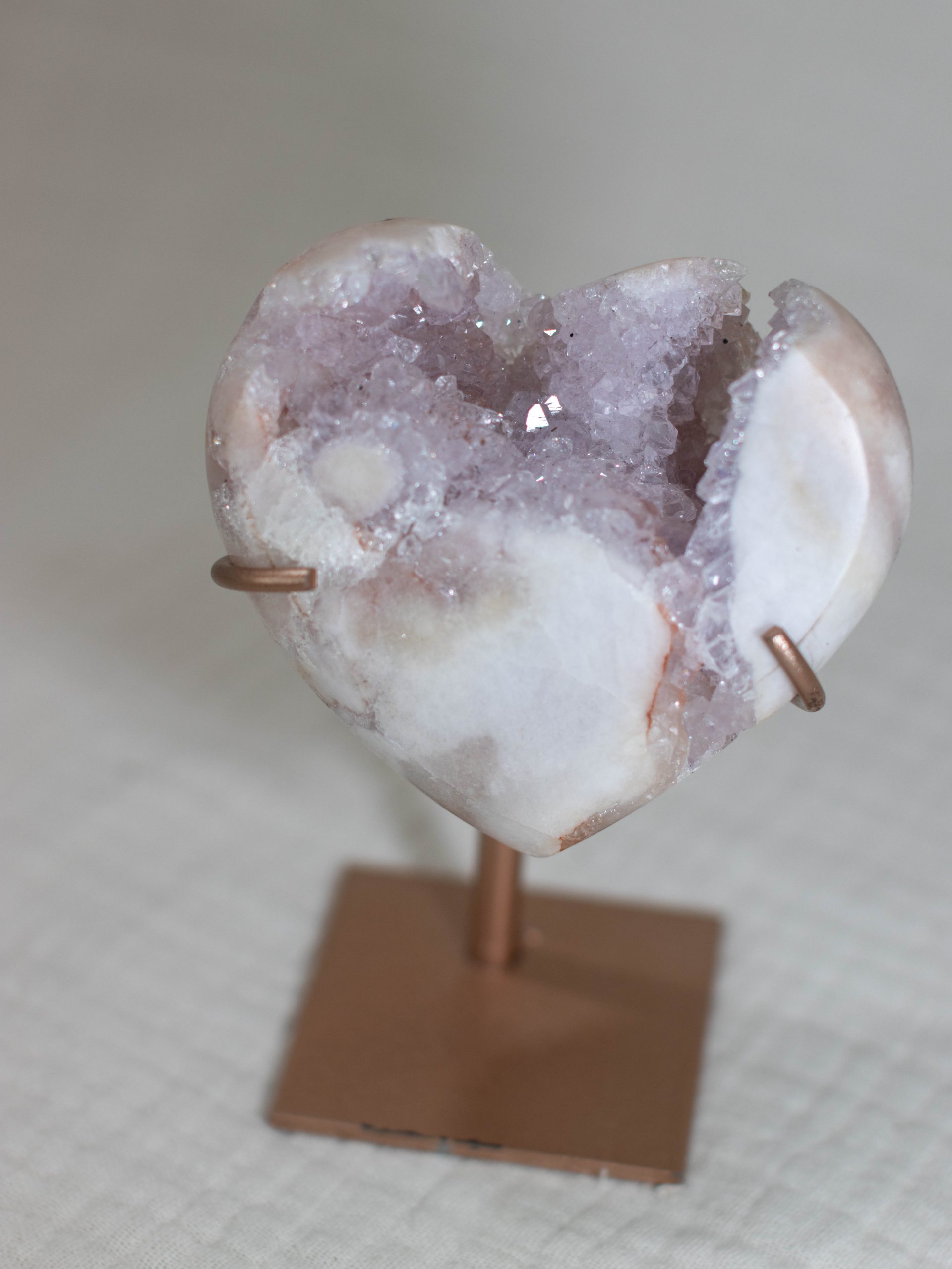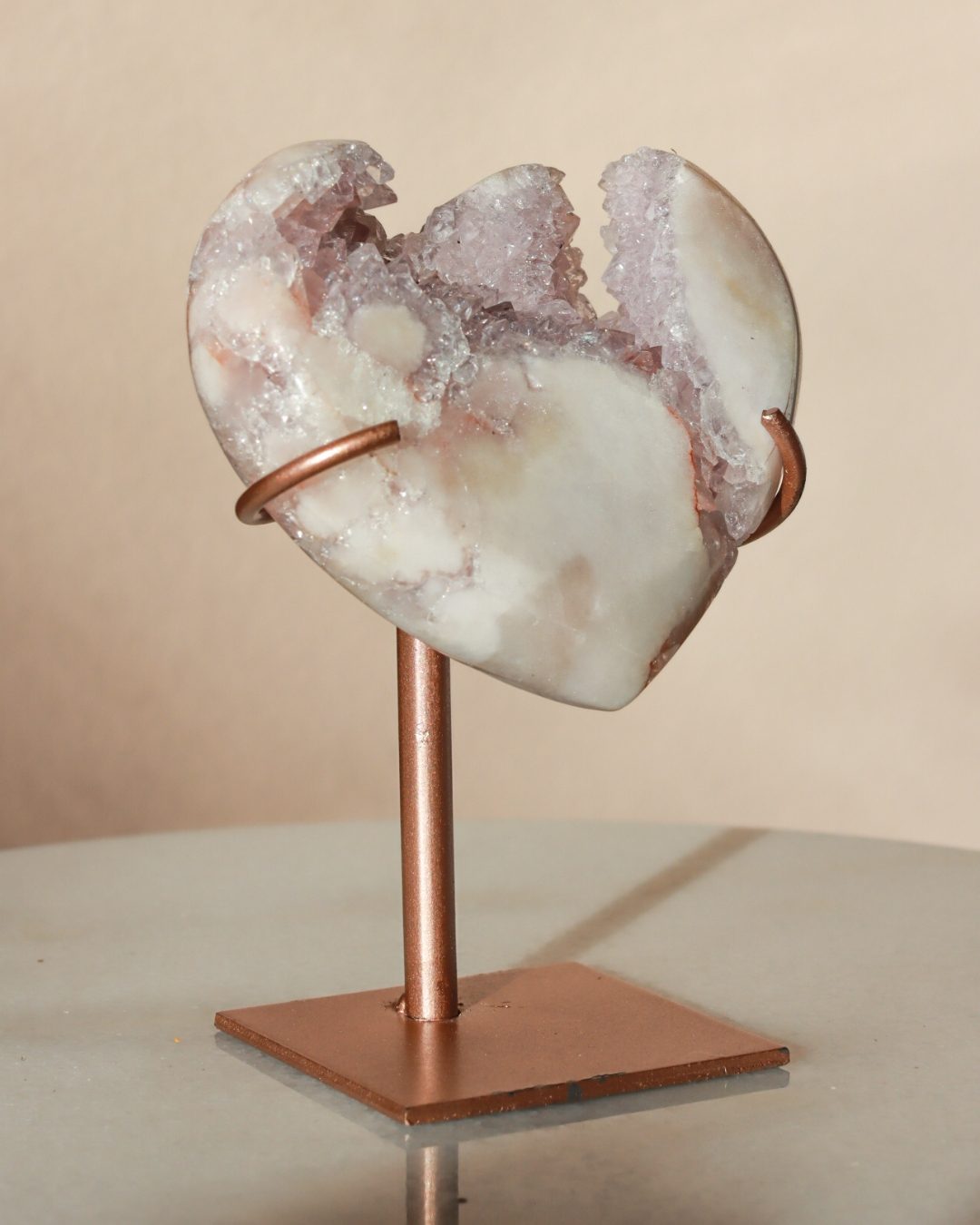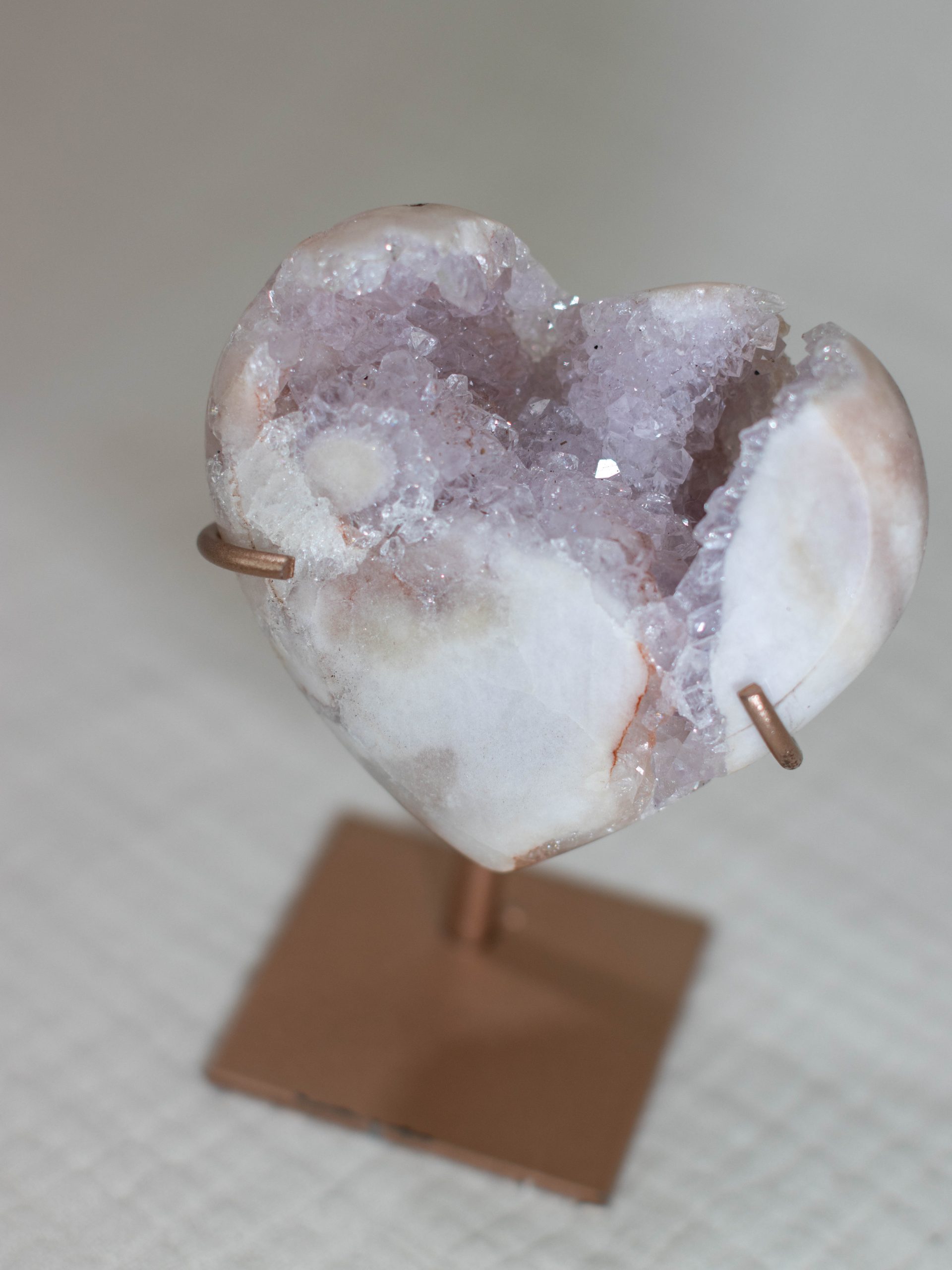 Dit roze amethist hart heeft een prachtige mix van zachte witte, beige tinten en een zachtpaarse kristalgeode. De unieke kleuren maken het een mooie toevoeging aan je edelstenen collectie of een betekenisvol cadeau aan jezelf of een dierbare.