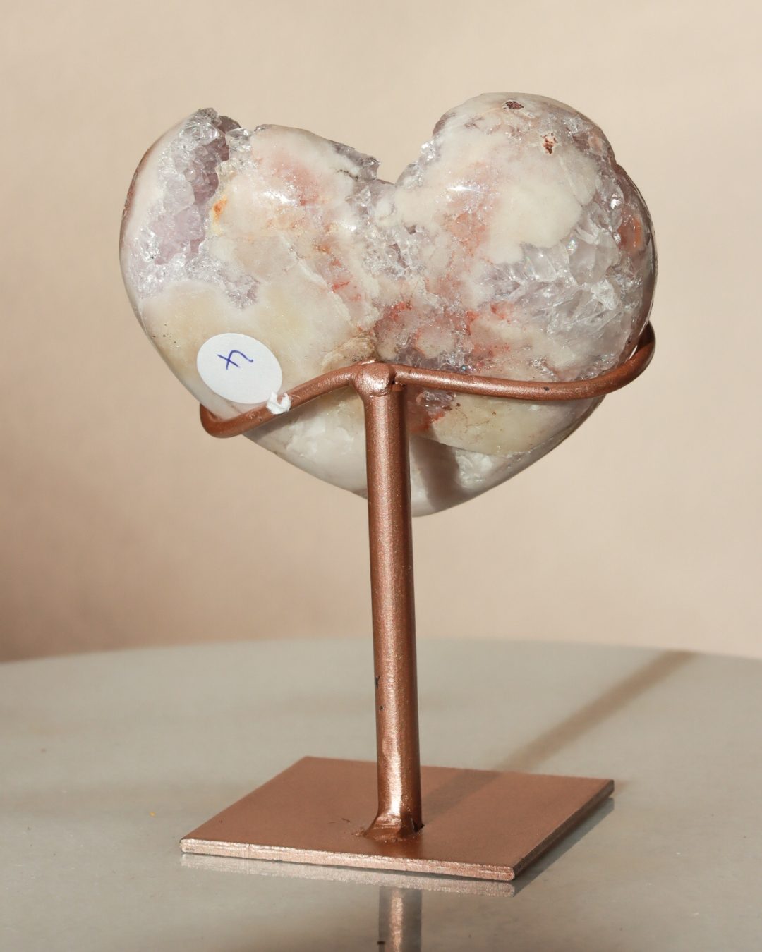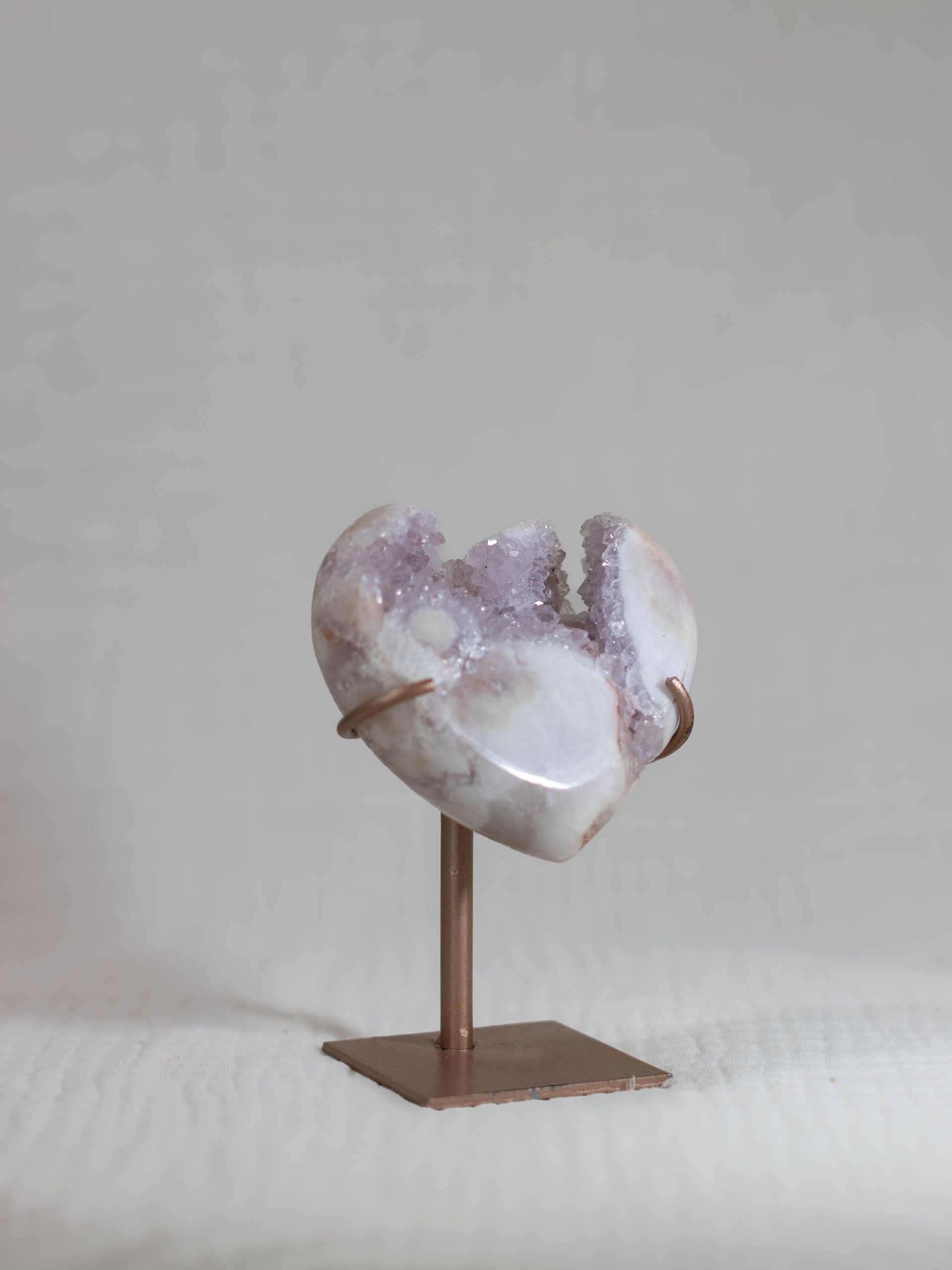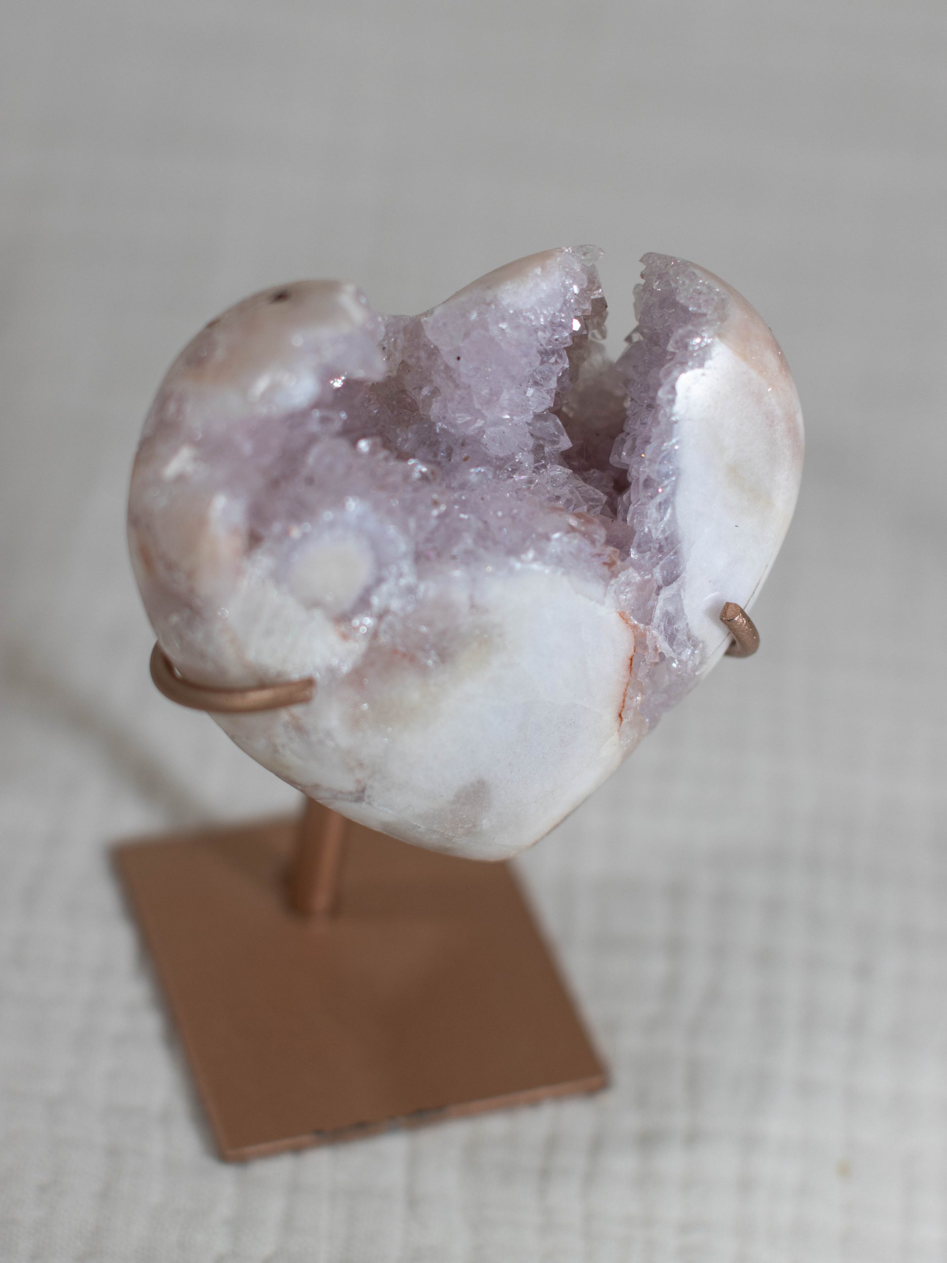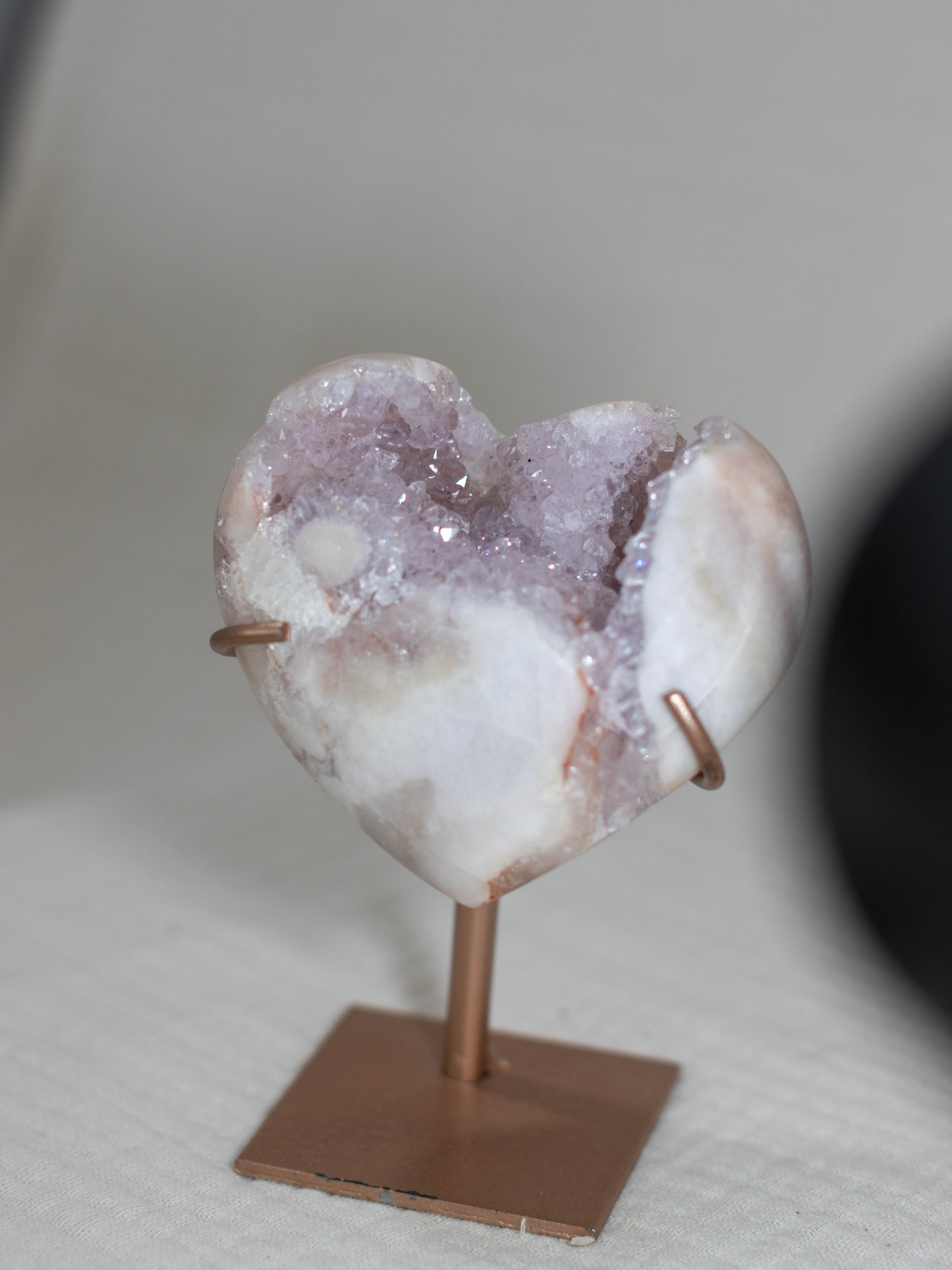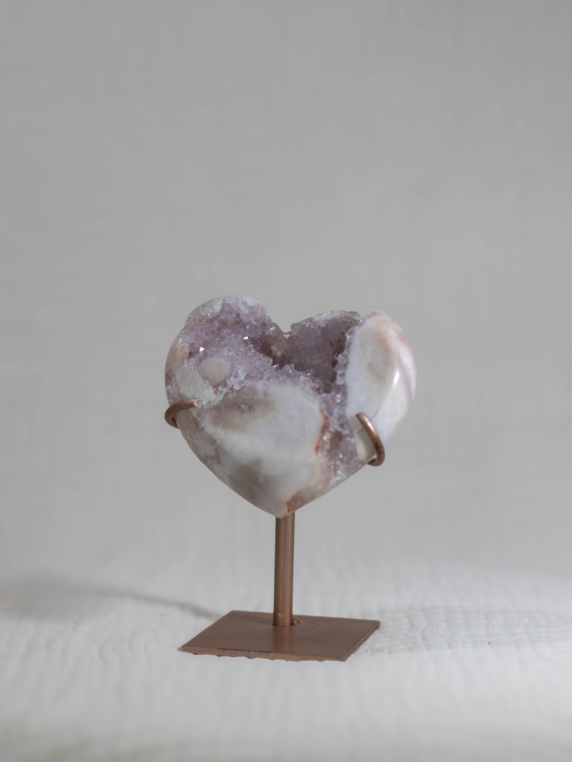 Dit roze amethist hart heeft een prachtige mix van zachte witte, beige tinten en een zachtpaarse kristalgeode. De unieke kleuren maken het een mooie toevoeging aan je edelstenen collectie of een betekenisvol cadeau aan jezelf of een dierbare.