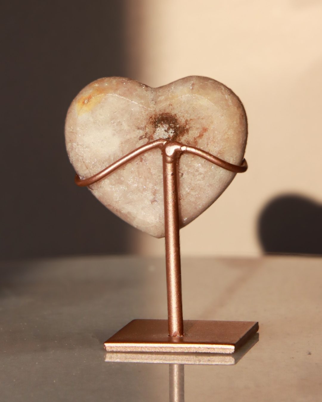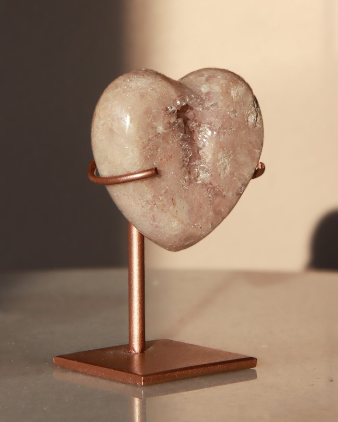 Dit bijzondere roze amethist hart bestaat uit zachteroze kleuren en heeft een kleine geode aan de binnenkant die lijkt op een sleutelgat – als de toegang tot je hart. Dankzij de hartvorm en natuurlijke kristalpatronen is het zowel een mooie toevoeging aan je collectie als een bijzonder aan een dierbare.