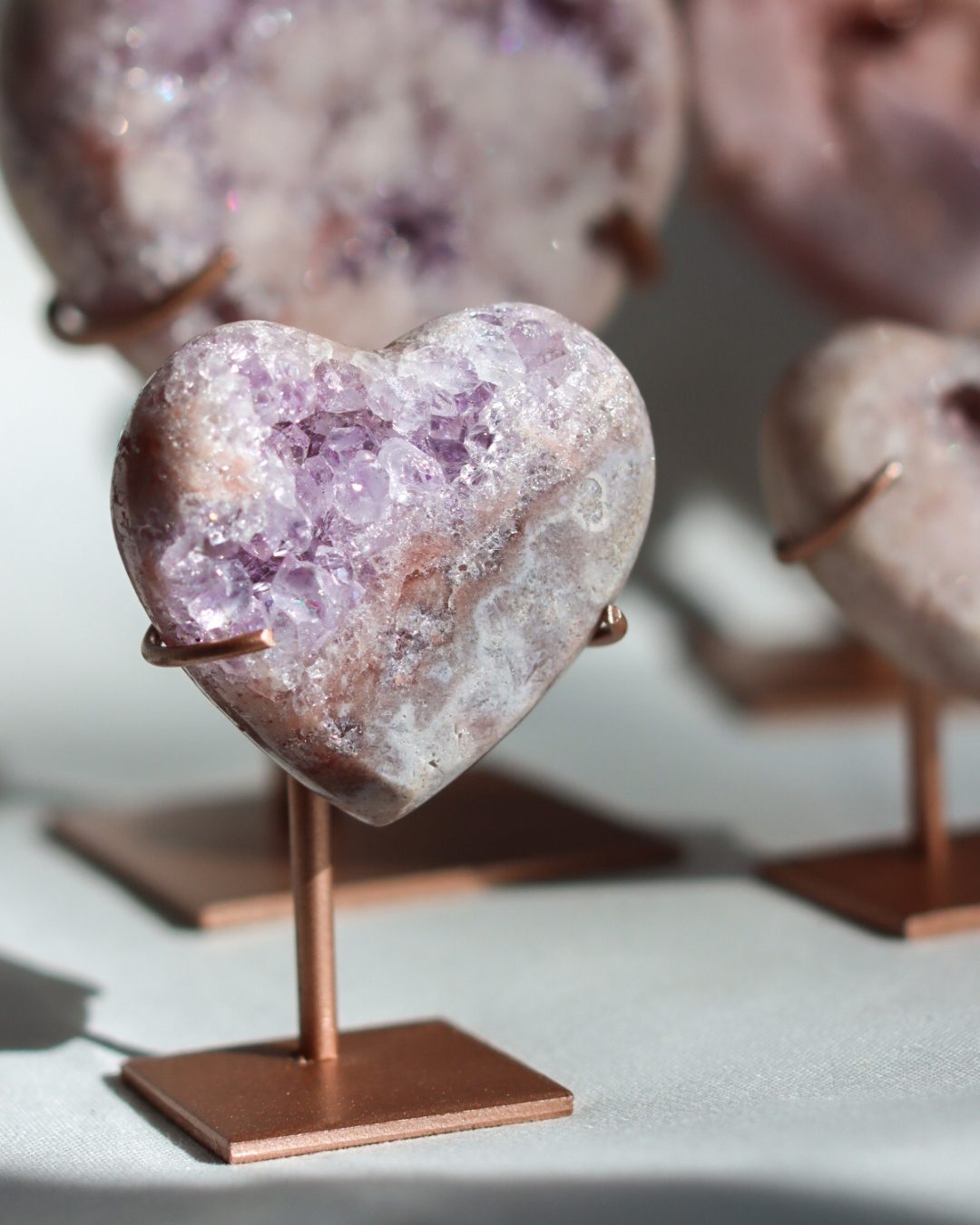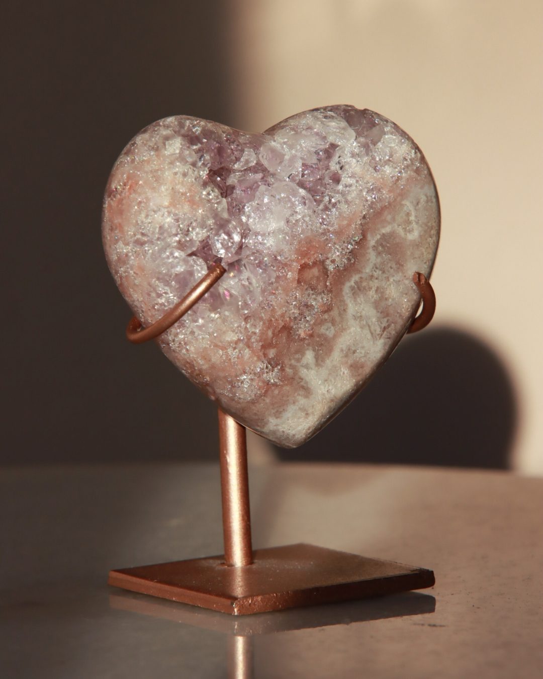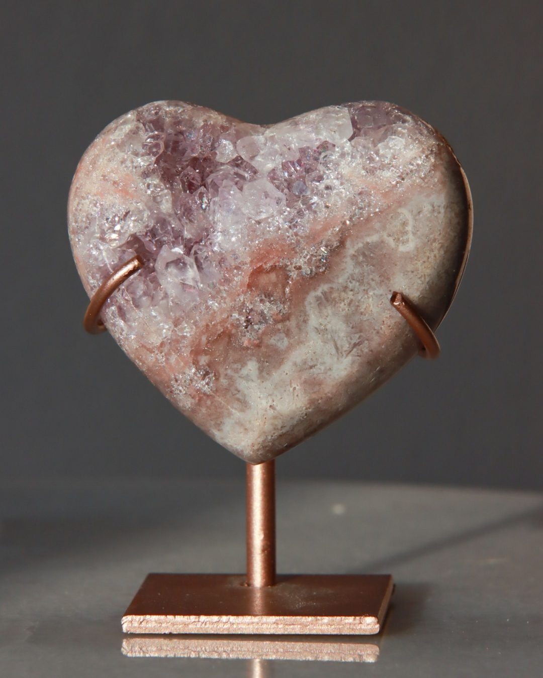 Dit roze amethist hart edelsteen heeft een prachtige mix van roze kleuren. De hartvorm en natuurlijke kristalpatronen maken het zowel een prachtig pronkstuk als een prachtig cadeau.