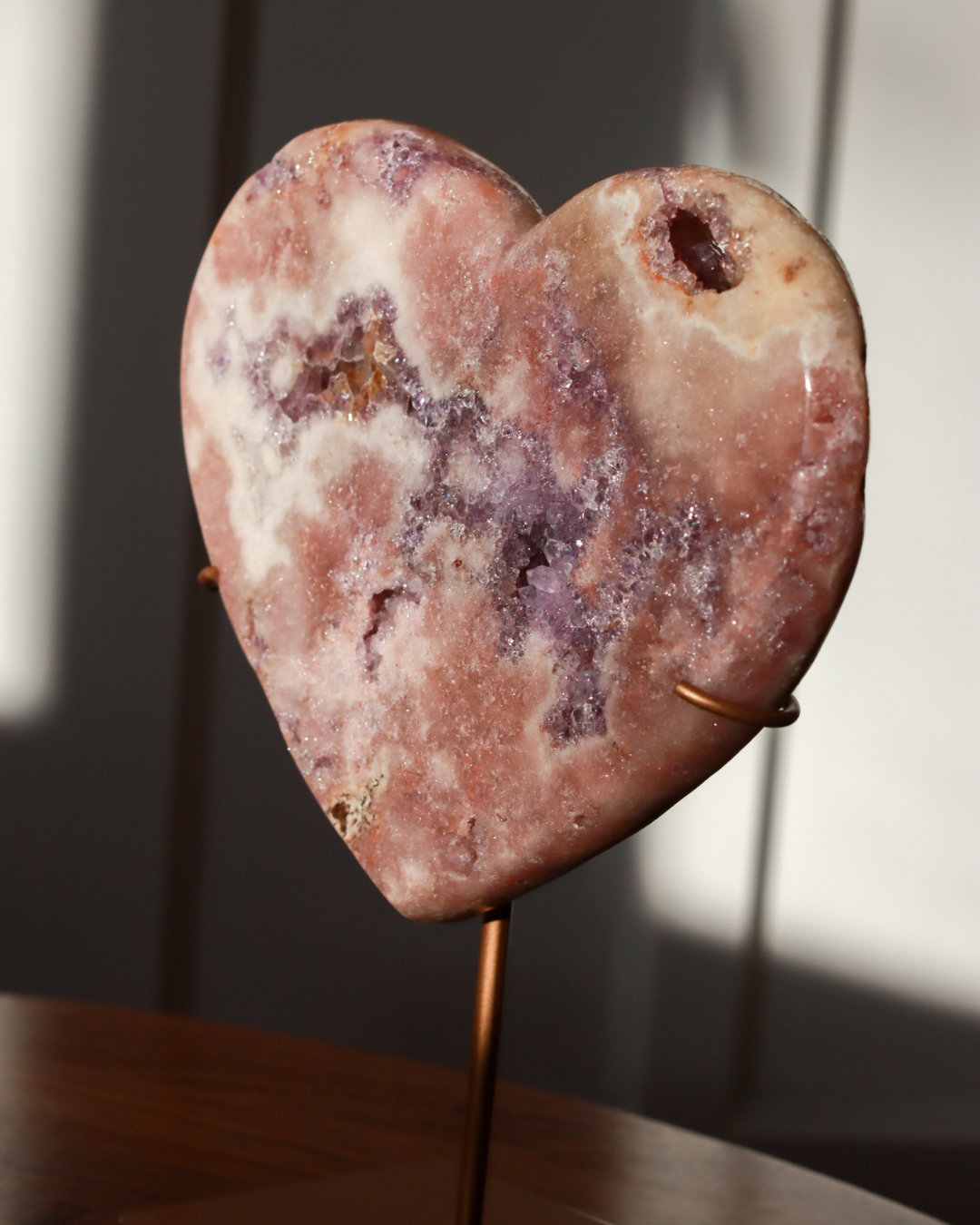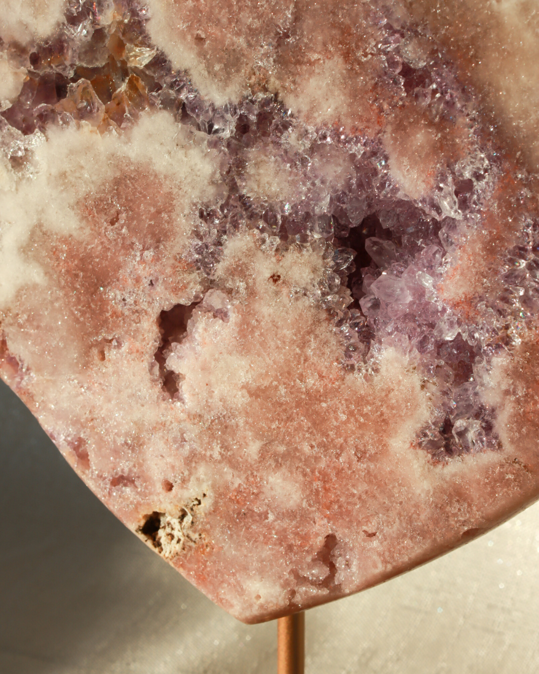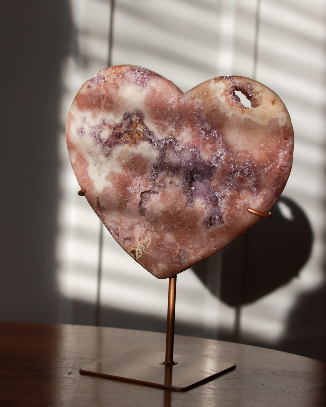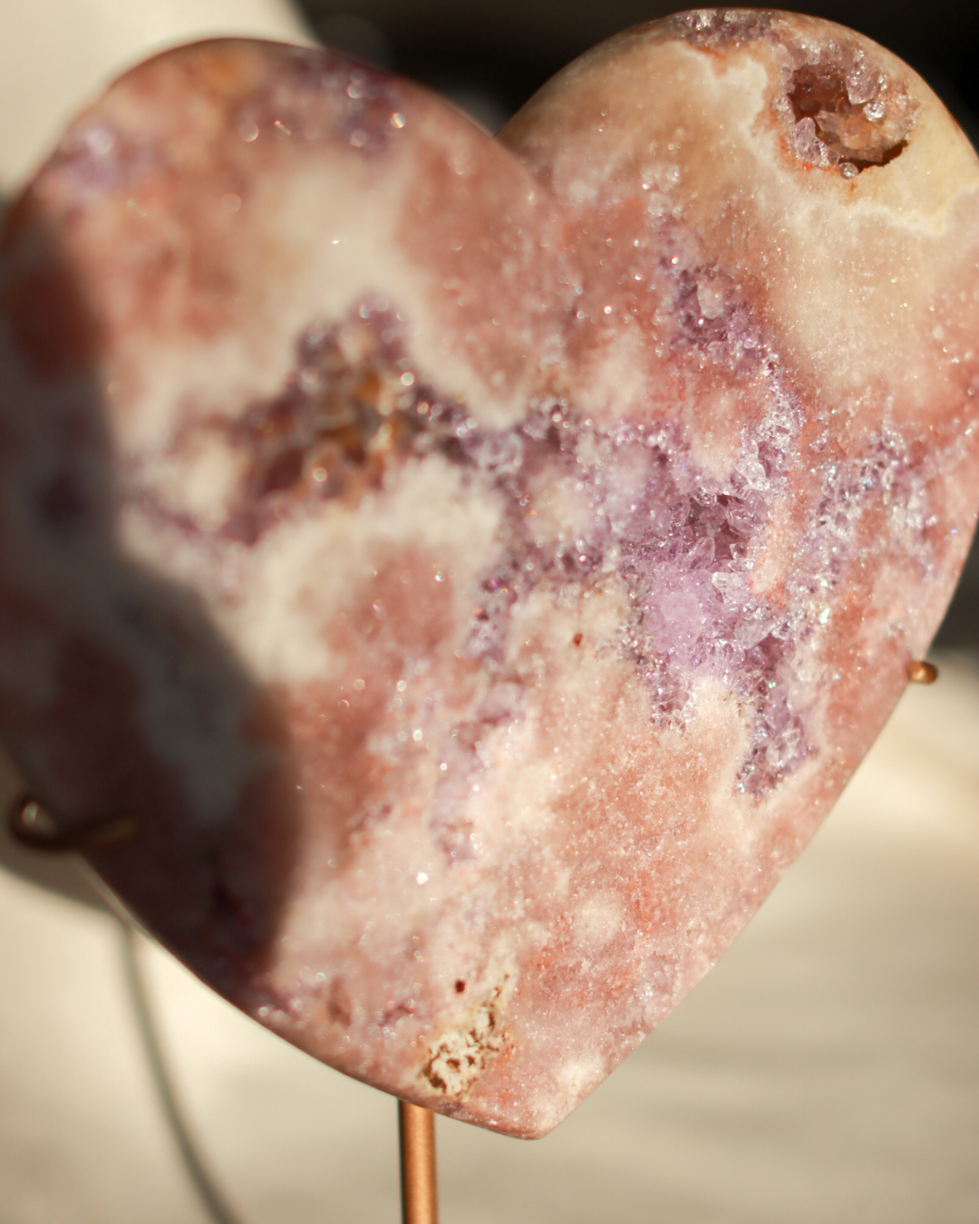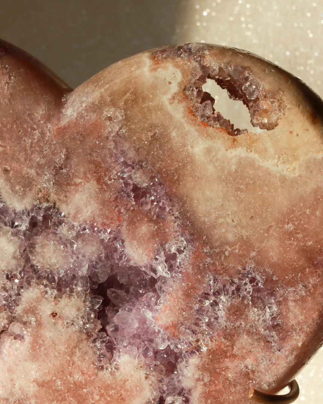 Dit roze amethist hart edelsteen heeft een prachtige mix van beige en roze kleuren, met een prachtige zachtpaarse geode. De hartvorm en natuurlijke kristalpatronen maken het zowel een prachtig pronkstuk als een prachtig cadeau.