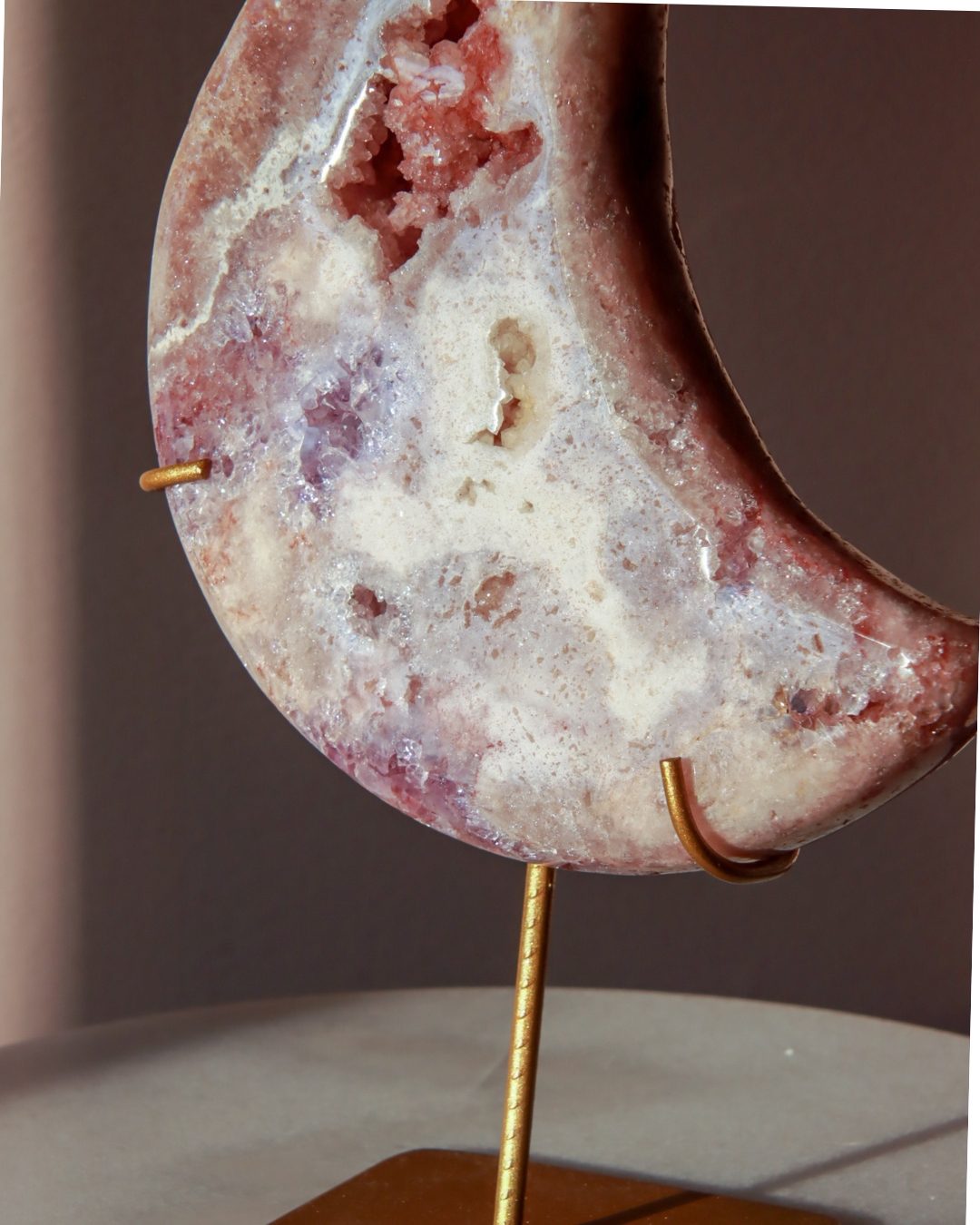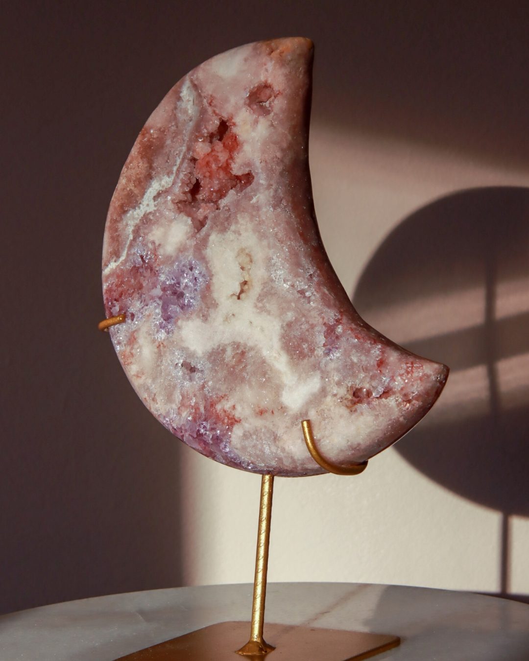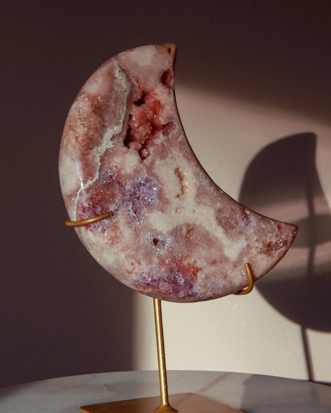Prachtige roze amethist maan met dieproze kleuren en glinsterende geode.
