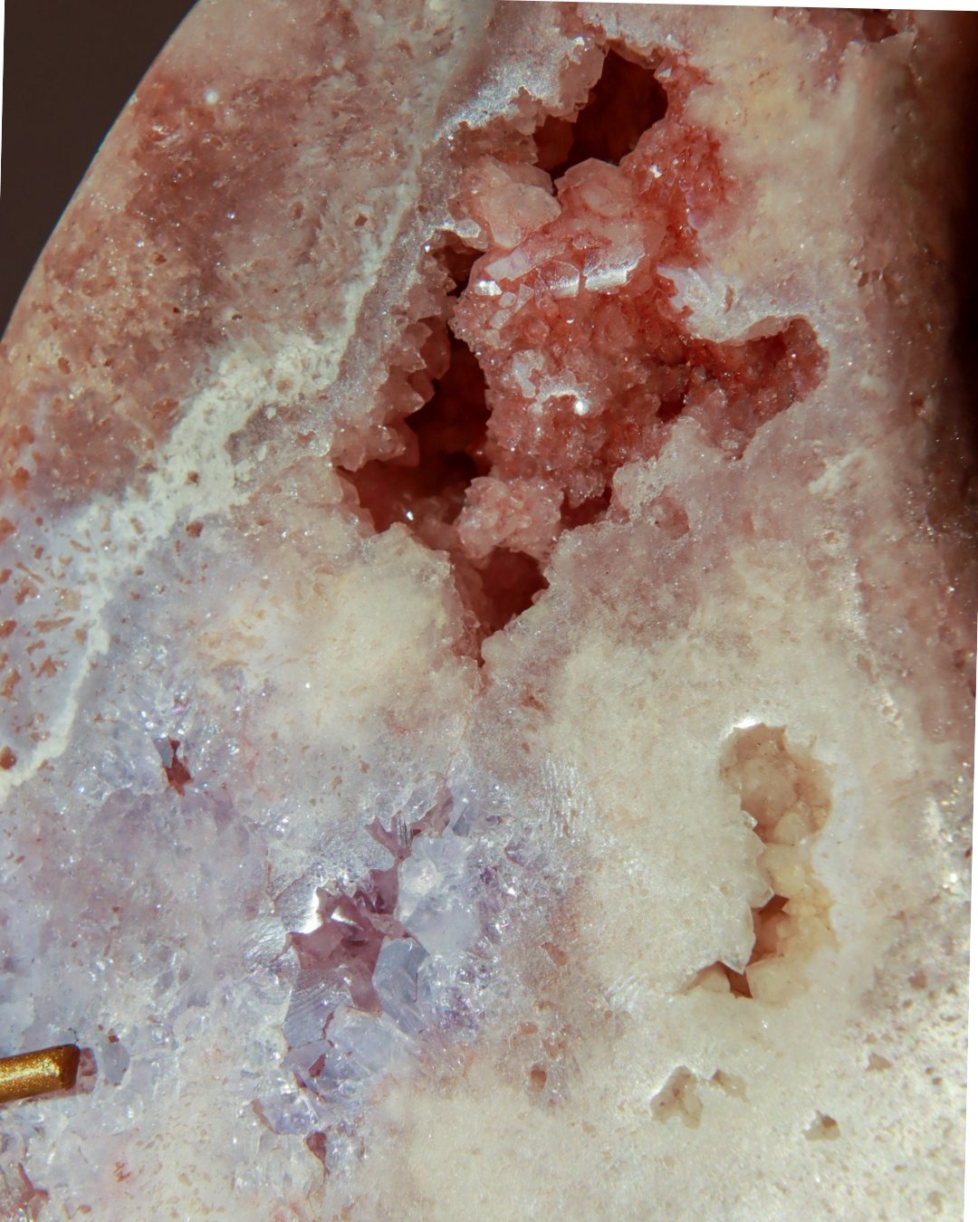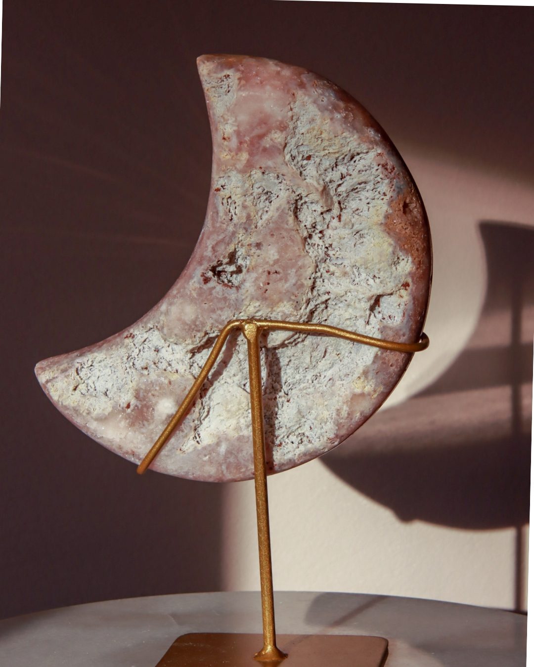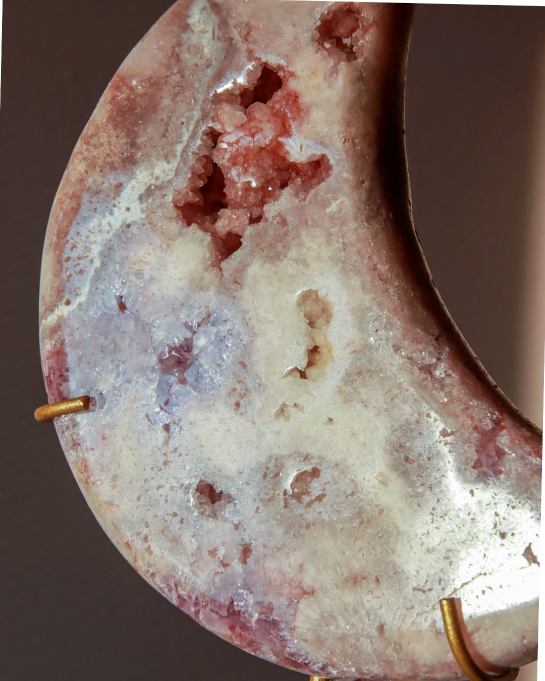 Prachtige roze amethist maan met dieproze kleuren en glinsterende geode.