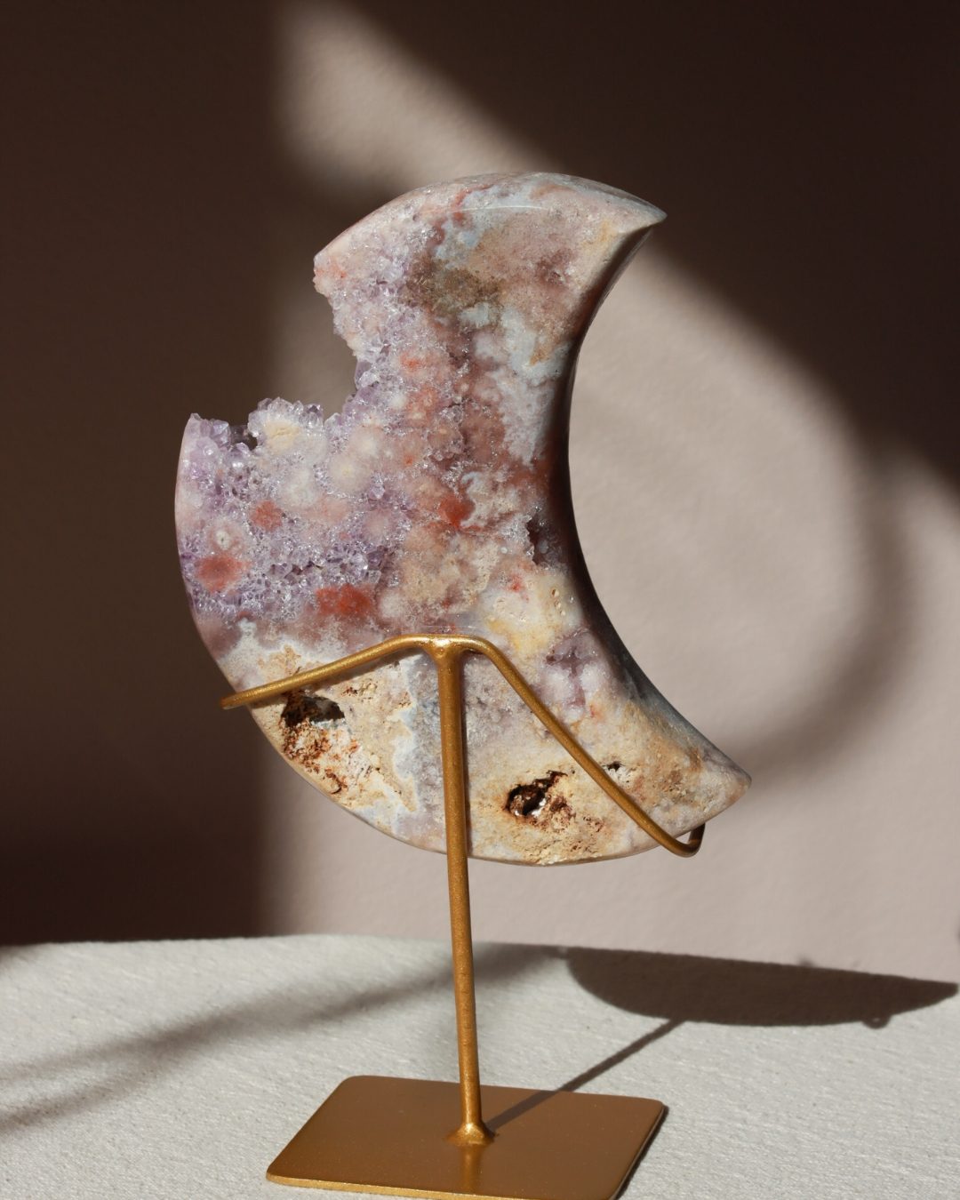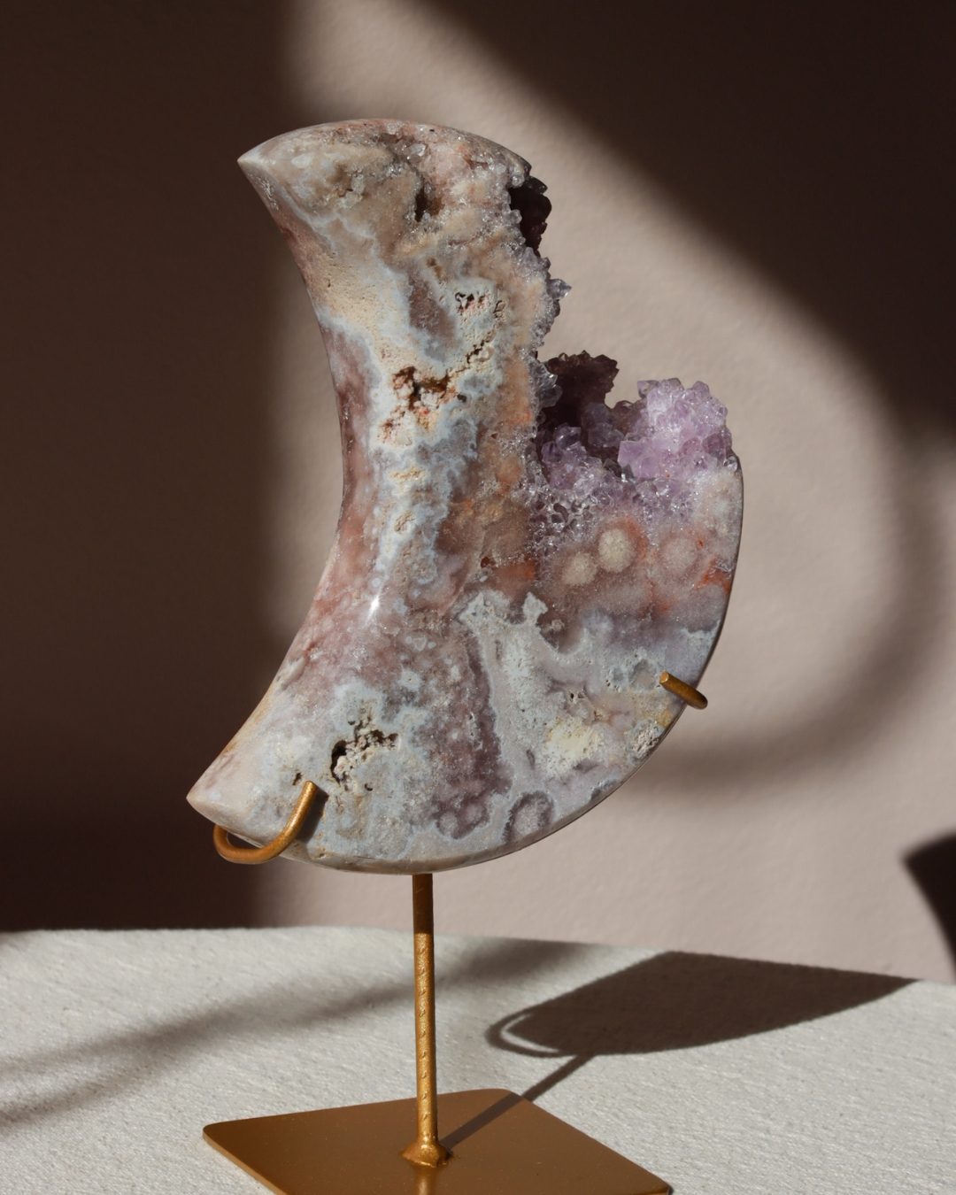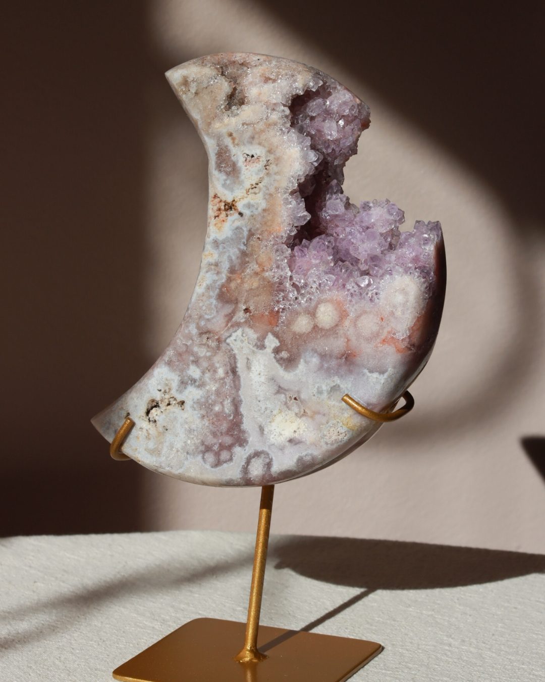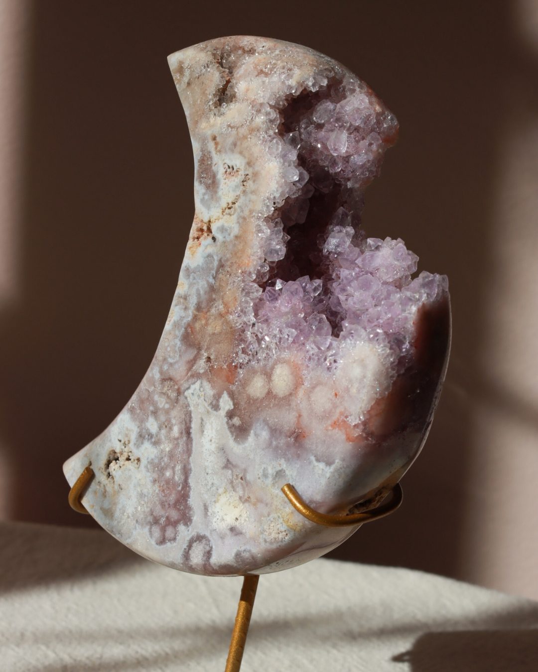 Prachtige roze amethist maan met dieproze kleuren en glinsterende geode.