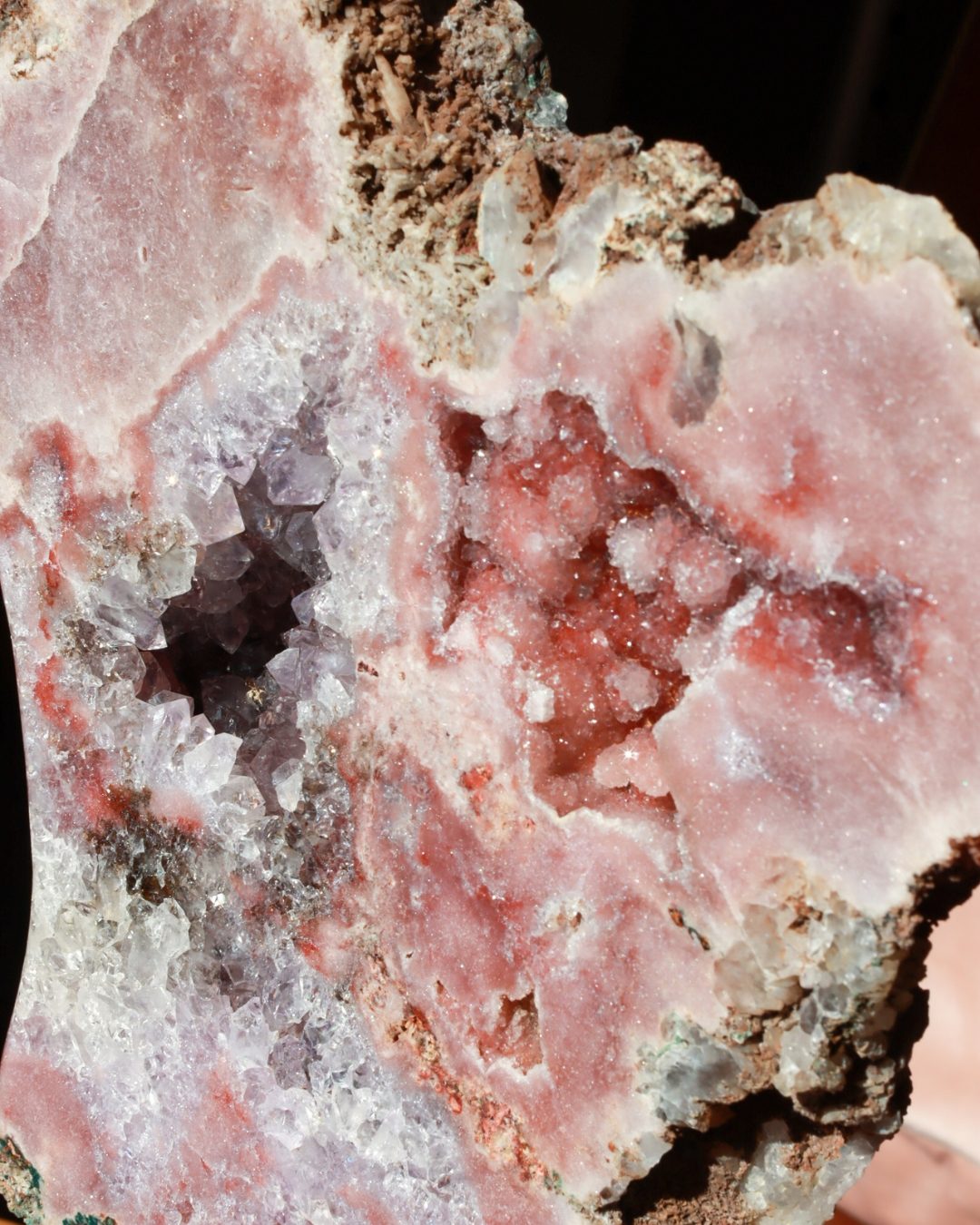 Deze prachtige roze amethist slab is een echt statement piece dat de kunst van de natuur laat zien. De buitenste laag van natuurlijk gesteente omhult een binnenkant die opengaat en een adembenemende weergave van heldere kwartskristallen onthult, afgewisseld met delicate roze amethistformaties.