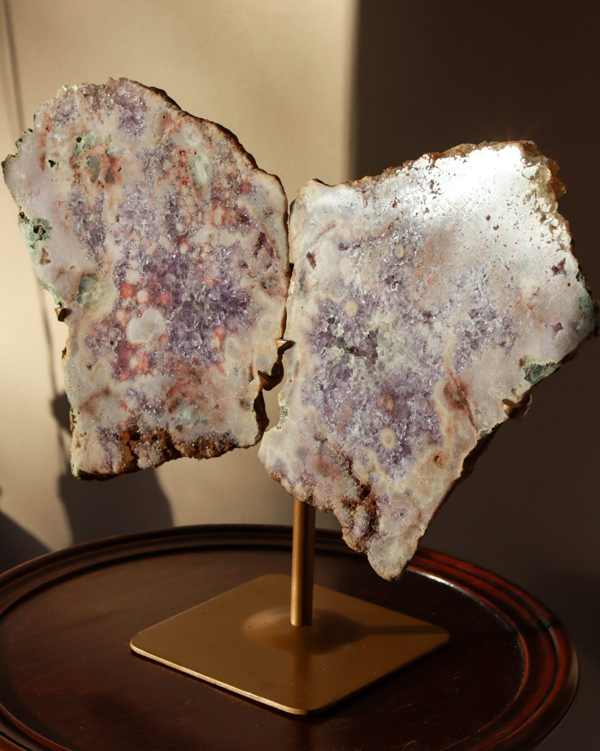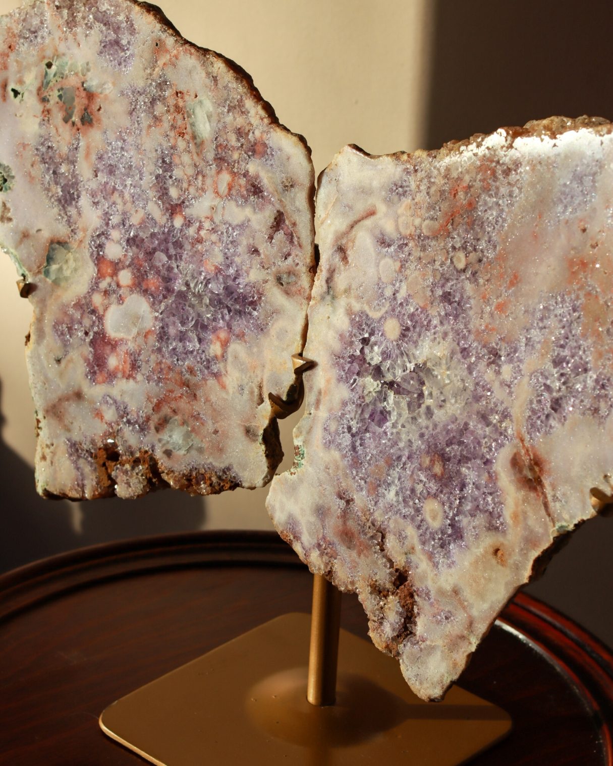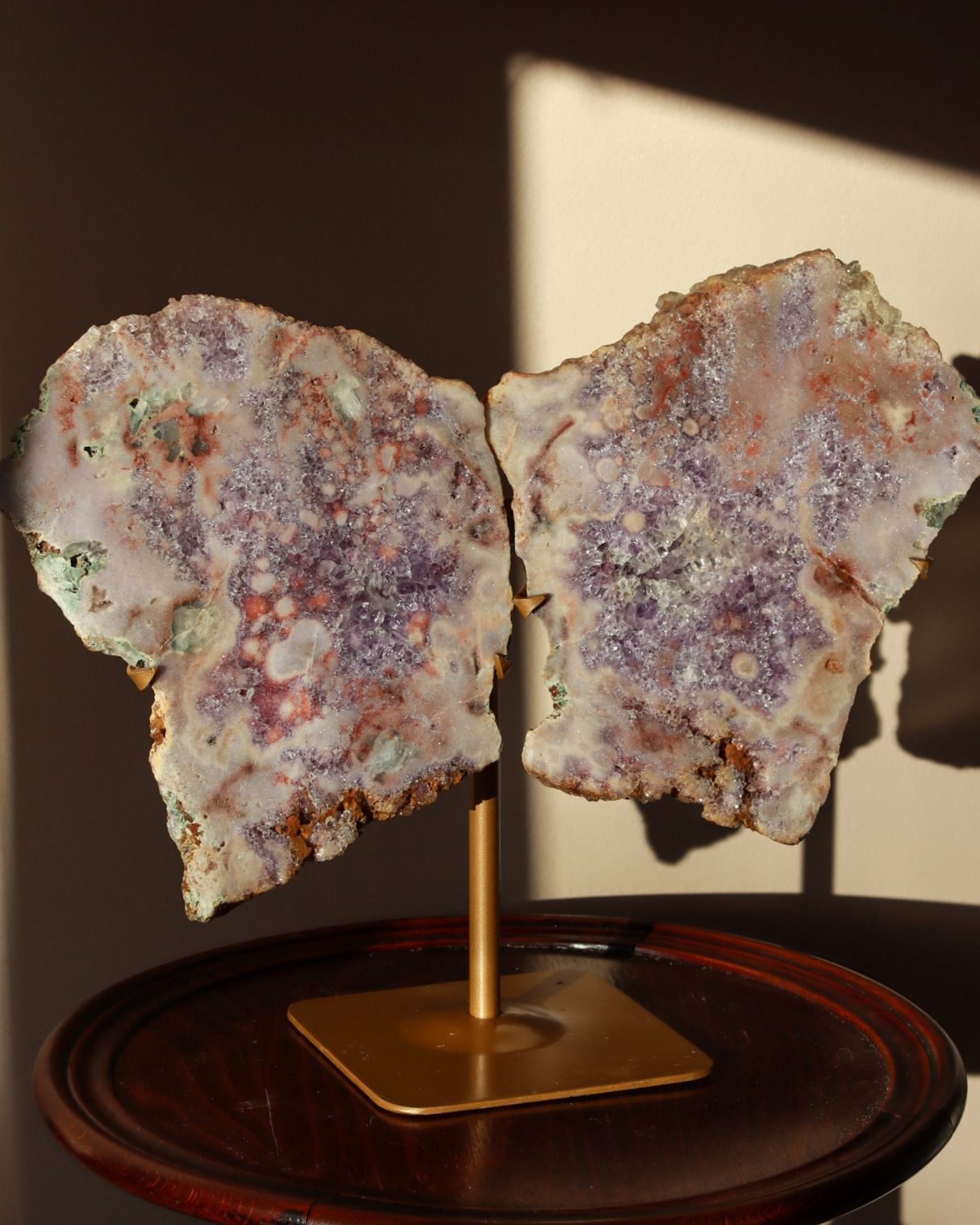 Betoverende roze amethist slabs in de vorm van vlindervleugels. De zachtroze en paarse tinten komen prachtig samen met natuurlijke accenten van rood en aardse tinten. Dit geeft het een werkelijk unieke uitstraling. De complexe druzy details vangen het licht, waardoor dit een opvallend statement piece is voor je collectie en interieur.