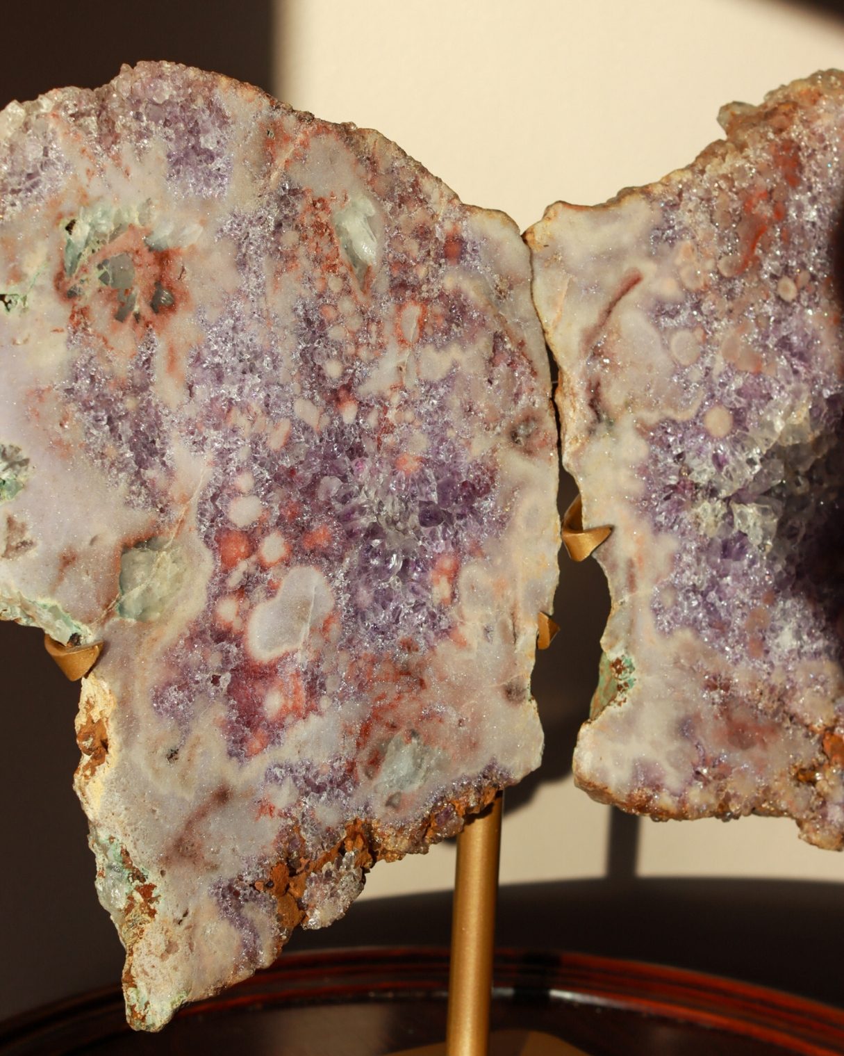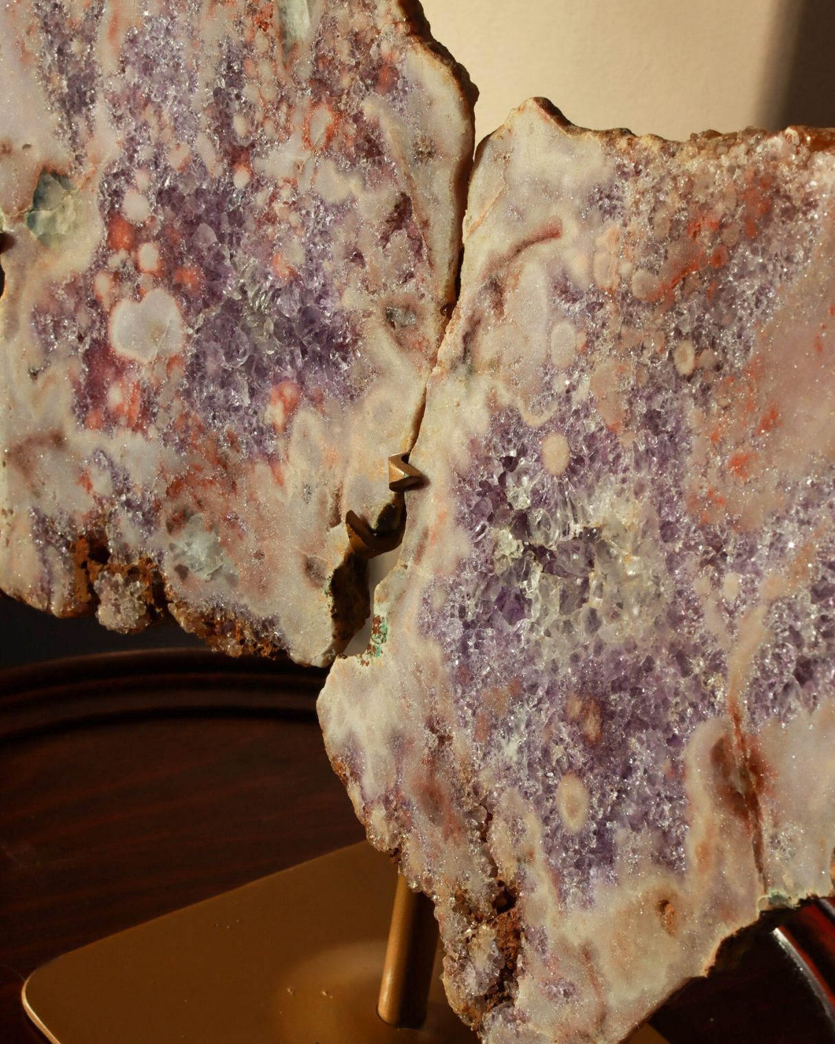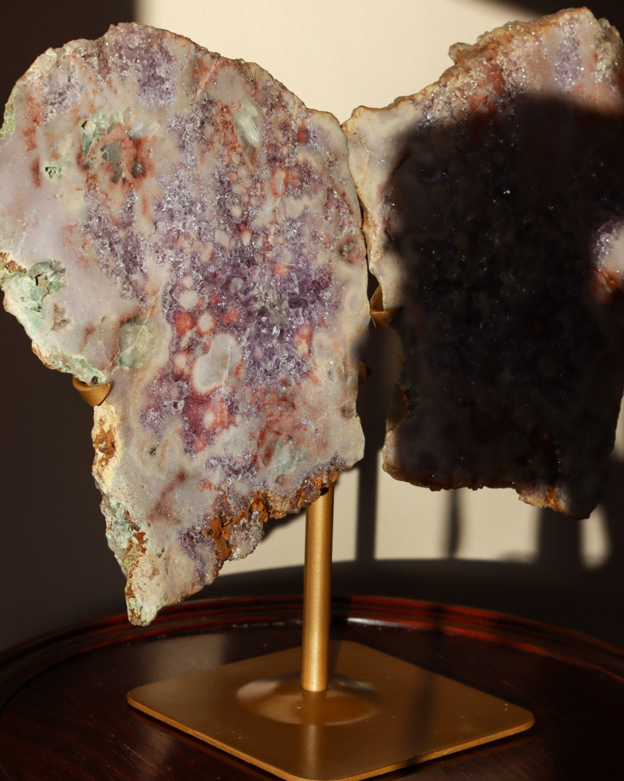 Betoverende roze amethist slabs in de vorm van vlindervleugels. De zachtroze en paarse tinten komen prachtig samen met natuurlijke accenten van rood en aardse tinten. Dit geeft het een werkelijk unieke uitstraling. De complexe druzy details vangen het licht, waardoor dit een opvallend statement piece is voor je collectie en interieur.