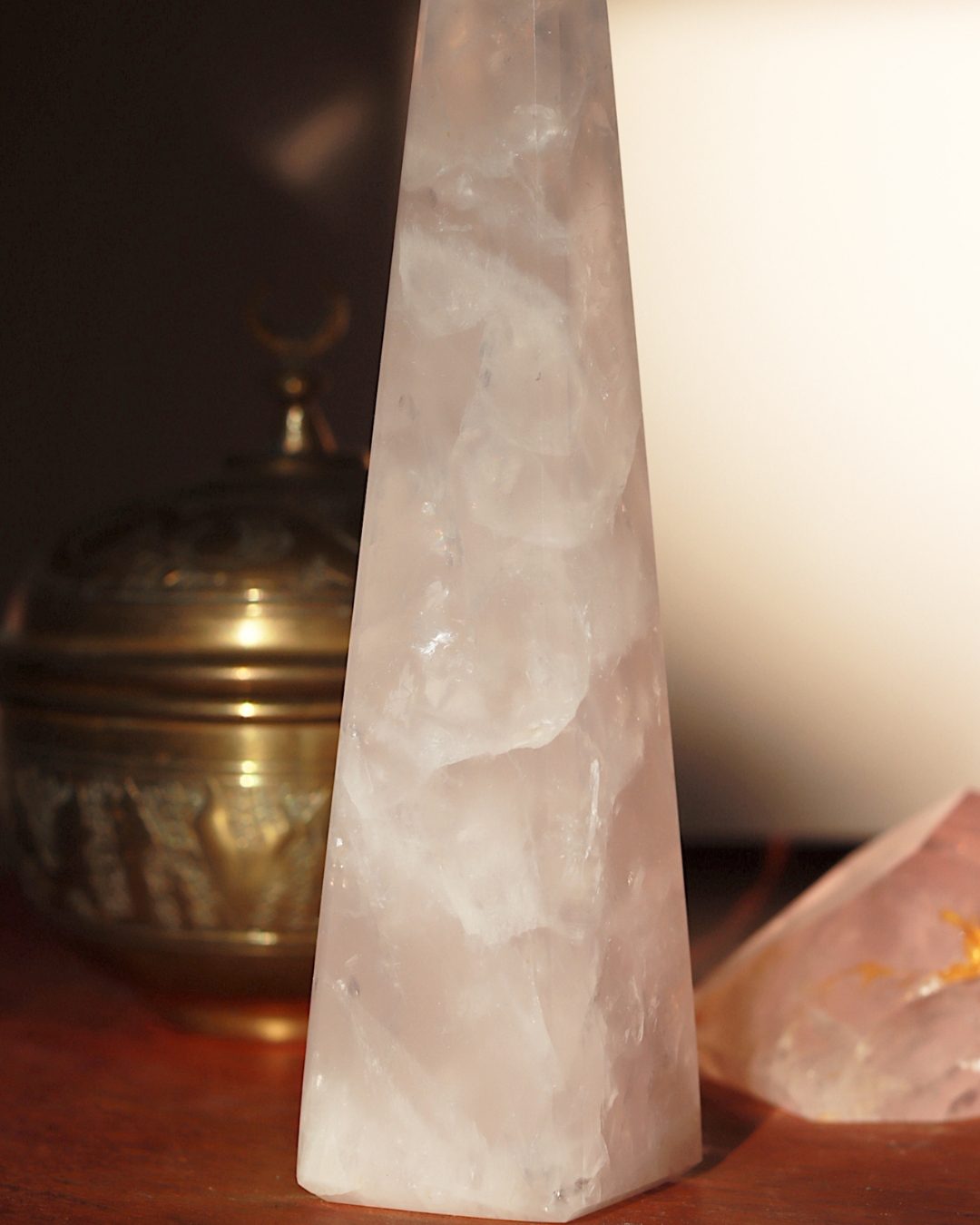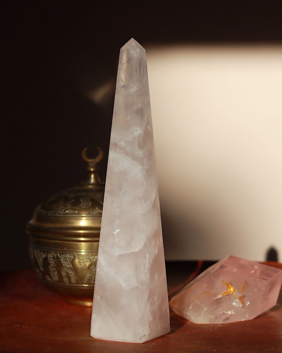Prachtige rozenkwarts toren van heldere kwaliteit. Rozenkwarts is een geliefde edelsteen die bekend staat om haar zachte, roze kleur en kalmerende energie. Deze steen behoort tot de kwartsfamilie en ontleent haar kleur aan sporen van titanium, ijzer of mangaan. Rozenkwarts wordt vaak geassocieerd met liefde, harmonie en emotioneel welzijn, en is een populaire keuze voor wie meer verbinding en zelfliefde zoekt. Daarnaast vormt rozenkwarts samen met amethist en bergkristal de beruchte gouden driehoek.